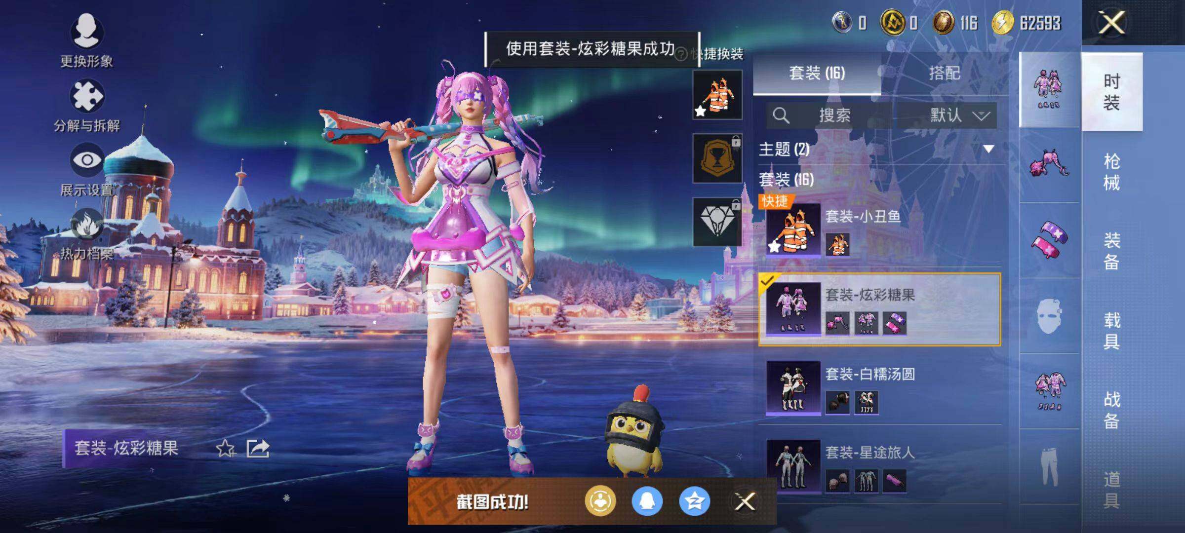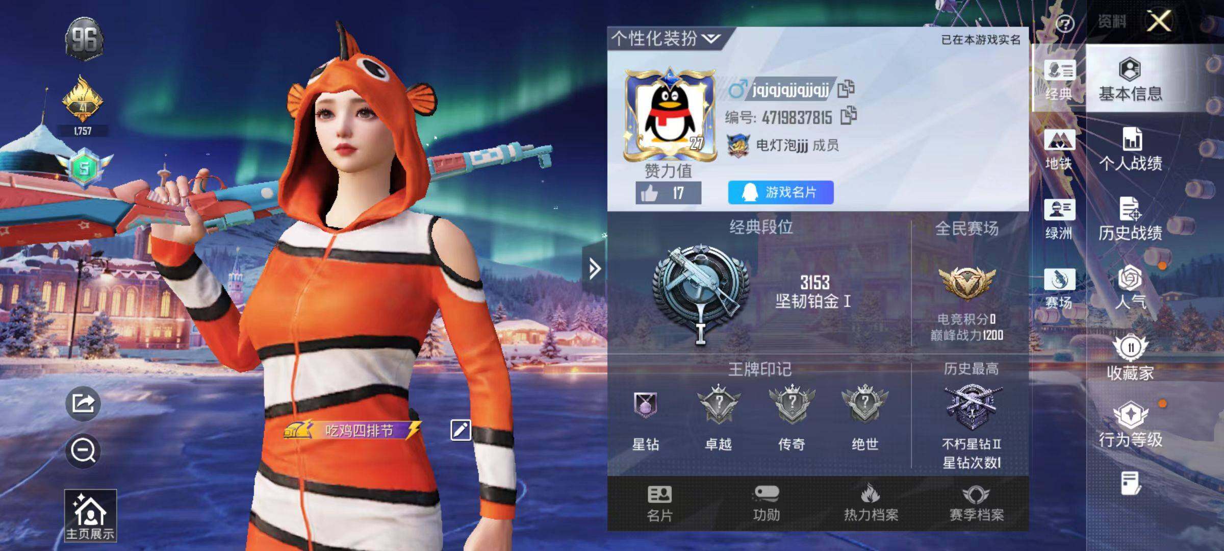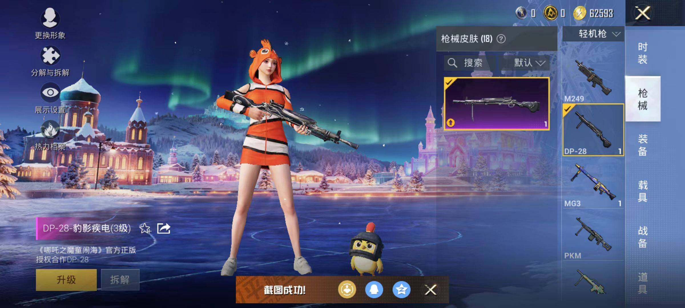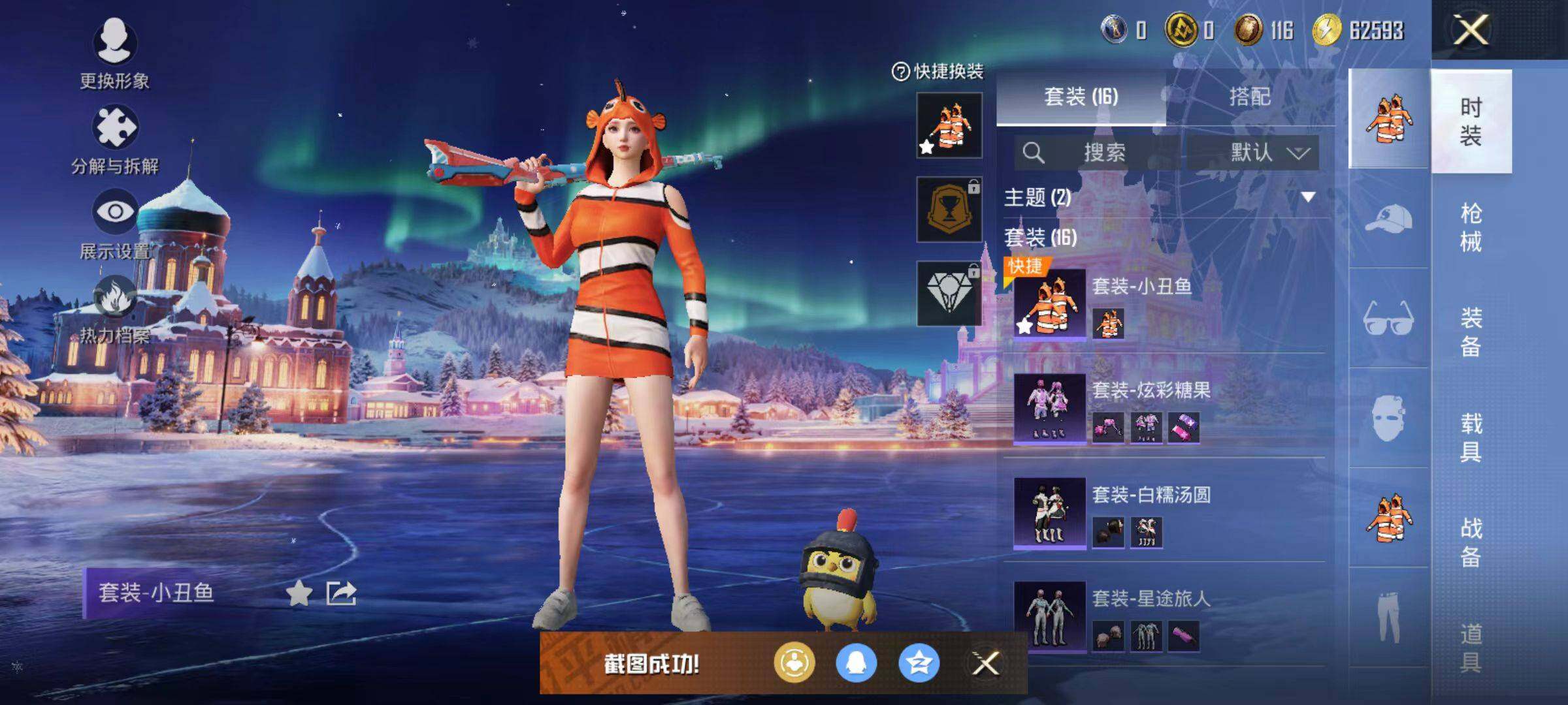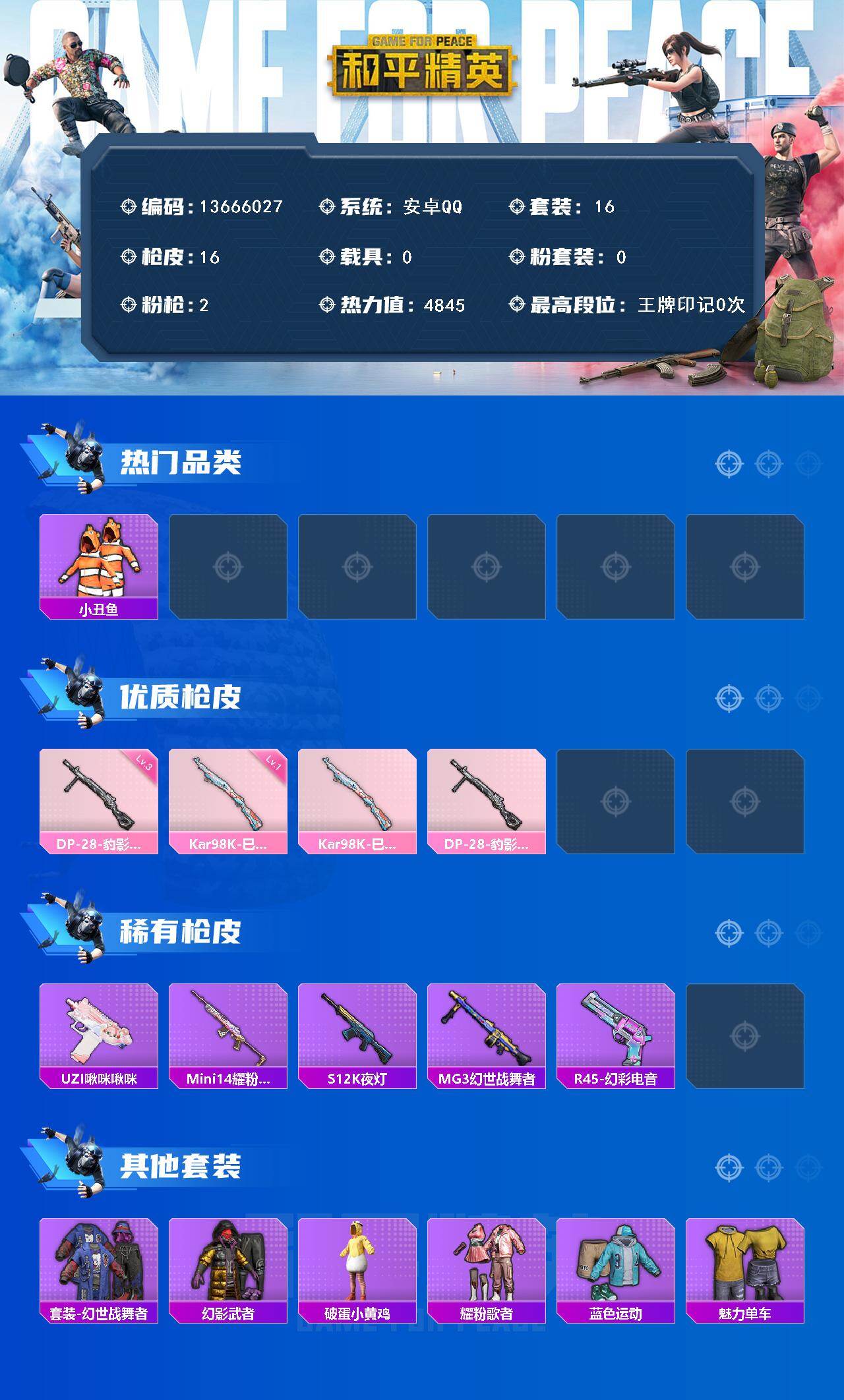 16套装/枪械2/装备19/战备19/热力值4845/一级Kar98K-巳巳如意/三级DP-28-豹影疾电/小丑鱼/Kar98K-巳巳如意/DP-28-豹影疾电/炫彩糖果降落伞/套装-炫彩糖果/AUG-冰晶雪宝/UZI-啾咪啾咪/Mini14-耀粉歌者/S12K-夜灯/MG3-幻世战舞者/R45-幻彩电音/幻世战舞者/幻影武者/破蛋小黄鸡/耀粉歌者/蓝色运动/魅力单车