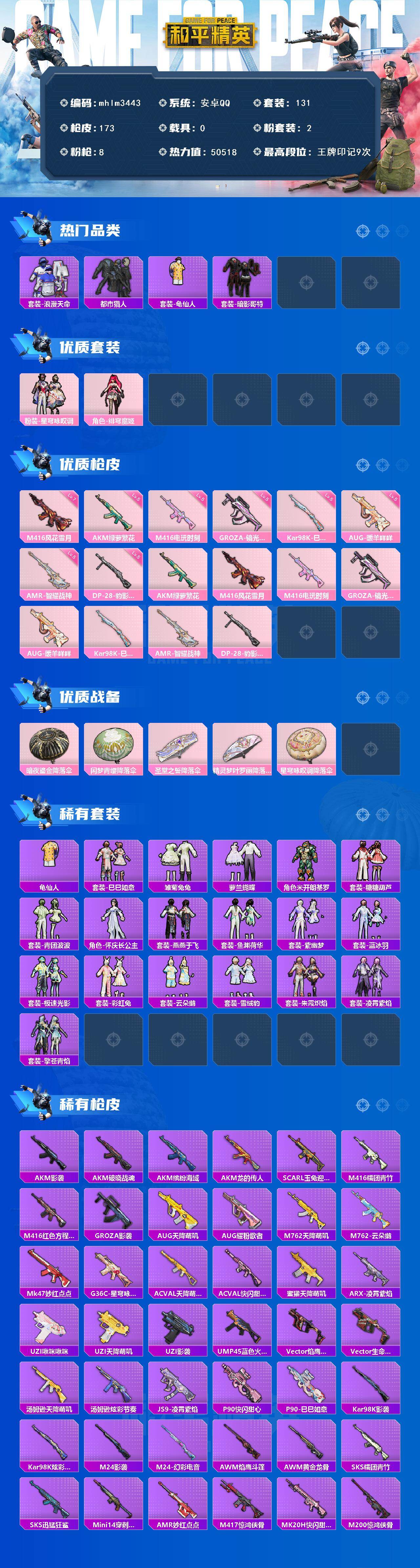 【mhlm3443】安卓 手Q-2粉装-8特效枪-0载具-1粉色飞行器-50518热力值-9王牌印记-131套装-173枪皮