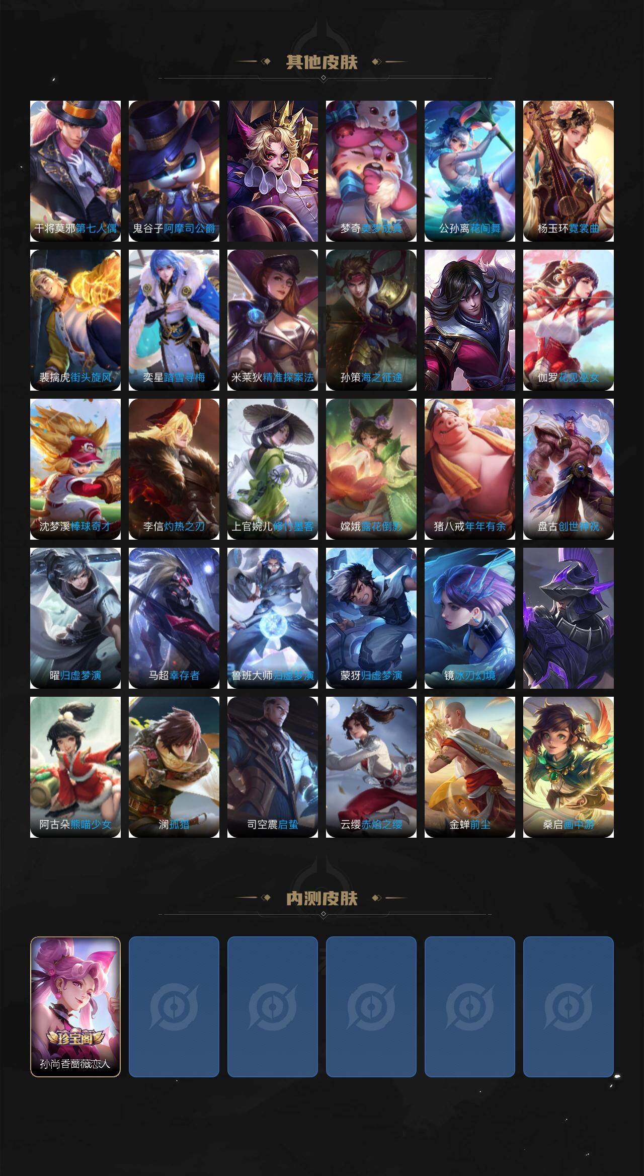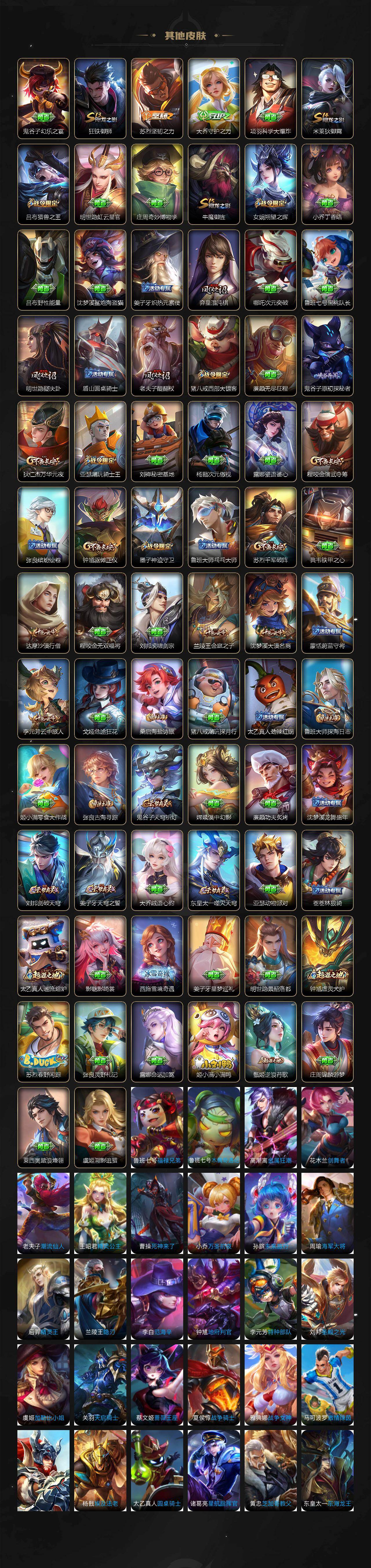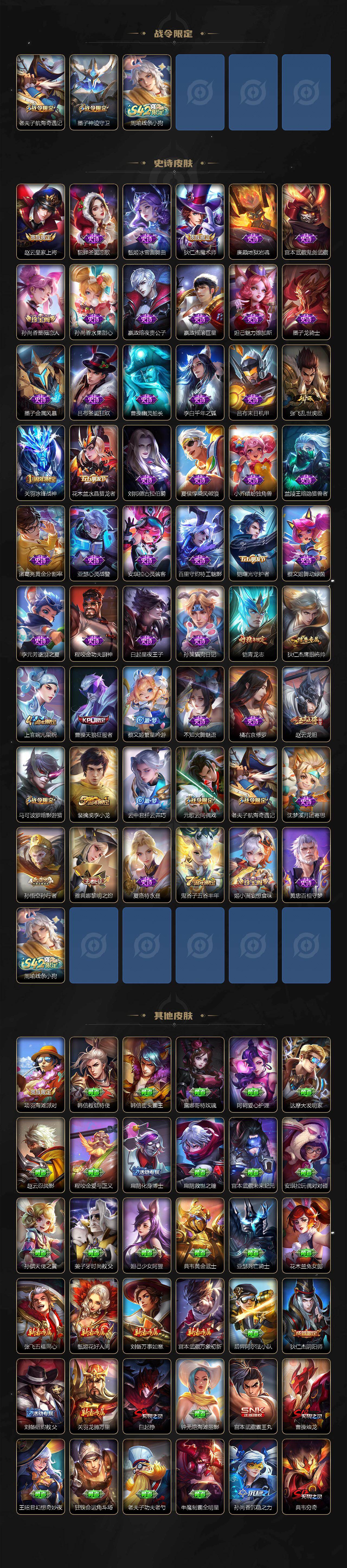 【限定皮肤】:白起狰,大乔绒语心约,姜子牙天穹之誓,狄仁杰阴阳师,赵云皇家上将,赵云龙胆,墨子神迹守卫,孙尚香蔷薇恋人,吕布猎兽之王,元歌云间偶戏,曹操烛龙,曹操天狼征服者,典韦穷奇,马可波罗暗影游猎,狄仁杰魔术师