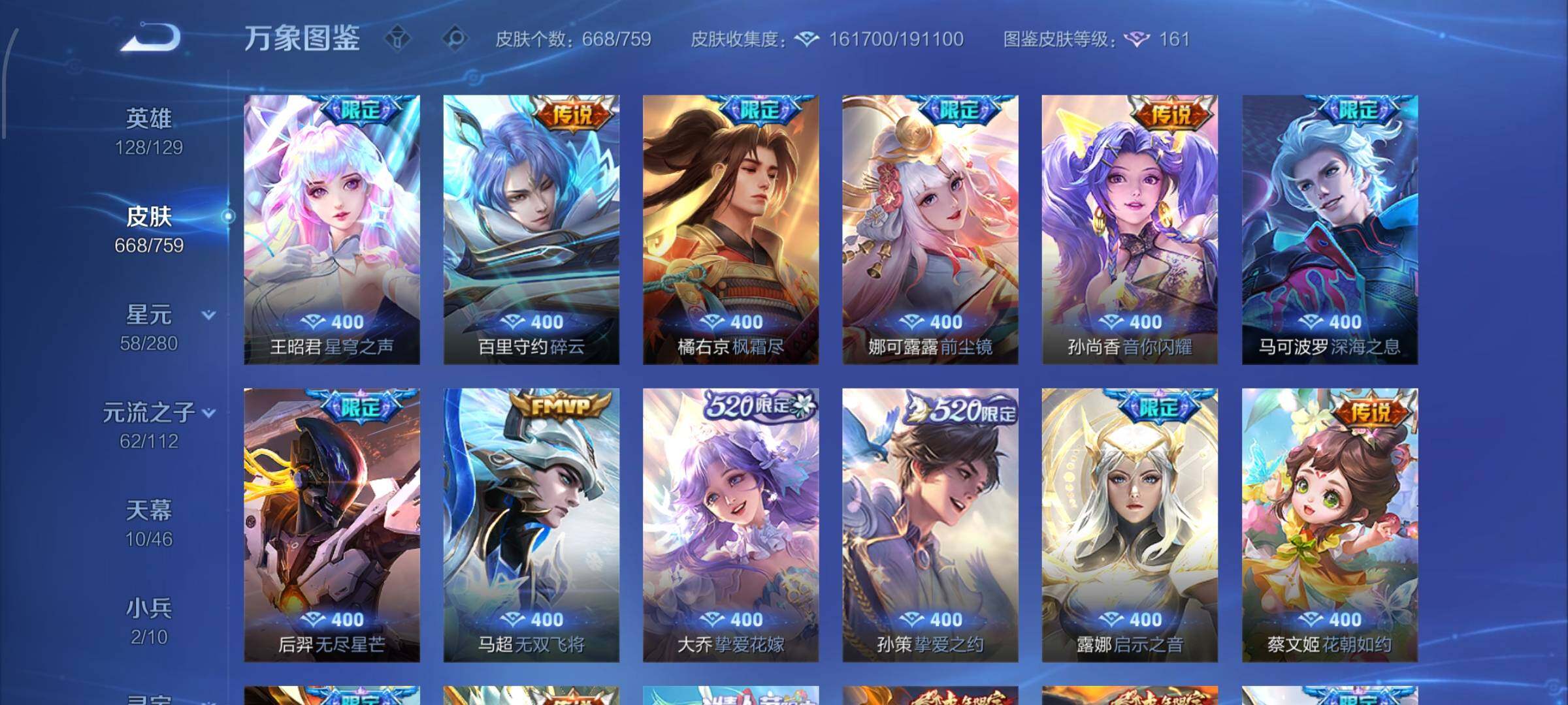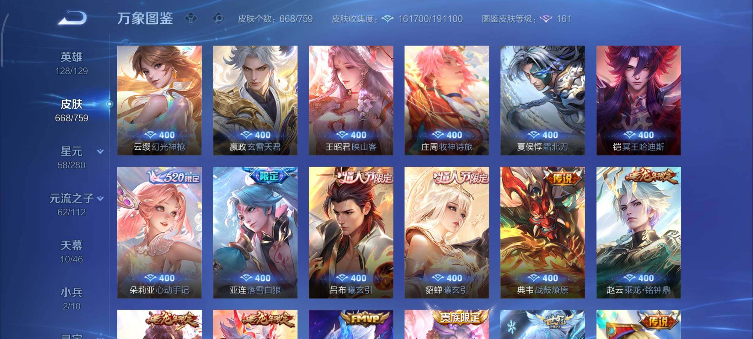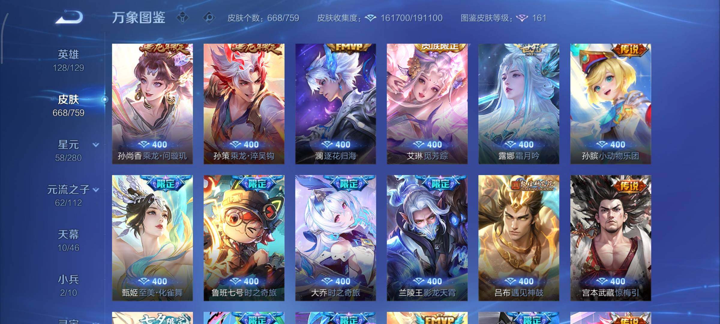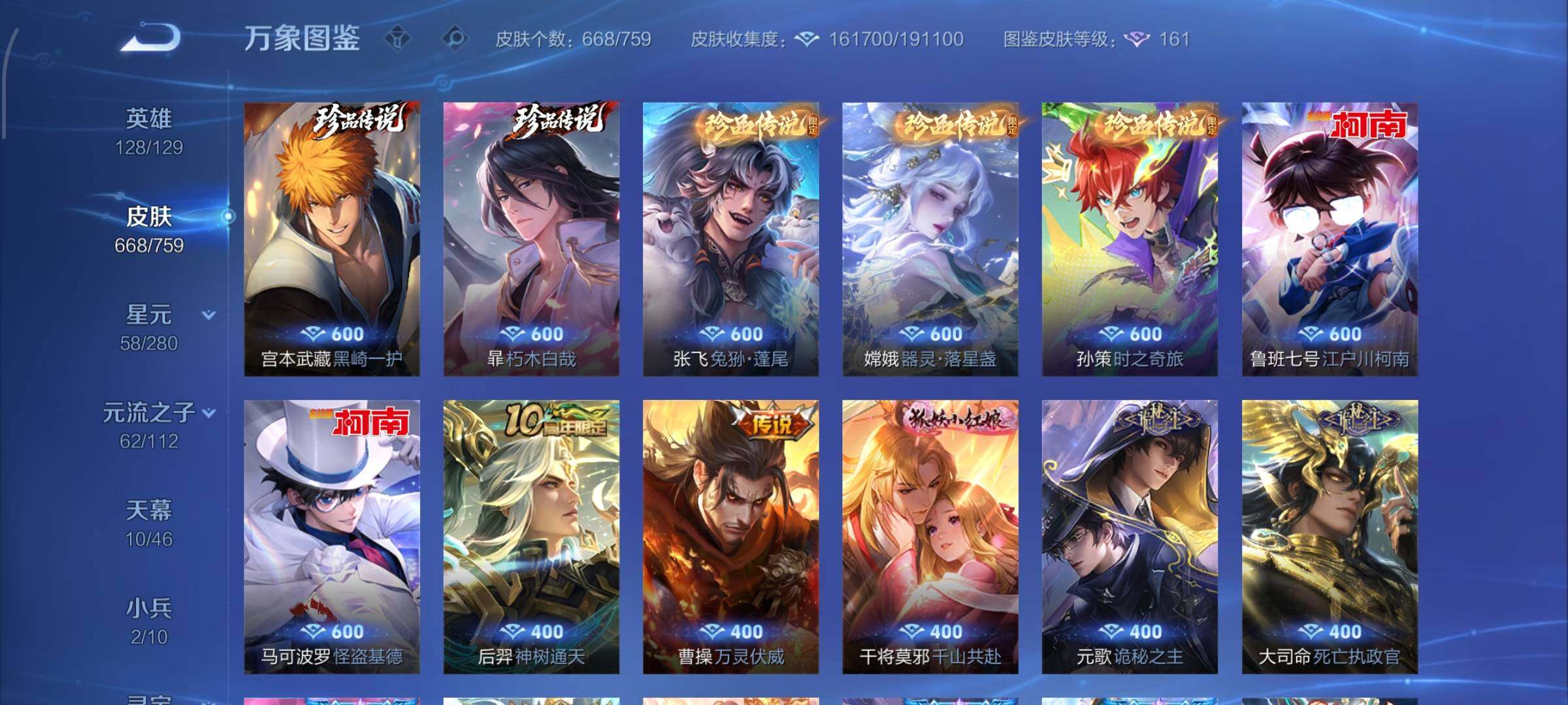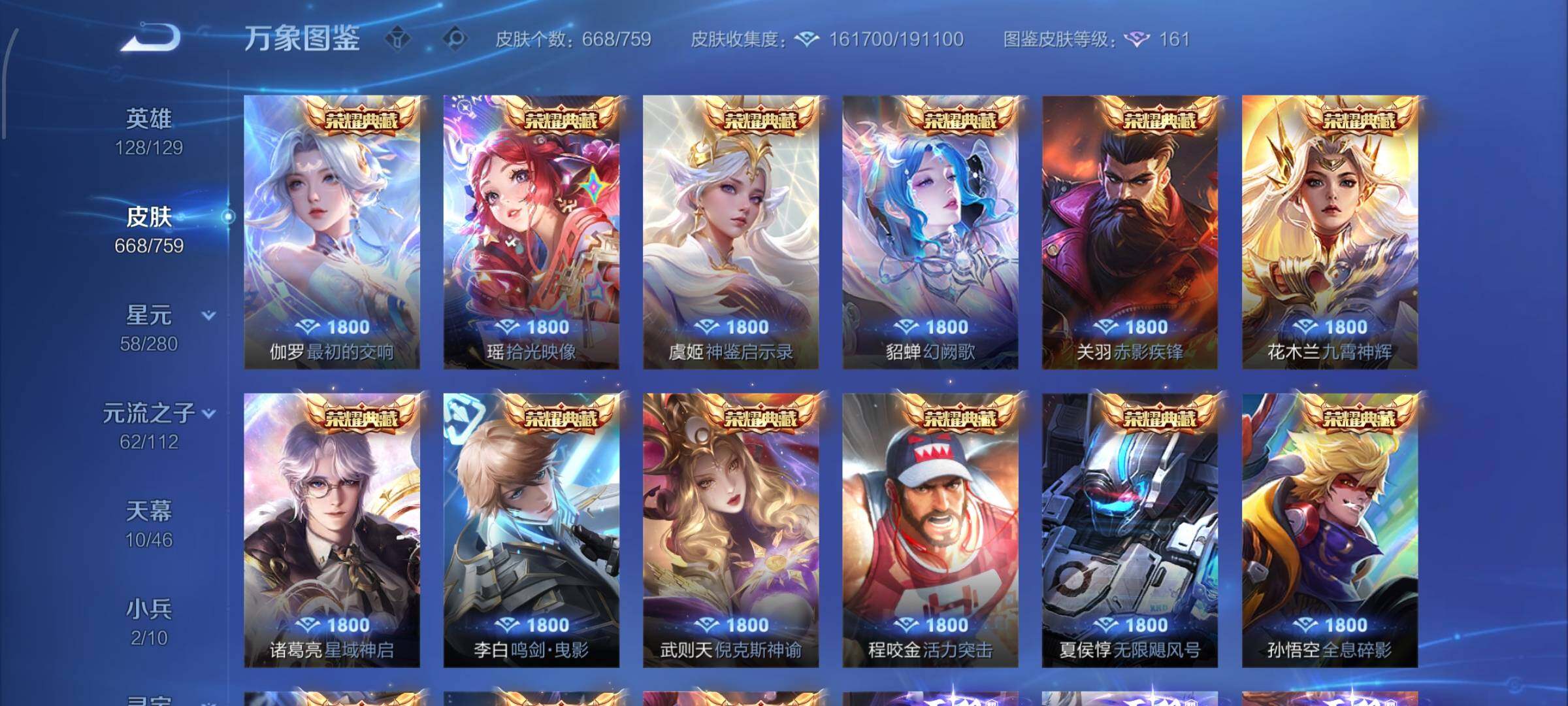 【精氪荣耀贵族v12·连续在榜4个月·13.4流光积分·小兵赞萌露比·小兵狐妖小红娘·11星传说·紫瑶·岁雨灵司·玉鸾吟·10天幕·黑崎一护天幕·财神纳福天幕·缺2满年限皮·16典藏·9无双·7珍品·121传说·全皮诸葛亮·全皮马可波罗·全皮后羿·全皮鲁班七号·全皮伽罗·全皮西施·全皮大乔·全皮蔡文姬·全皮杨玉环·全皮露娜·全皮孙策·全皮关羽·全皮花木兰·全皮曜·