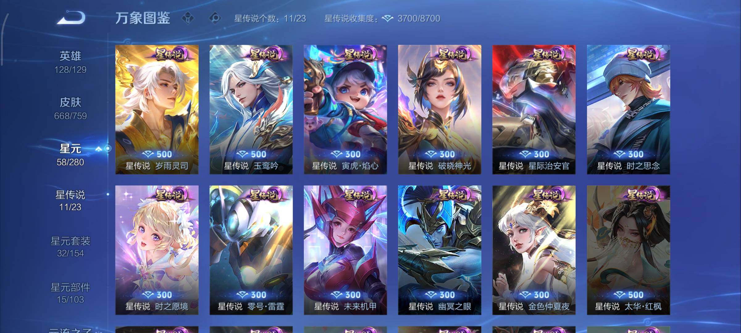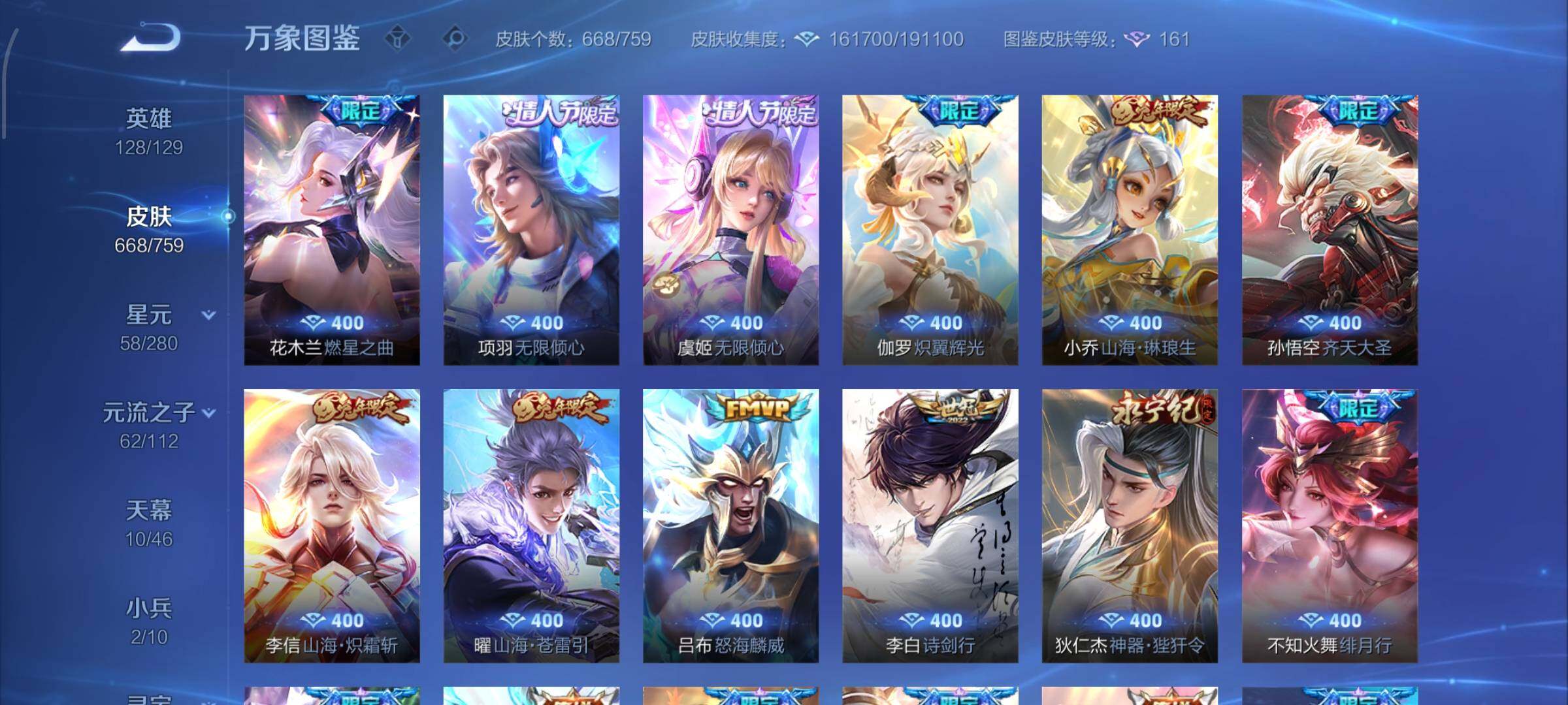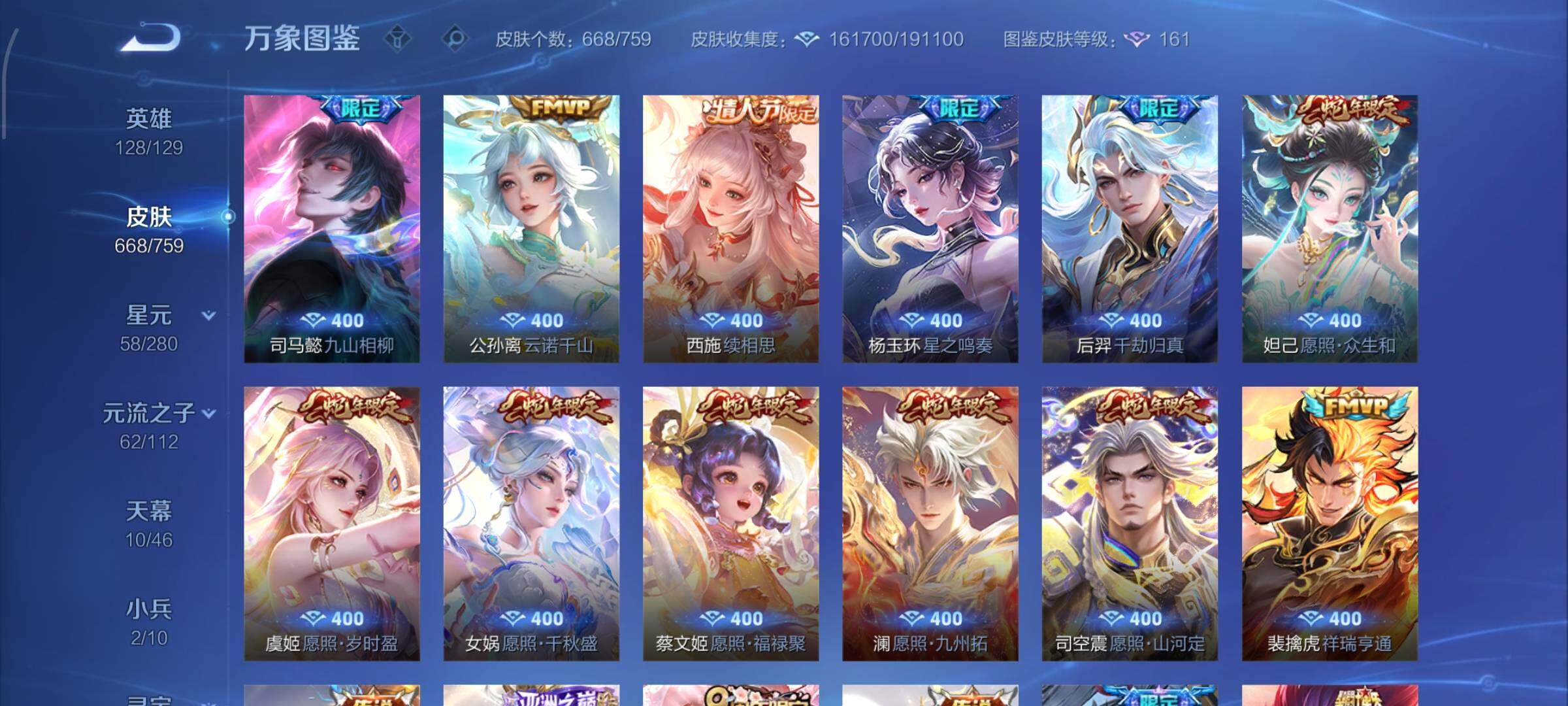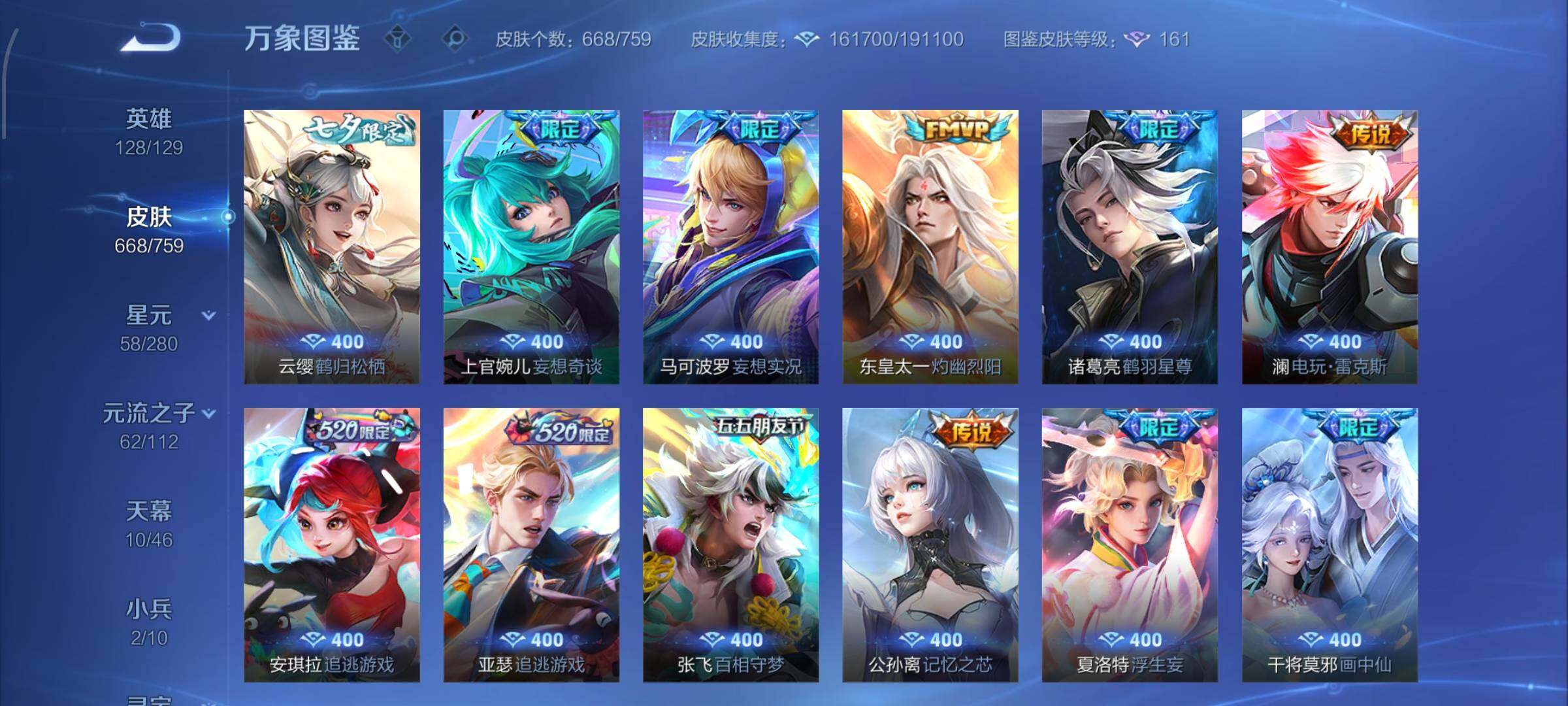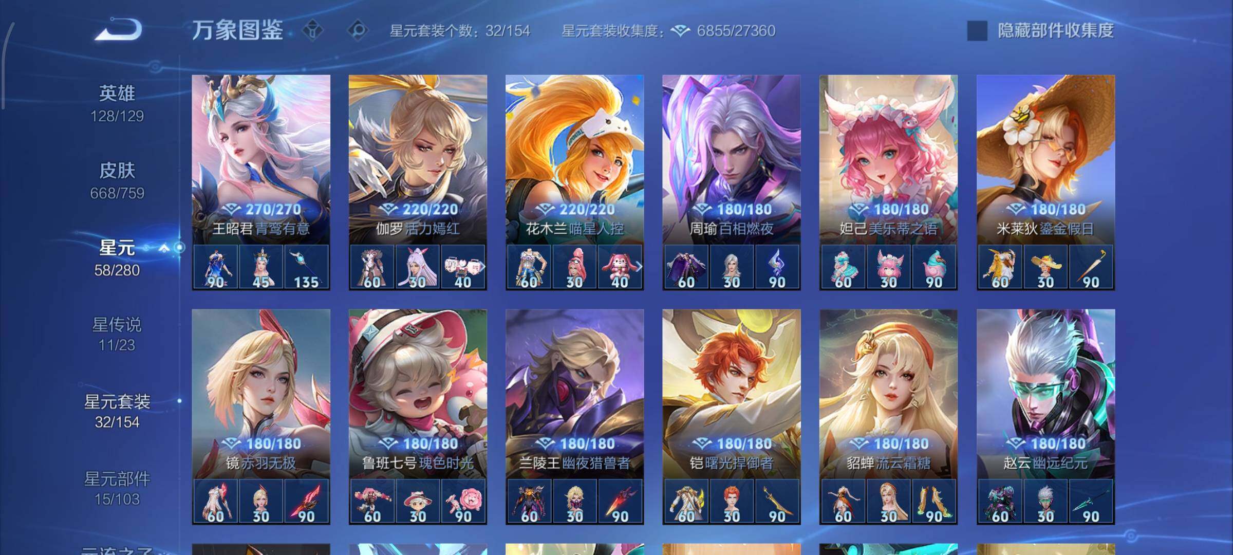 【精氪荣耀贵族v12·连续在榜4个月·13.4流光积分·小兵赞萌露比·小兵狐妖小红娘·11星传说·紫瑶·岁雨灵司·玉鸾吟·10天幕·黑崎一护天幕·财神纳福天幕·缺2满年限皮·16典藏·9无双·7珍品·121传说·全皮诸葛亮·全皮马可波罗·全皮后羿·全皮鲁班七号·全皮伽罗·全皮西施·全皮大乔·全皮蔡文姬·全皮杨玉环·全皮露娜·全皮孙策·全皮关羽·全皮花木兰·全皮曜·