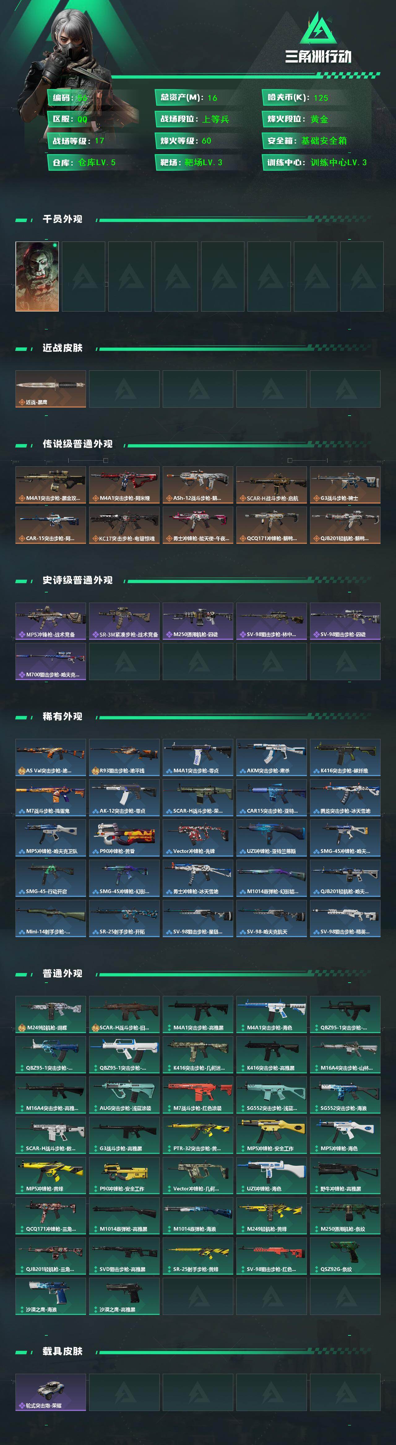【传说外观】:M4A1突击步枪-蚀金玫瑰,M4A1突击步枪-阿米娅,ASh-12战斗步枪-鹅鸭杀,SCAR-H战斗步枪-启航,G3战斗步枪-骑士,CAR-15突击步枪-阿米娅,KC17突击步枪-电锯惊魂,勇士冲锋枪-能天使-午夜
