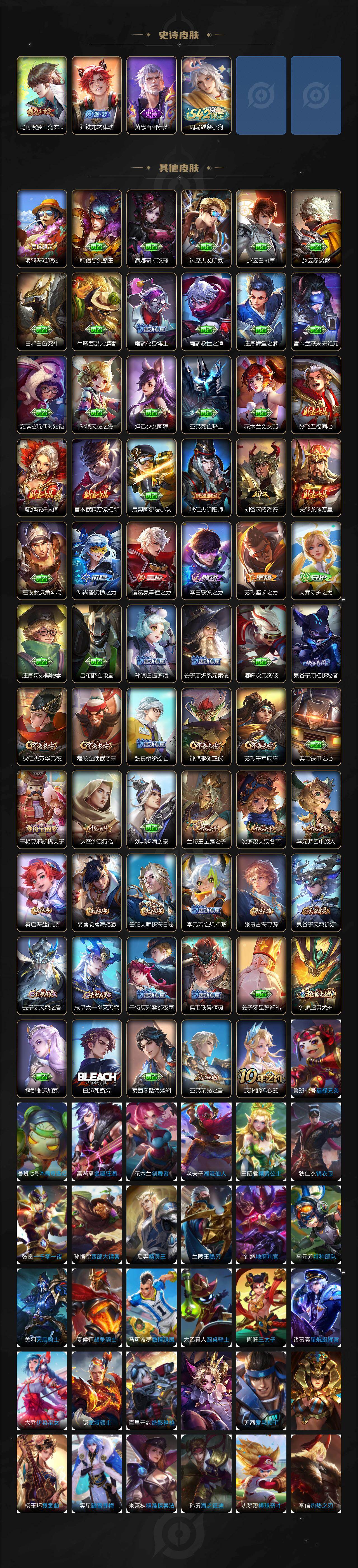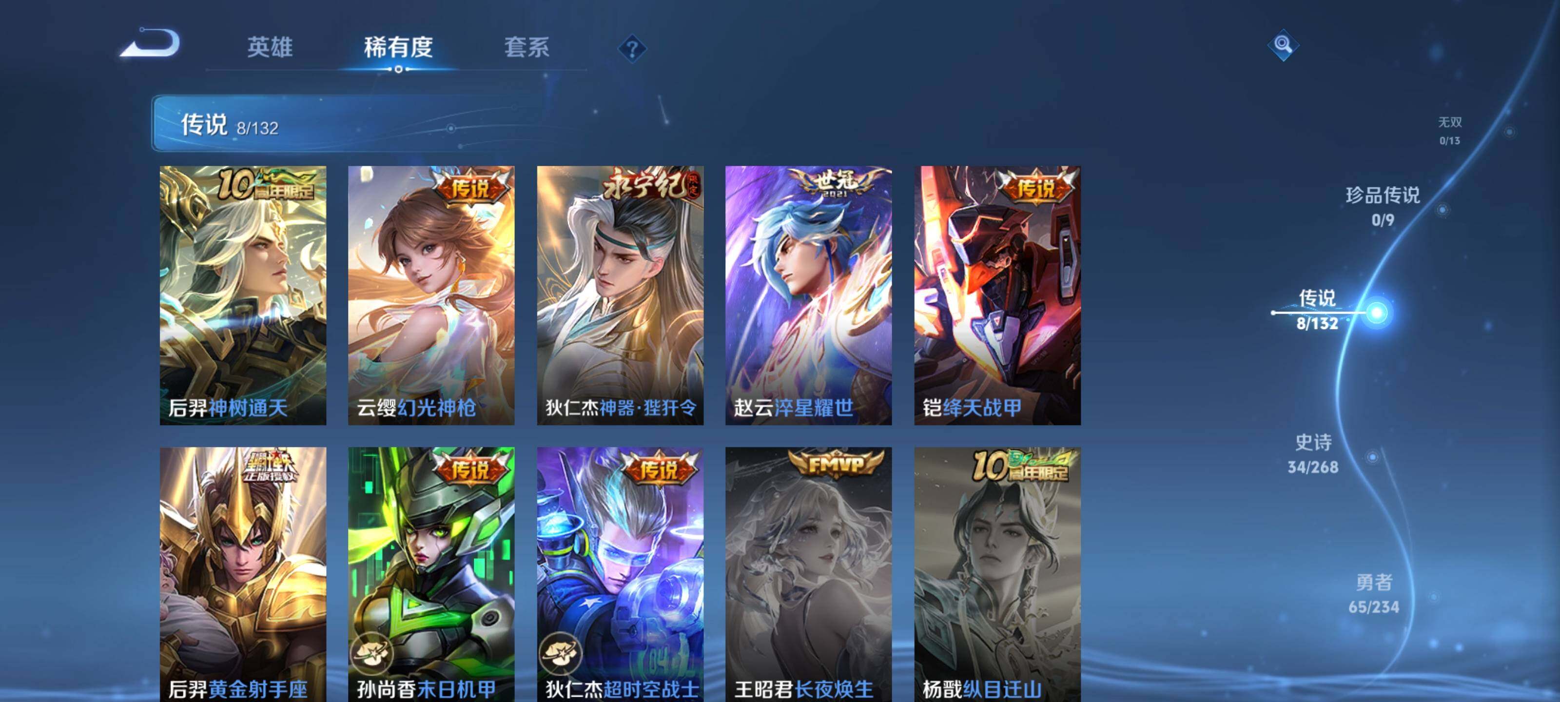 贵族7/皮肤148/传说8/史诗33/英雄122/后羿神树通天/