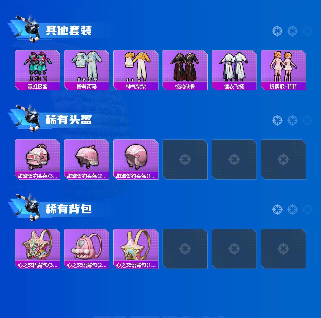 【粉色套装】:粉装-金曜白虎,粉装-蝶舞迷情,粉装-苍蓝魅影,粉装-翡翠骑士,粉装-蓝莓炮弹,角色-绯穹魔姬