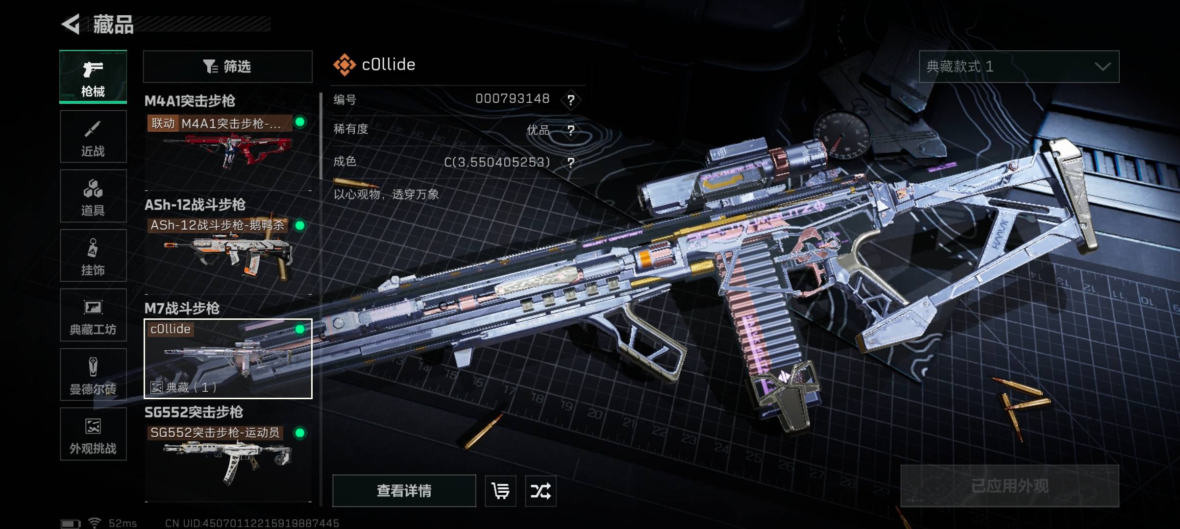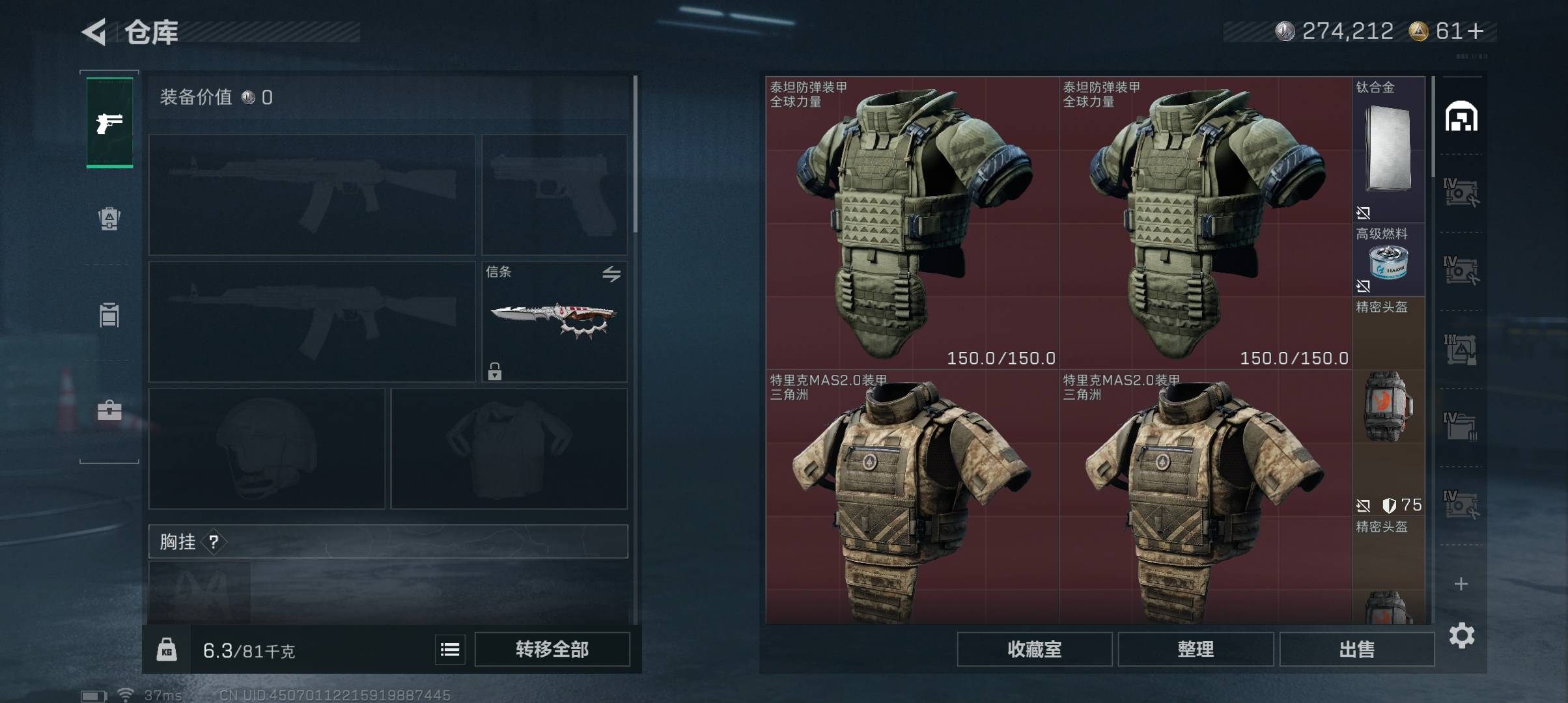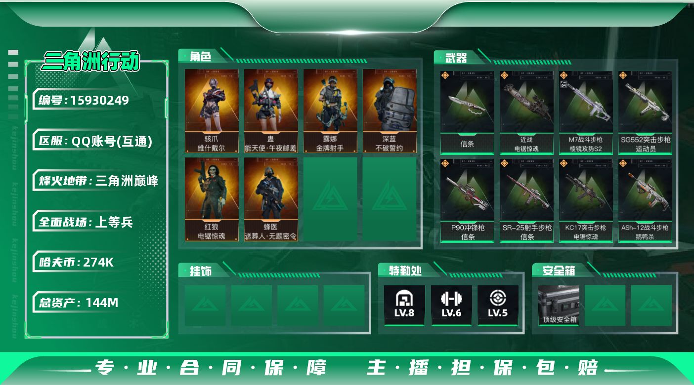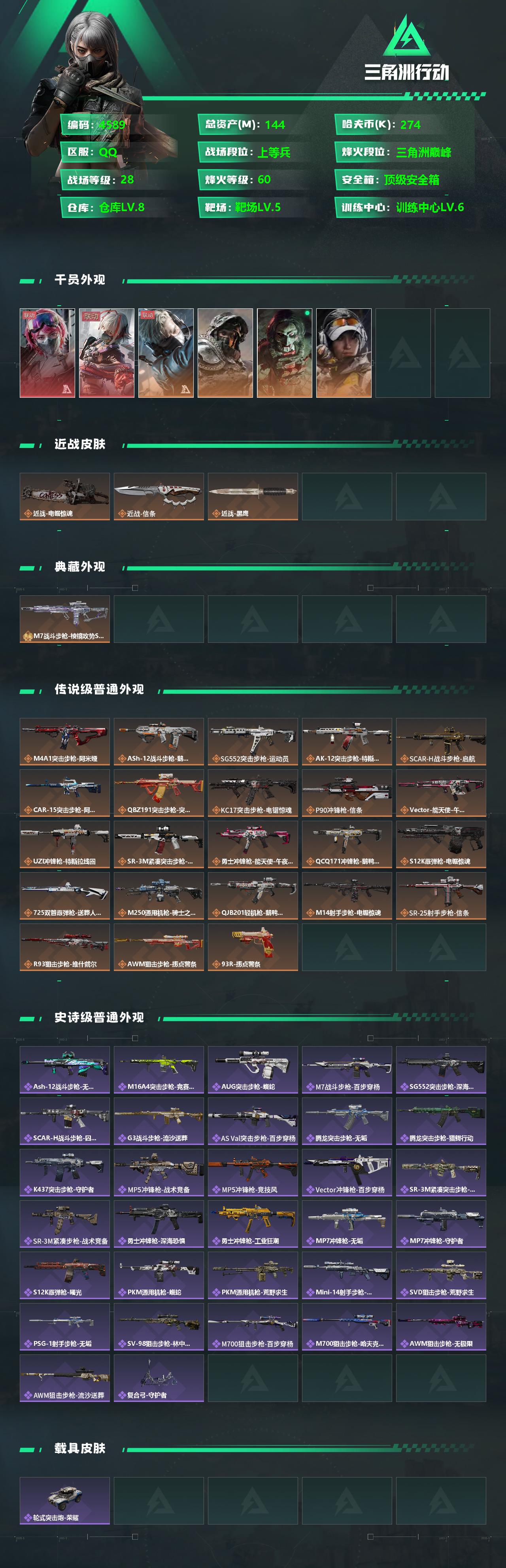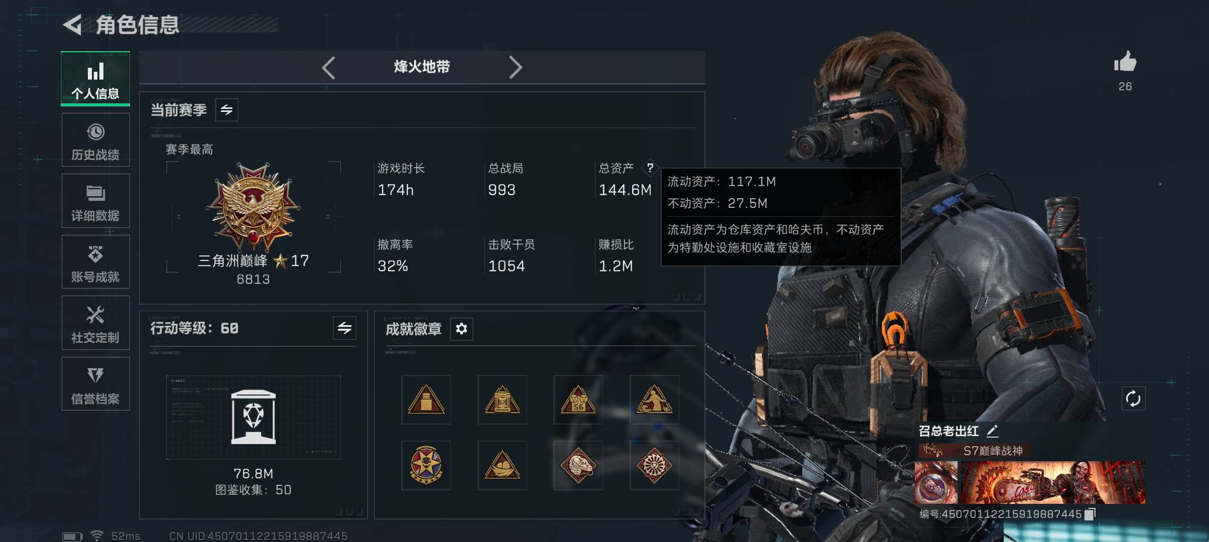 总资产144m 流动资产117m 哈夫币274k 2近战皮 6干员皮 1典藏枪皮 优品cM7战斗步枪