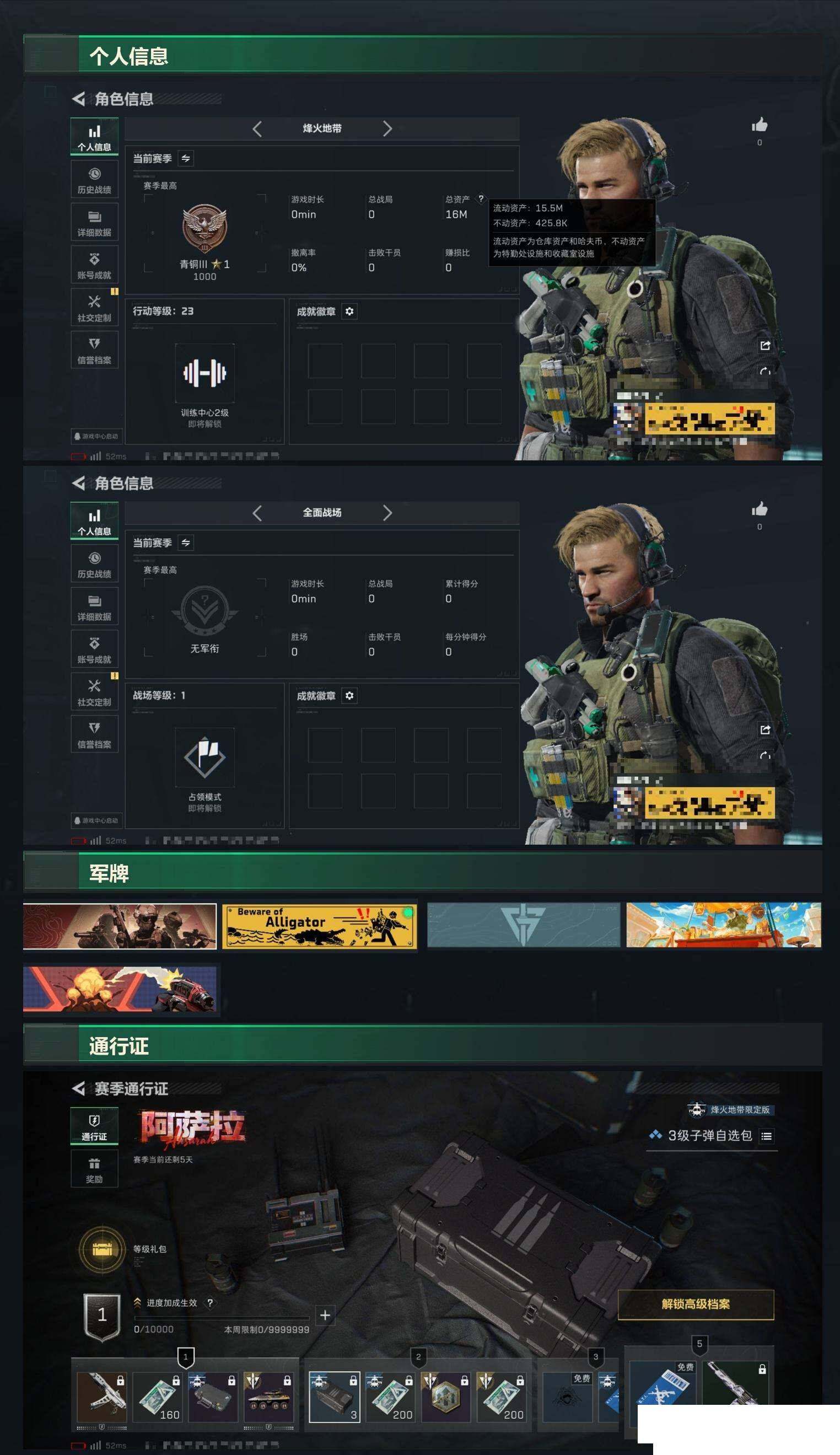 精品小号 烽火地带段位: 青铜 全面战场段位: 无段位 总资产: 15000000 哈夫币: 9904000