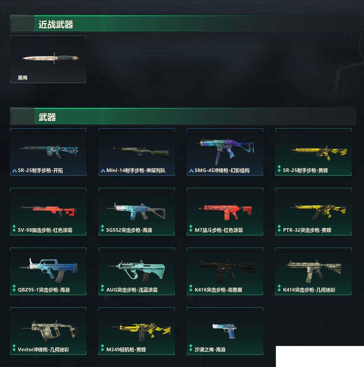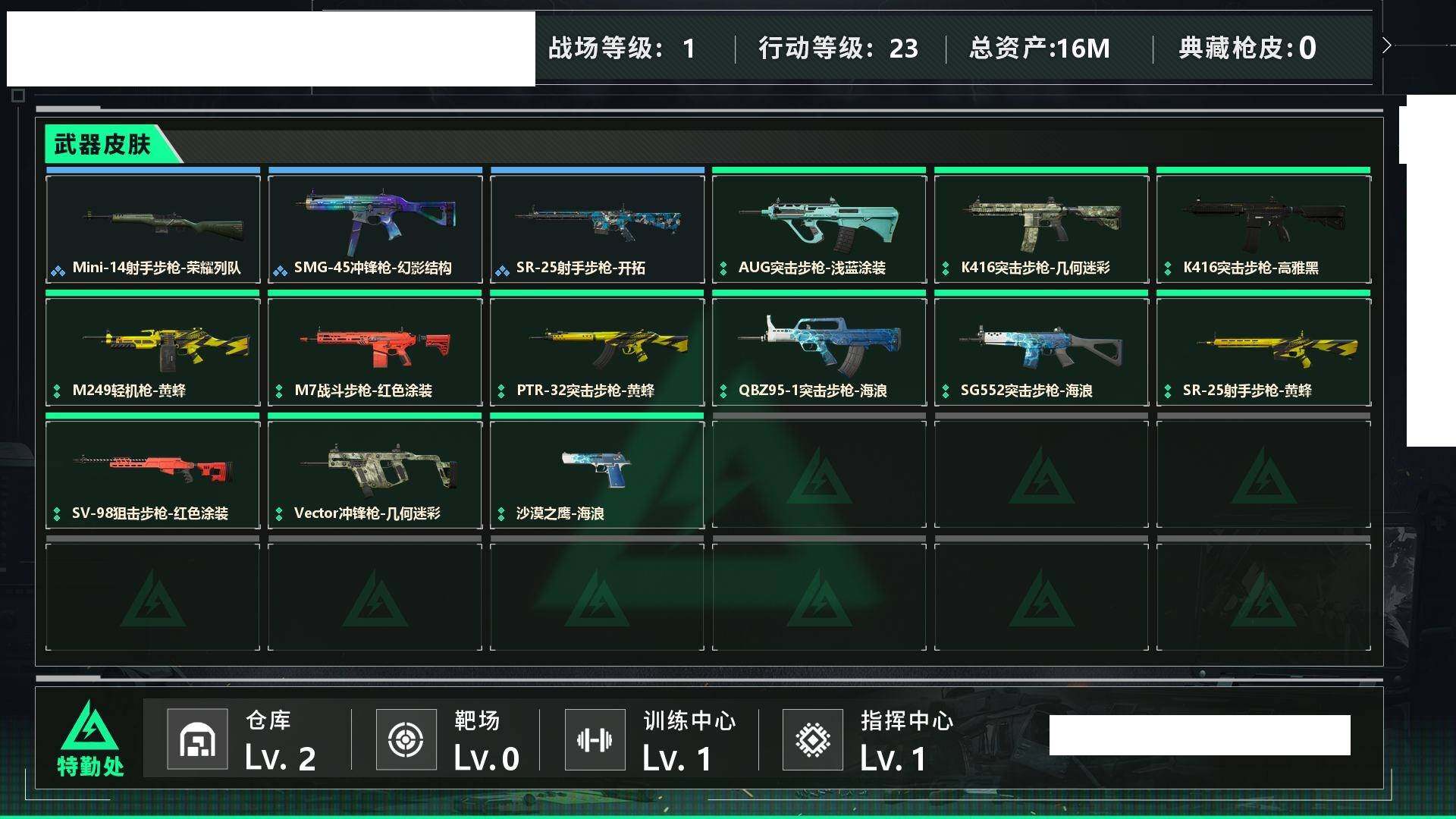 【sjs6094】精品小号 烽火地带段位: 青铜 全面战场段位: 无段位 总资产: 15000000 哈夫币: 9904000 sjs6094 亮点: 15m总资产-9904k哈伏币-23烽火等级-青铜-1战场等级-无军衔【近战皮肤】:近战-黑鹰【稀有外观】:SMG-45冲锋枪-幻影结构,Mini-14射手步枪-荣耀列队,SR-25射手步枪-开拓【普通外观】:QBZ95-1突击步枪-海浪,K416突击步枪-几何迷彩,K416突击步枪-高雅黑,AUG突击步枪-浅蓝涂装,M7战斗步枪-红色涂装,SG