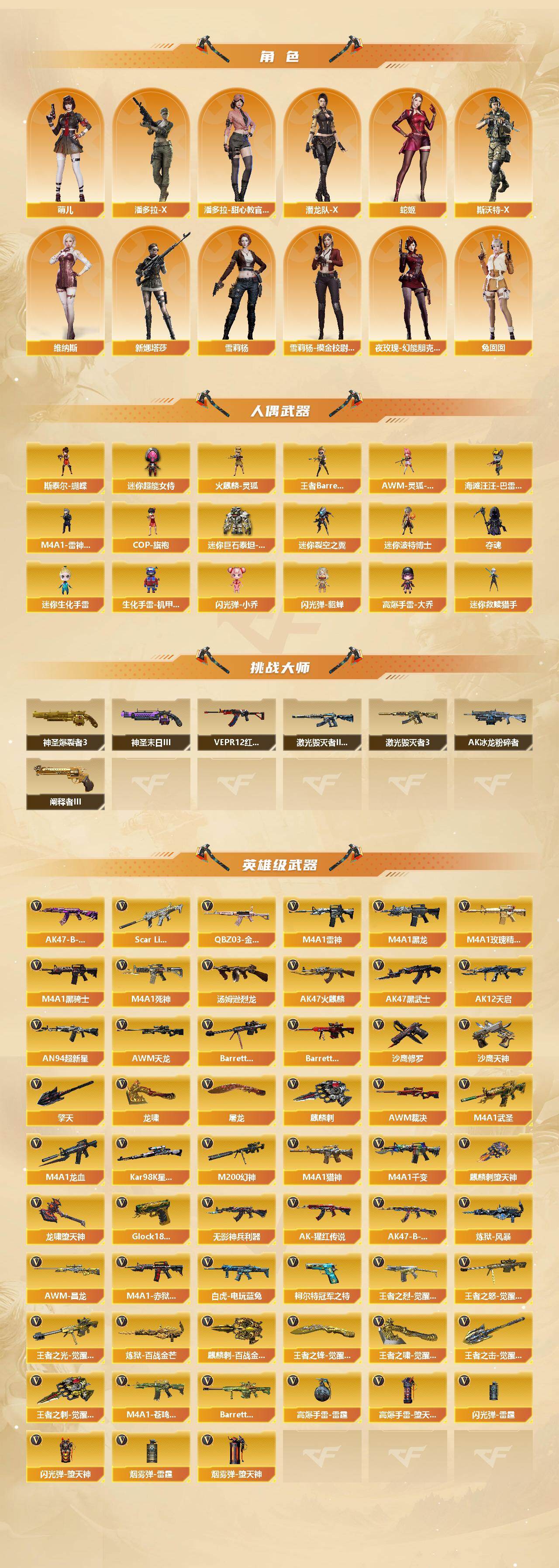 【热门武器】:QBZ03-金色蔷薇,Scar Light-白虎,M200-幻神,白虎-电玩蓝兔,柯尔特-冠军之特,Kar98K-星神,金色小号,M4A1-黑骑士,汤姆逊-烈龙*2,斯泰尔-蝴蝶,沙鹰-修罗*3,Knife-冠军之刃