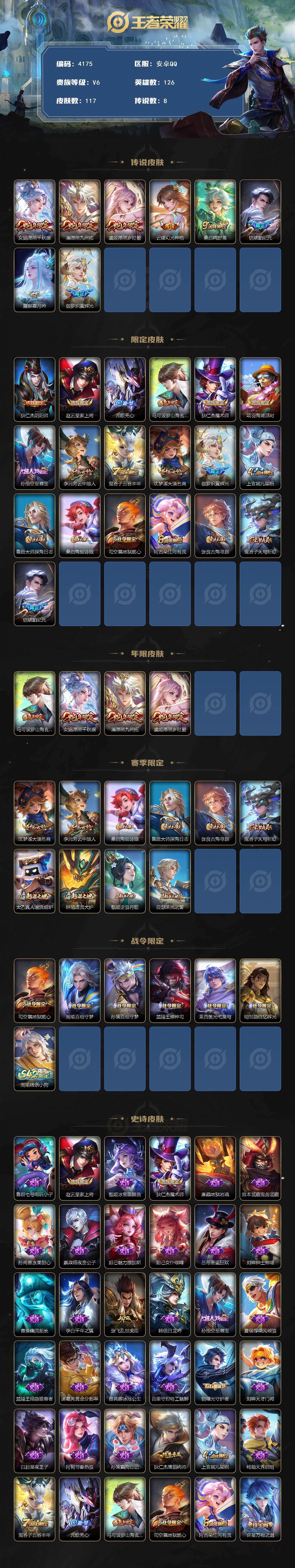 安卓Q-V6-至尊星耀II段位-126英雄-117皮肤-8传说-44史诗【传