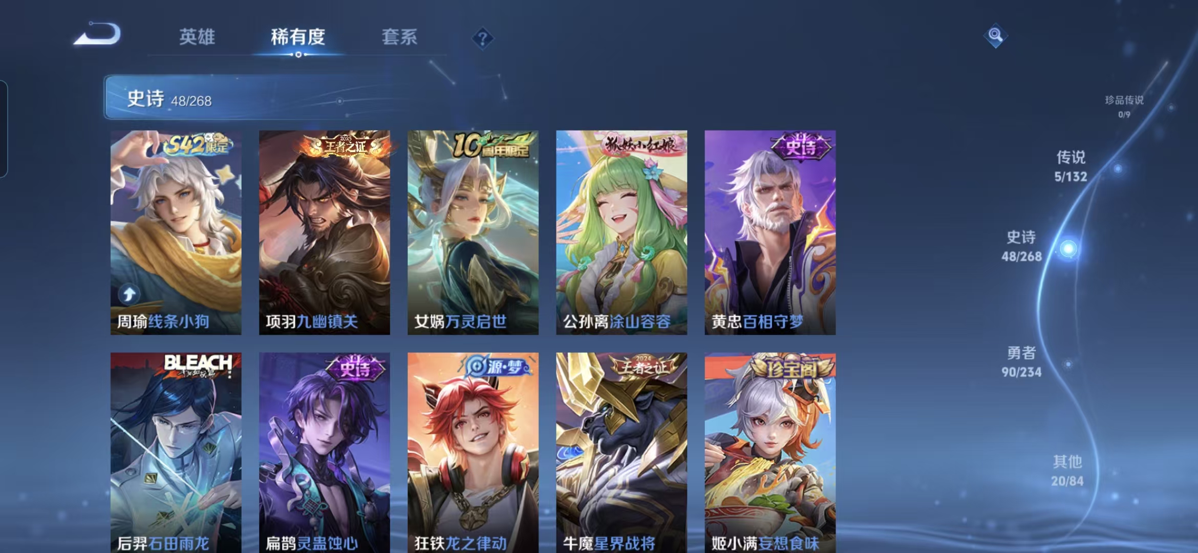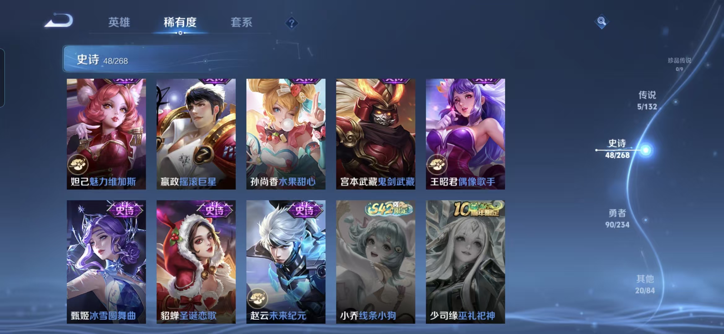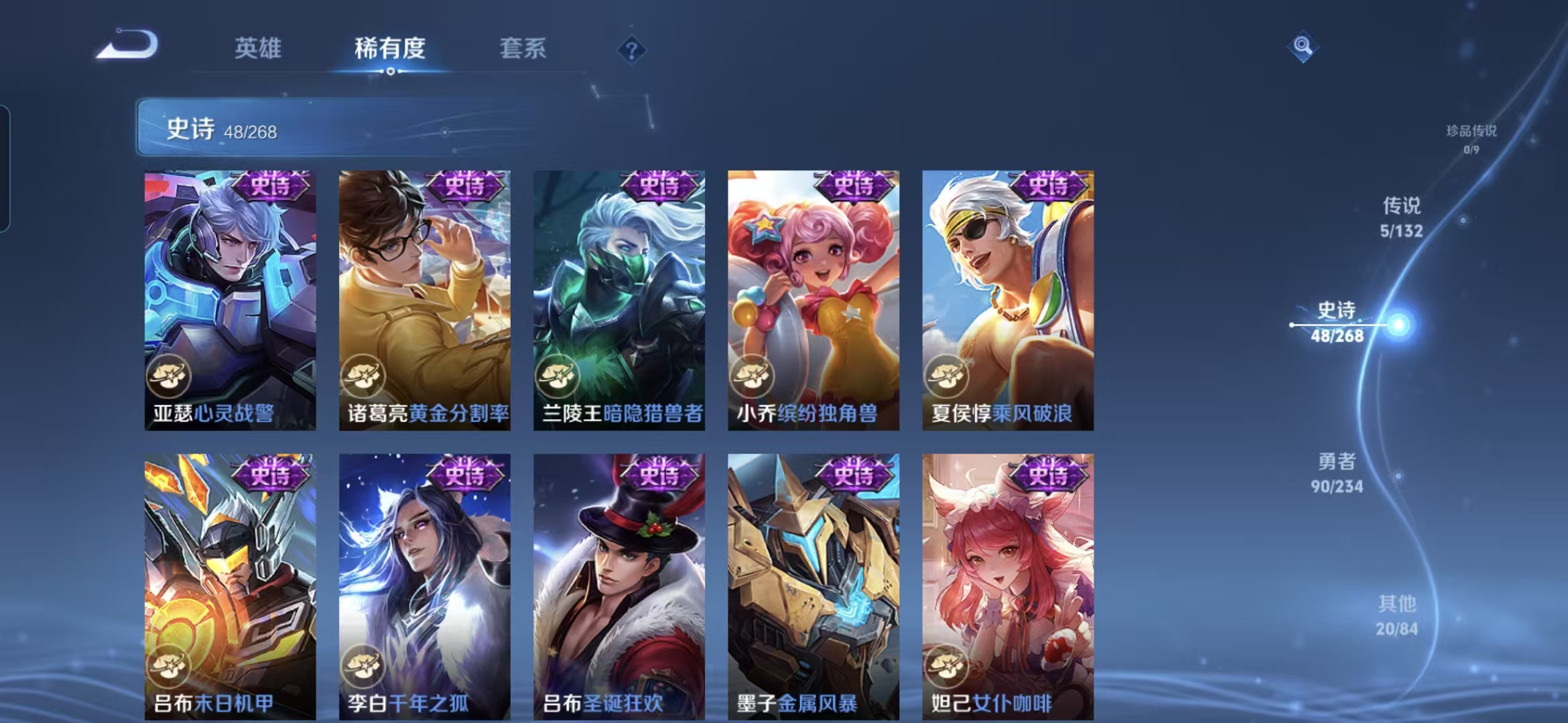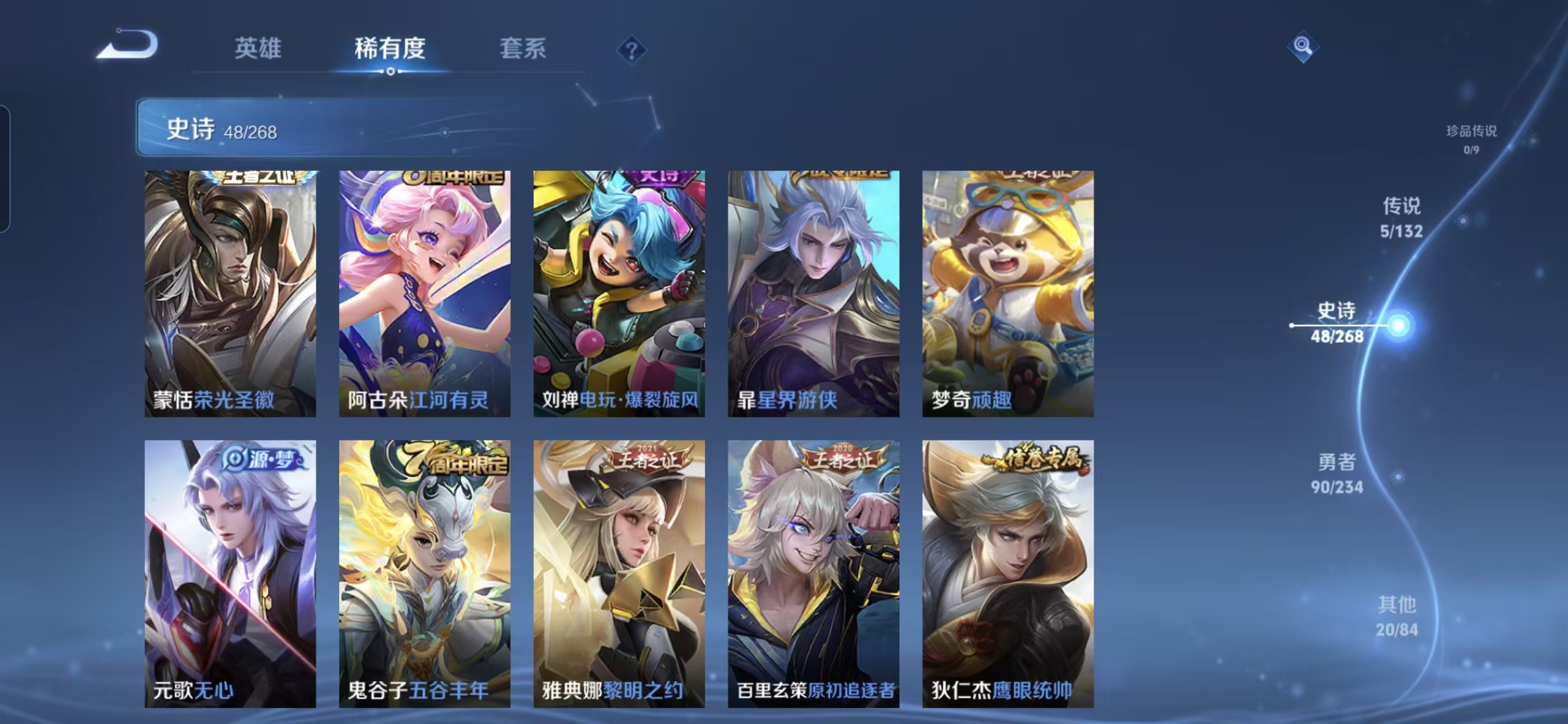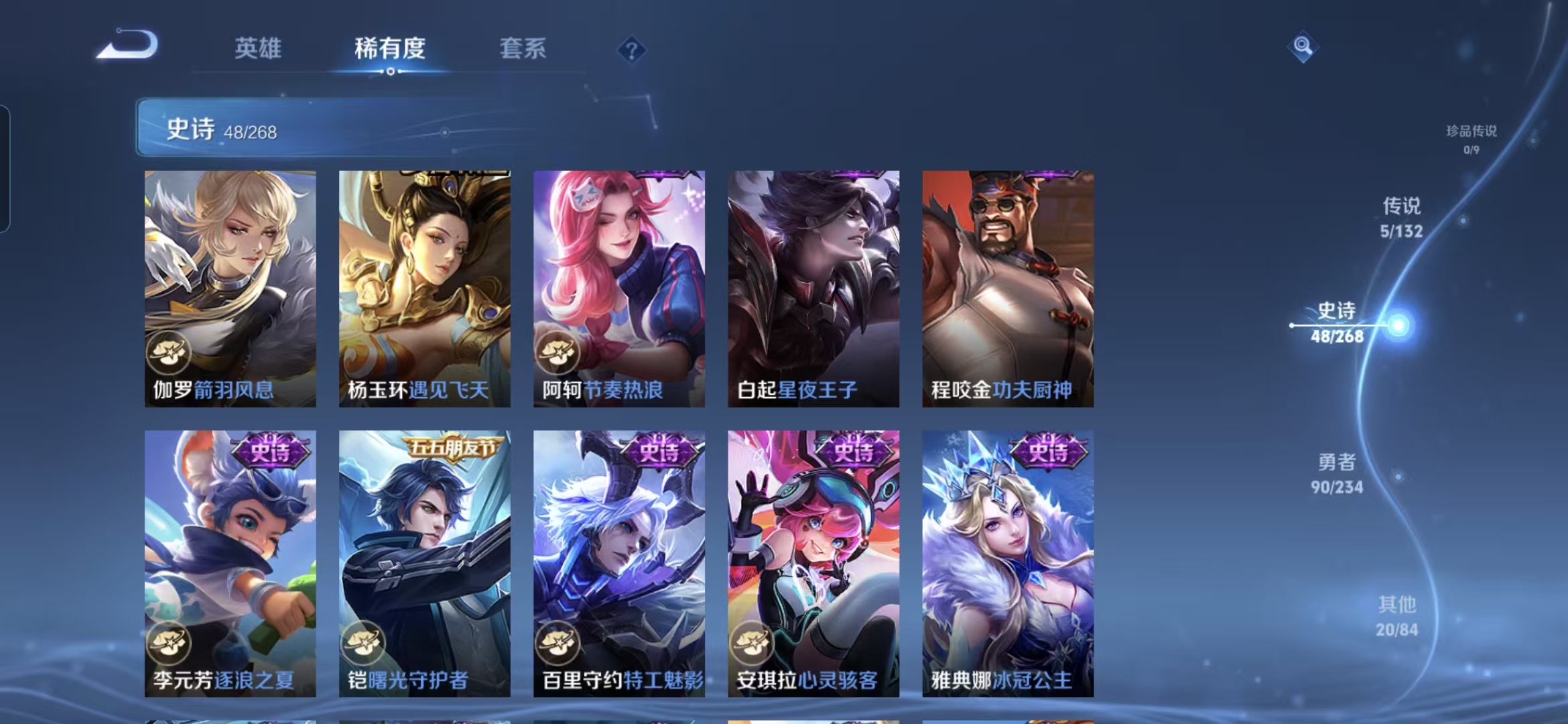 【史诗皮肤】 星界战将 布丁狗之约 谧流熔炉 涂山容容 灵蛊蚀心 龙之律动 线条小狗 九幽镇关 踏浪烽翎 聚星闪耀 江河有灵 荣光圣徽 百相守梦 漠中幻影 万灵启世 星界游侠 顽趣 石田雨龙 功夫厨神 女仆咖啡 魅力维加斯 鹰眼统帅 圣诞恋歌 箭羽风息 鬼剑武藏 曙光守护者 暗隐猎兽者 千年之狐 逐
