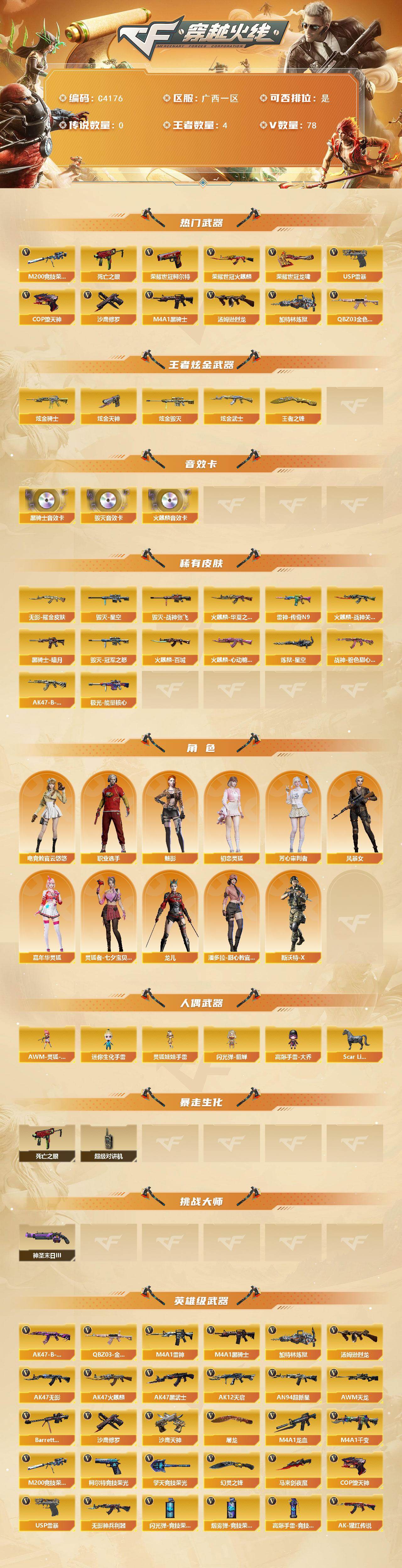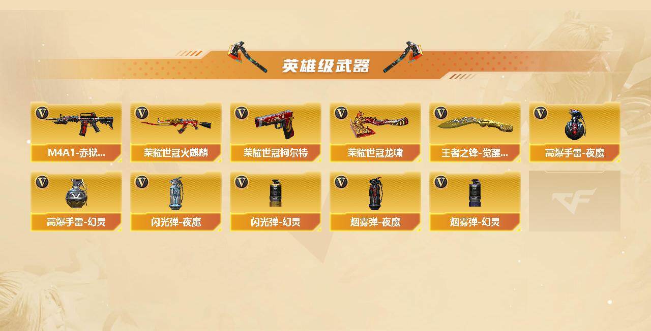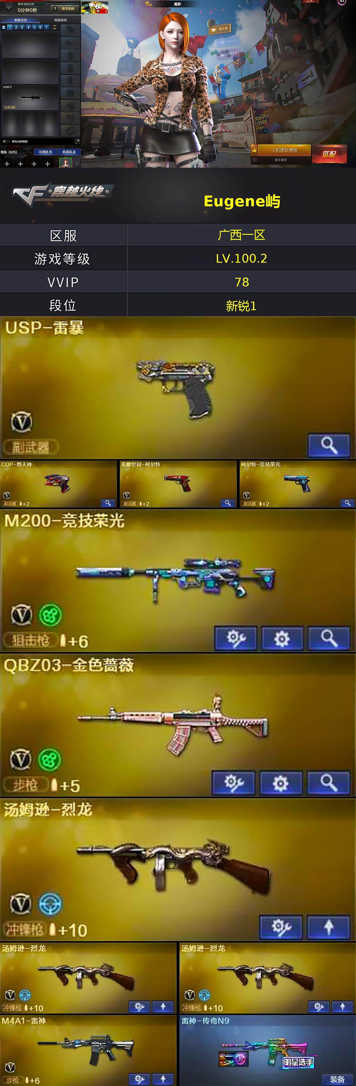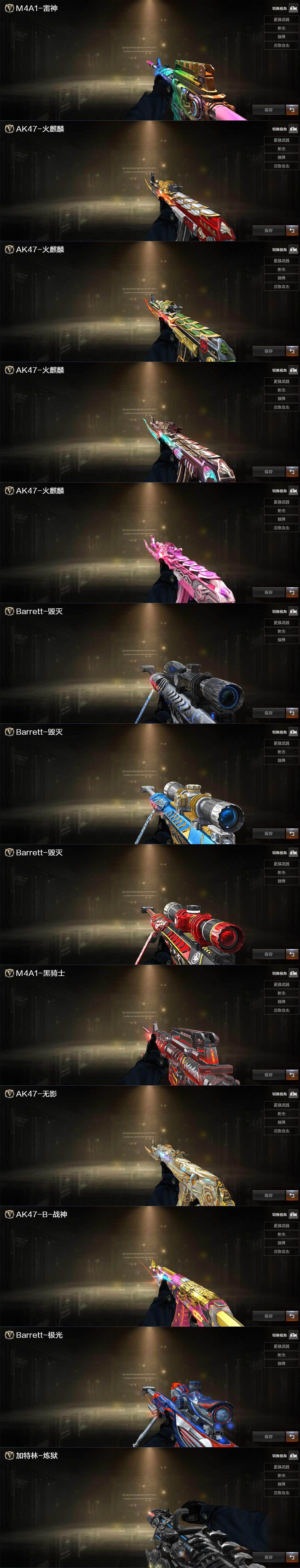 【热门武器】:QBZ03-金色蔷薇,M200-竞技荣光,死亡之眼,荣耀世冠-火麒麟,荣耀世冠-柯尔特,M4A1-黑骑士,汤姆逊-烈龙*3,加特林-炼狱*2,USP-雷暴,COP-堕天神,沙鹰-修罗*2,荣耀世冠-龙啸