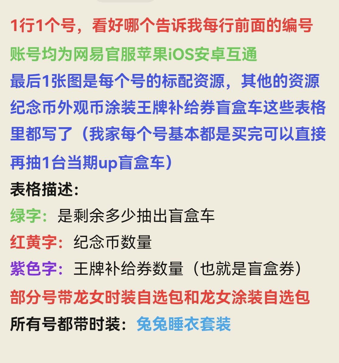 一行一个号,拍前先咨询我,绿色是王牌补给剩余多少抽出车,紫字是补给券数量,黄红字是纪念币数量