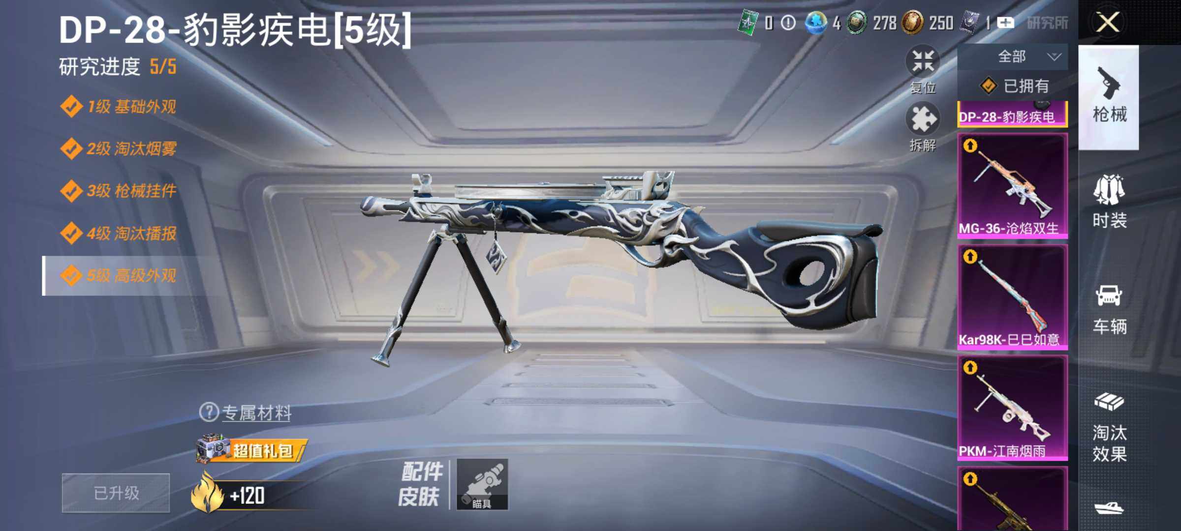 【粉色枪皮等级】:M416-五爪金龙(七级),Kar98K-巳巳如意(五级),DP-28-豹影疾电(五级),PKM-江南烟雨(七级),MG-36-沧焰双生(五级)