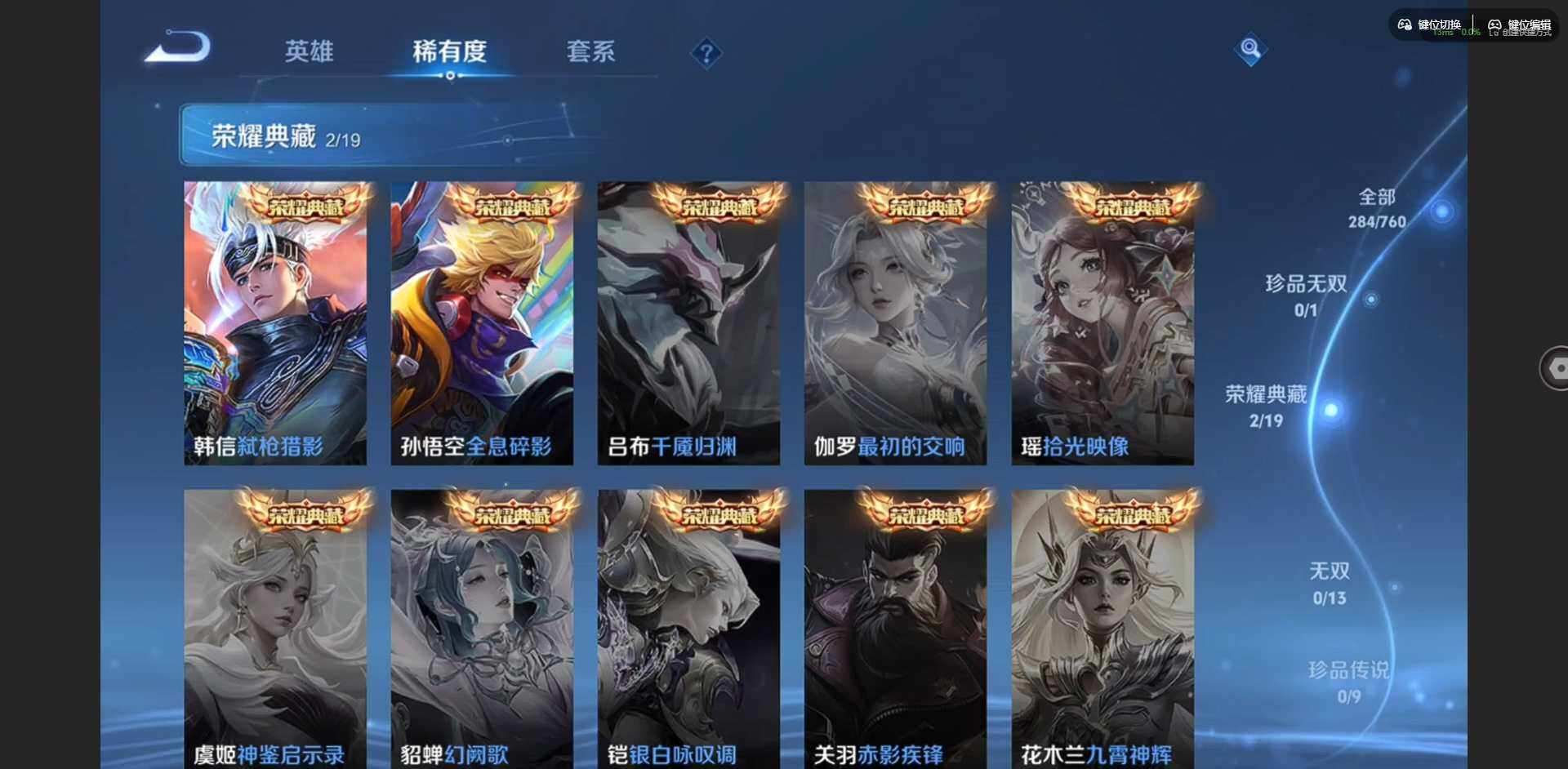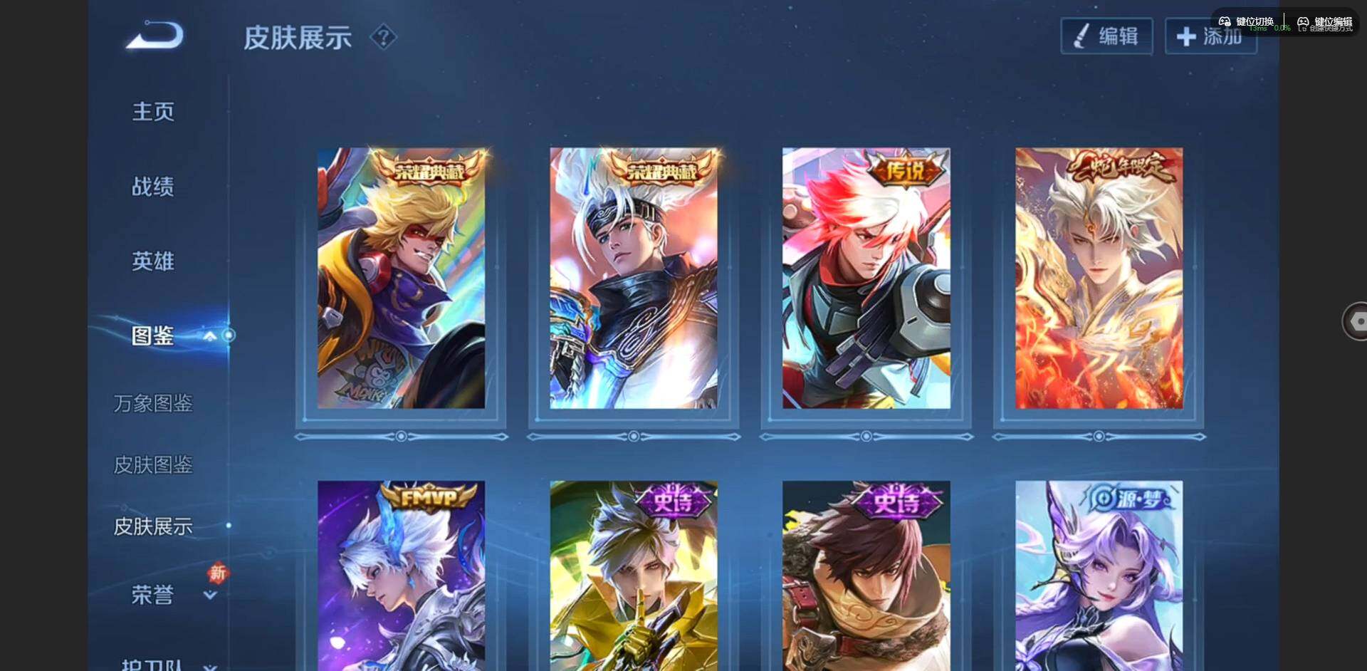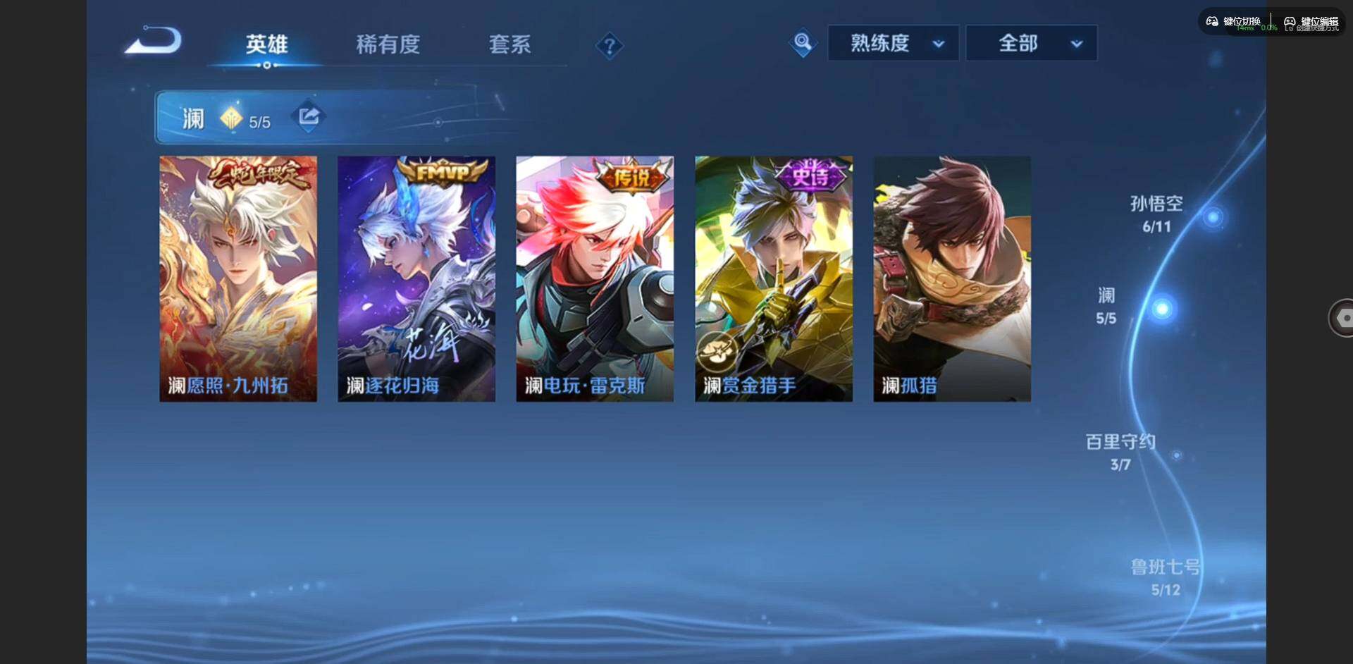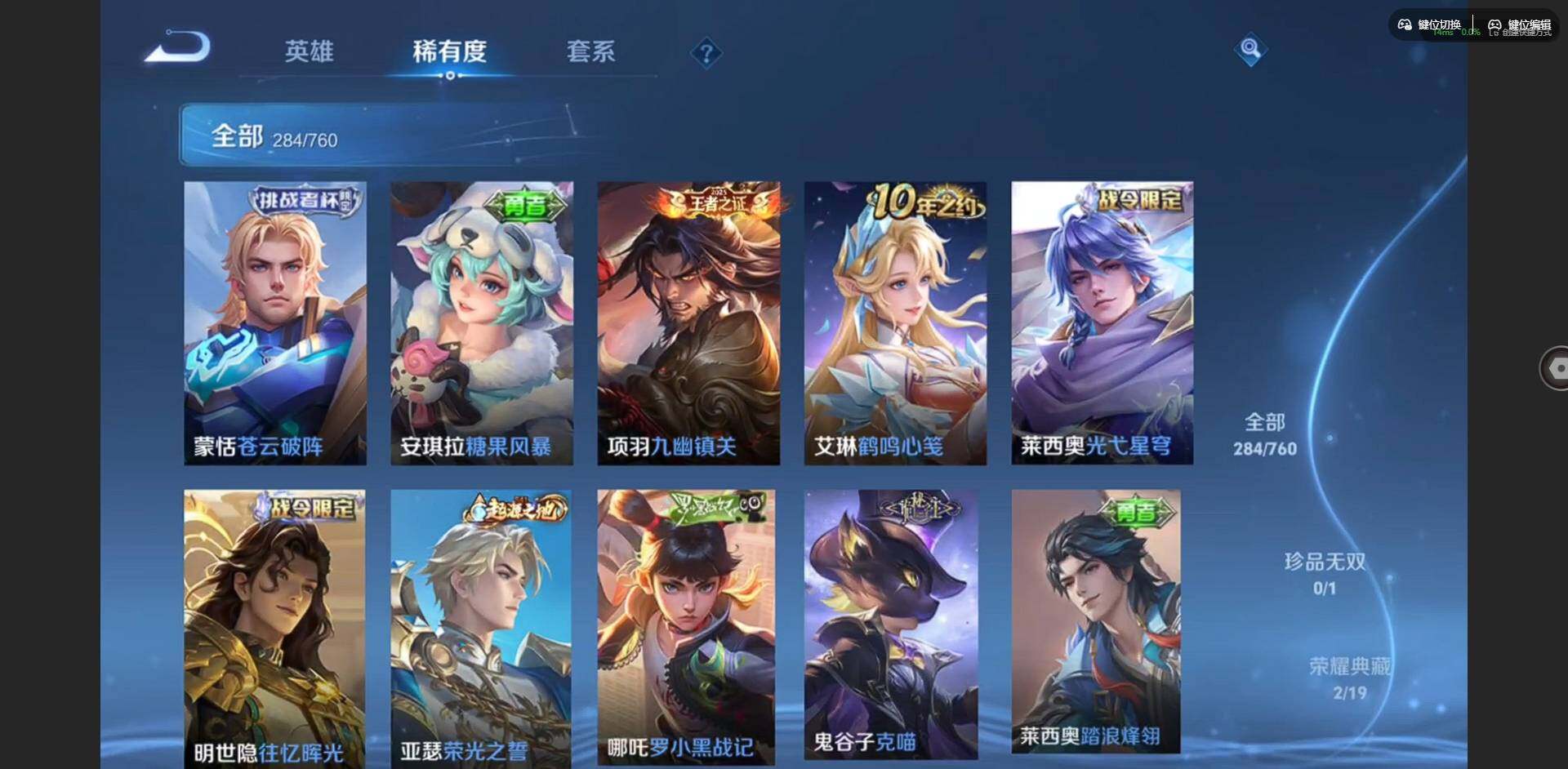 【澜全皮 金标鲁班七号 金标蒙犽】实名: 可修改 贵族等级: V8 英雄数: 126 皮肤数: 285 荣耀水晶: 全息碎影,弑枪猎影 星传说: 幽冥火 传说皮: 冠军飞将,云霓雀翎,地狱火,音你心动-周瑜,乞巧织情,时之恋人-刘备,游龙清影,音你闪耀,碎云,电玩·雷克斯,鲁班七号-时之奇旅,澜逐花归海 限定皮: 李小龙,辉光之辰,岱宗,幽恒,至尊宝,高山流水,孙