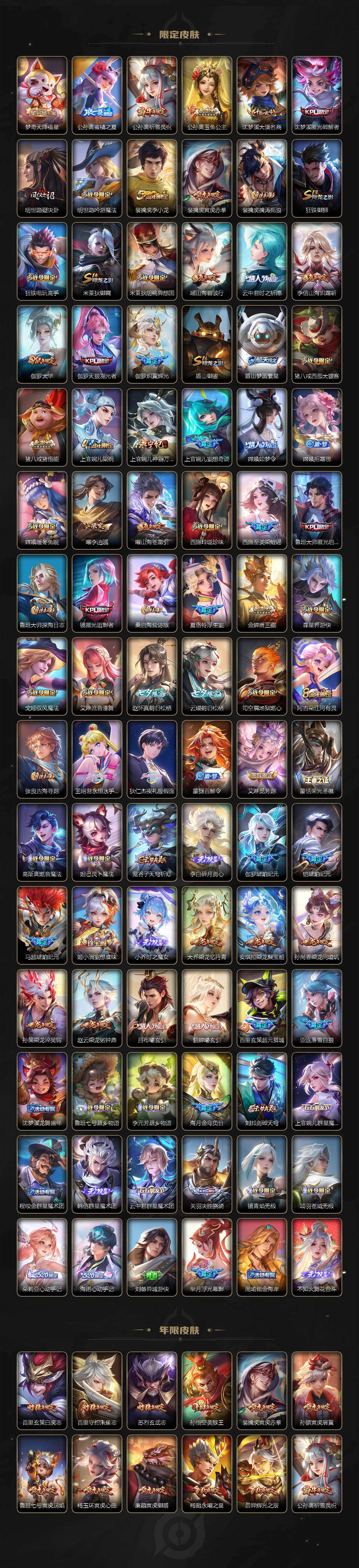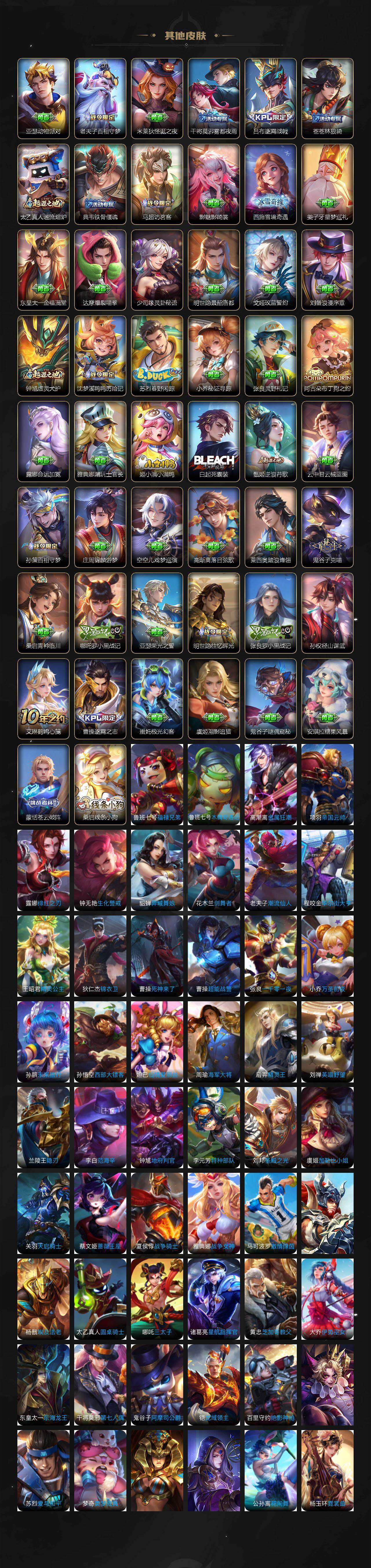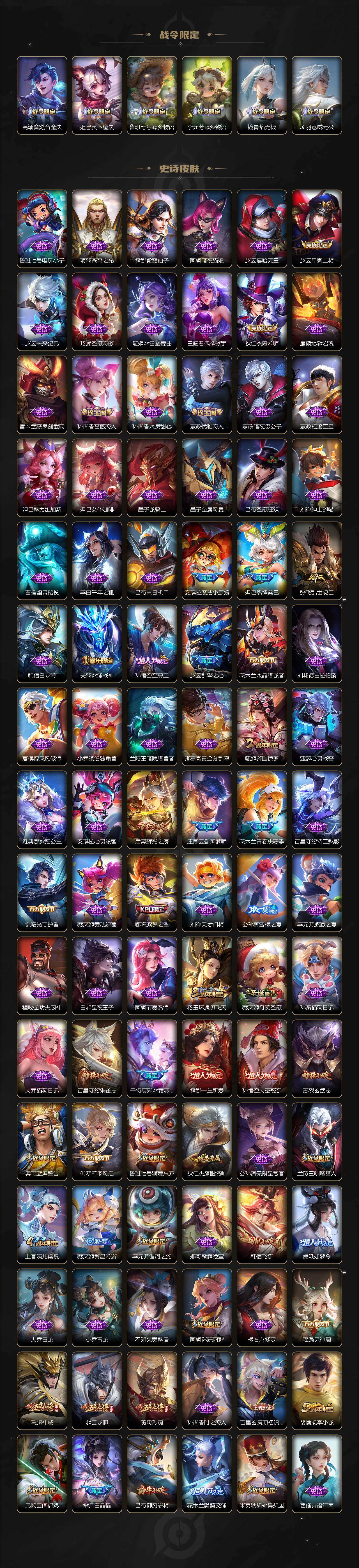 【英雄全皮】:廉颇全皮,赵云全皮,墨子全皮,刘禅全皮,阿轲全皮,扁鹊全皮,白起全皮,元歌全皮,夏侯惇全皮,宫本武藏全皮,狄仁杰全皮,达摩全皮,司马懿全皮,露娜全皮,姜子牙全皮,刘邦全皮,孙权全皮,兰陵王全