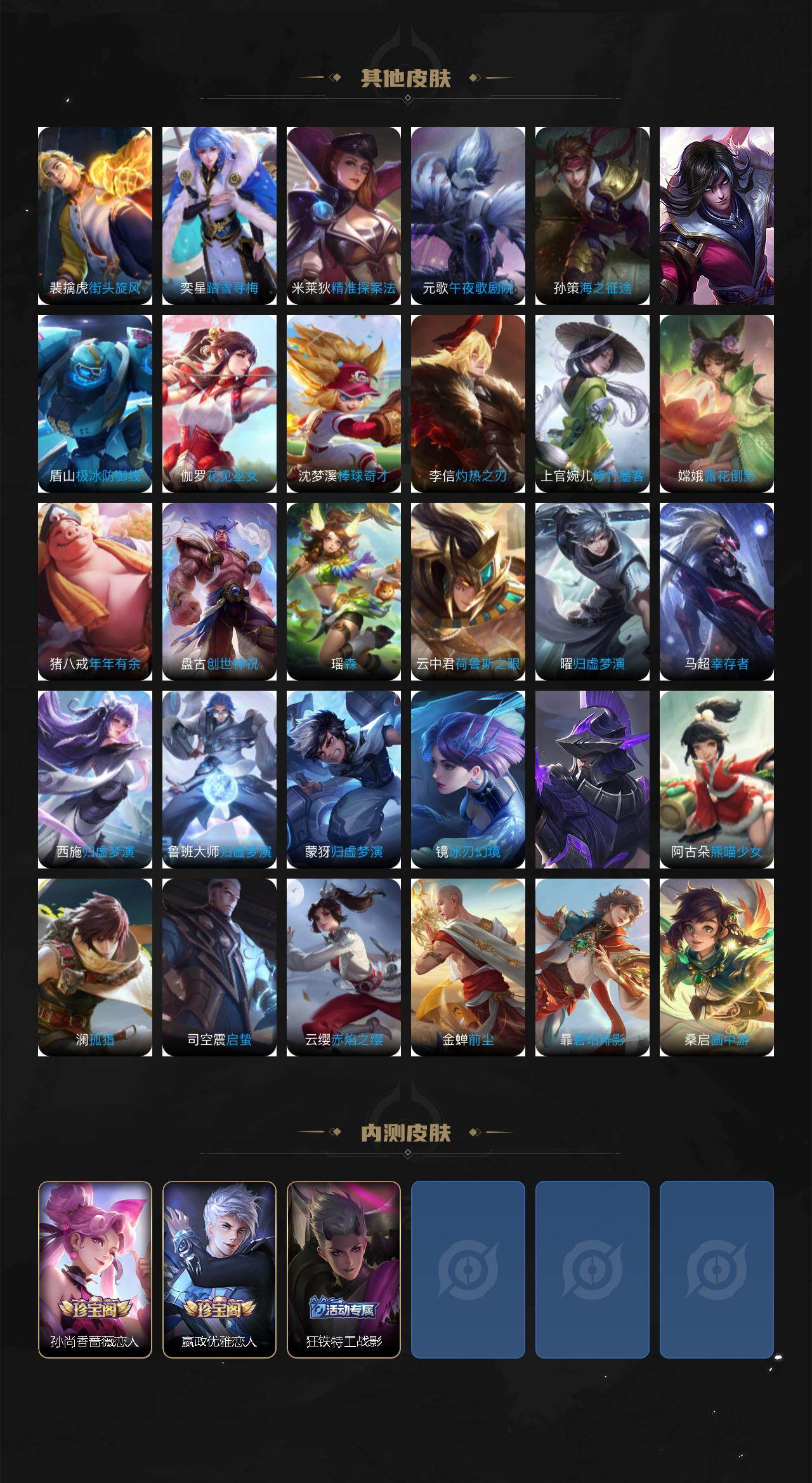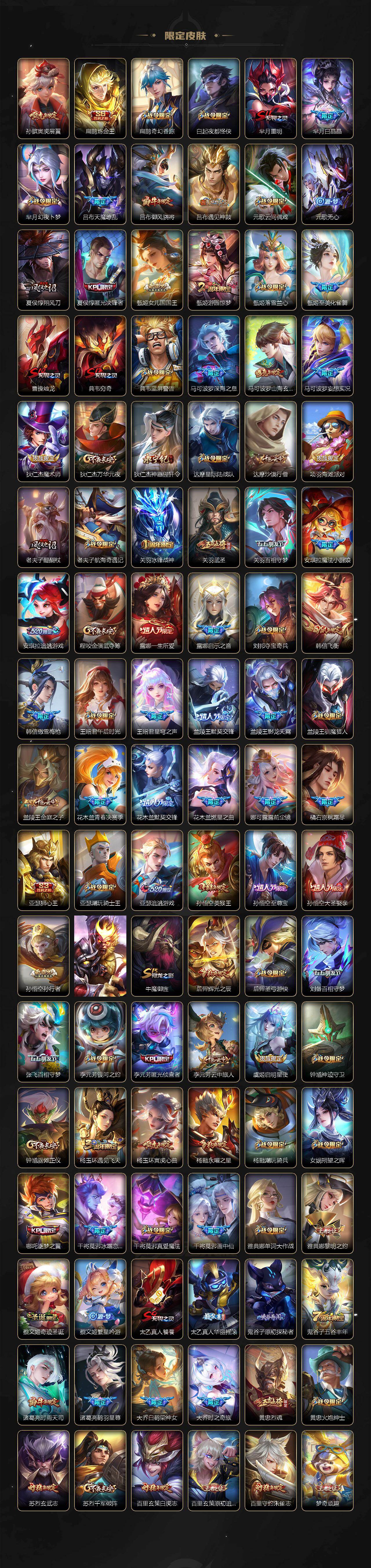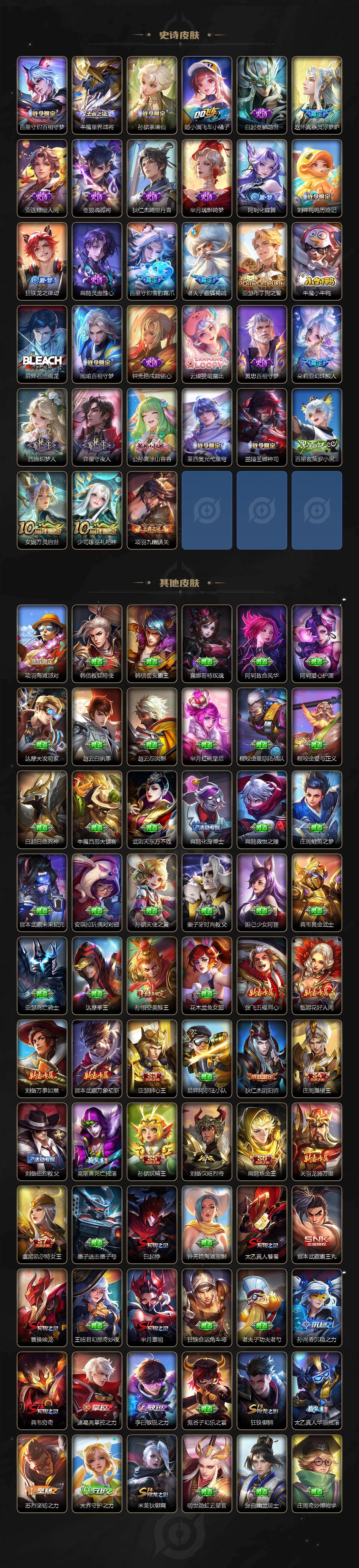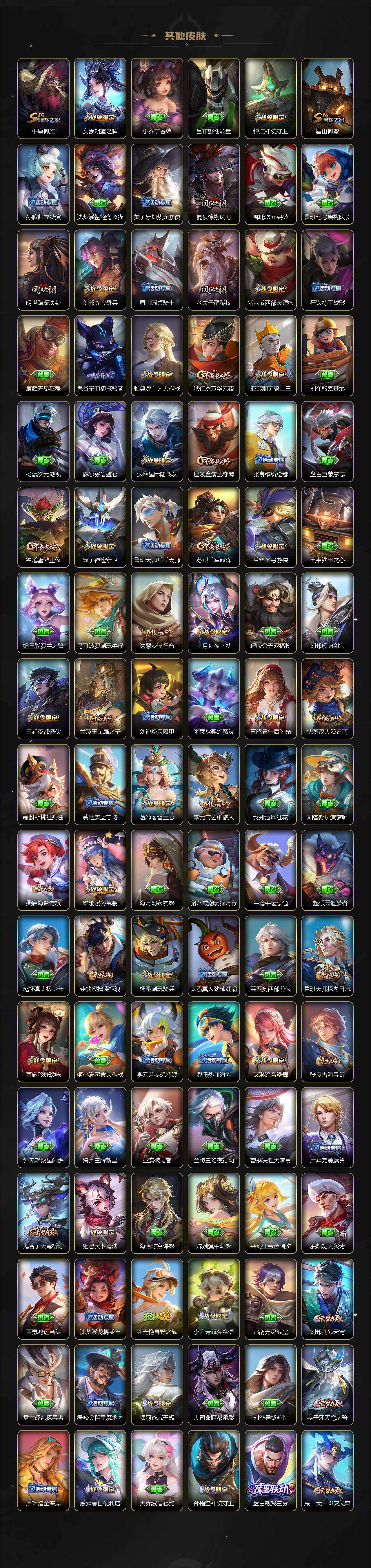 【英雄全皮】:廉颇全皮,赵云全皮,墨子全皮,刘禅全皮,阿轲全皮,扁鹊全皮,白起全皮,元歌全皮,夏侯惇全皮,宫本武藏全皮,狄仁杰全皮,达摩全皮,司马懿全皮,露娜全皮,姜子牙全皮,刘邦全皮,孙权全皮,兰陵王全