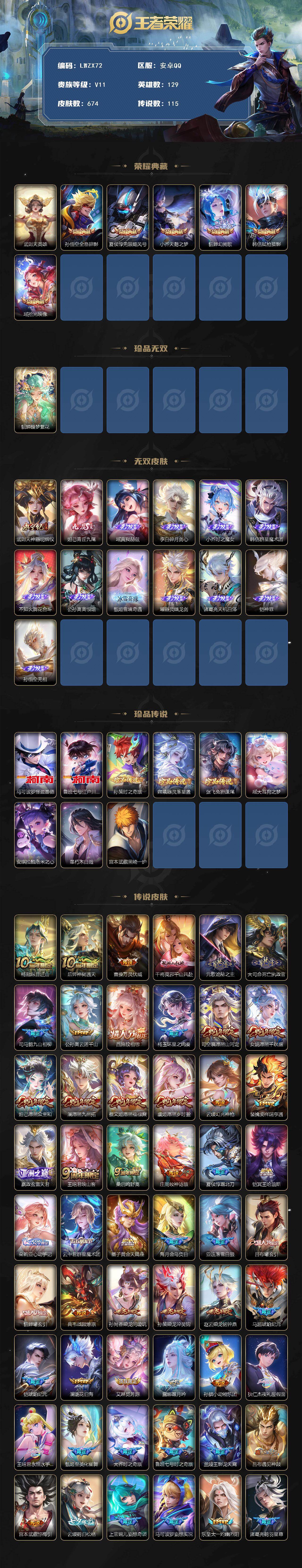【特价出售/店主推荐】安卓Q-V11-至尊星耀IV段位-129英雄-674皮肤-6典藏皮肤-1典藏英雄-1珍品无双-13无双-9珍品传说-115传说-230史诗