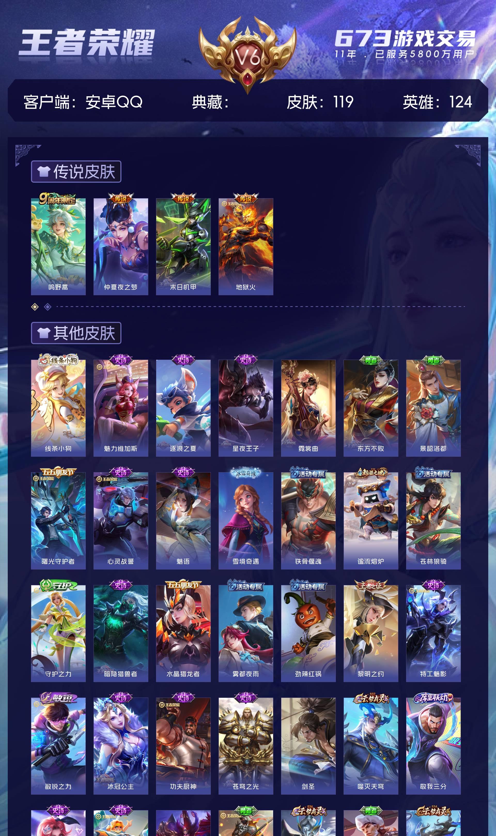 V6 皮肤119 英雄124 永恒钻石 星传说1 传说4 其他皮肤121