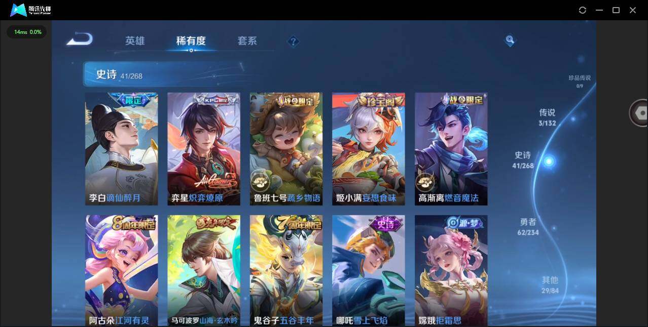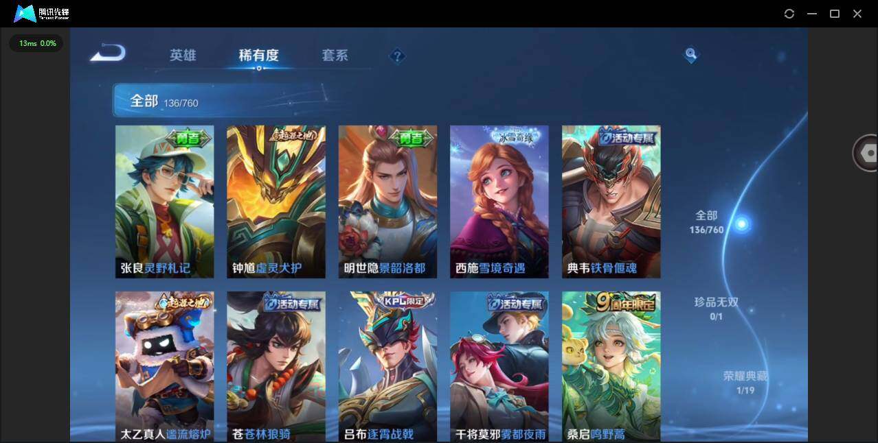 贵族等级: V6 英雄数: 125 皮肤数: 136 荣耀水晶: 弑枪猎影 传说皮: 黄金射手座,山海·苍雷引 限定皮: 遇见飞天,李小龙,五谷丰年,山海·玄木吟,鸣野蒿,逐霄战戟