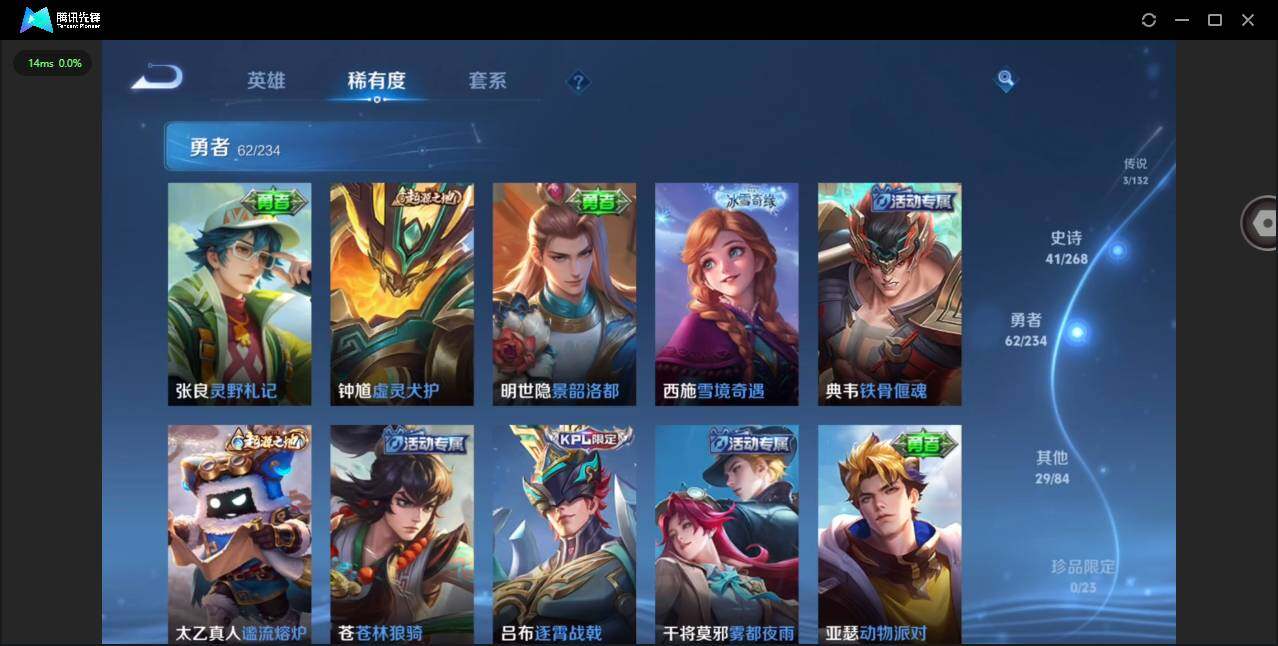 贵族等级: V6 英雄数: 125 皮肤数: 136 荣耀水晶: 弑枪猎影 传