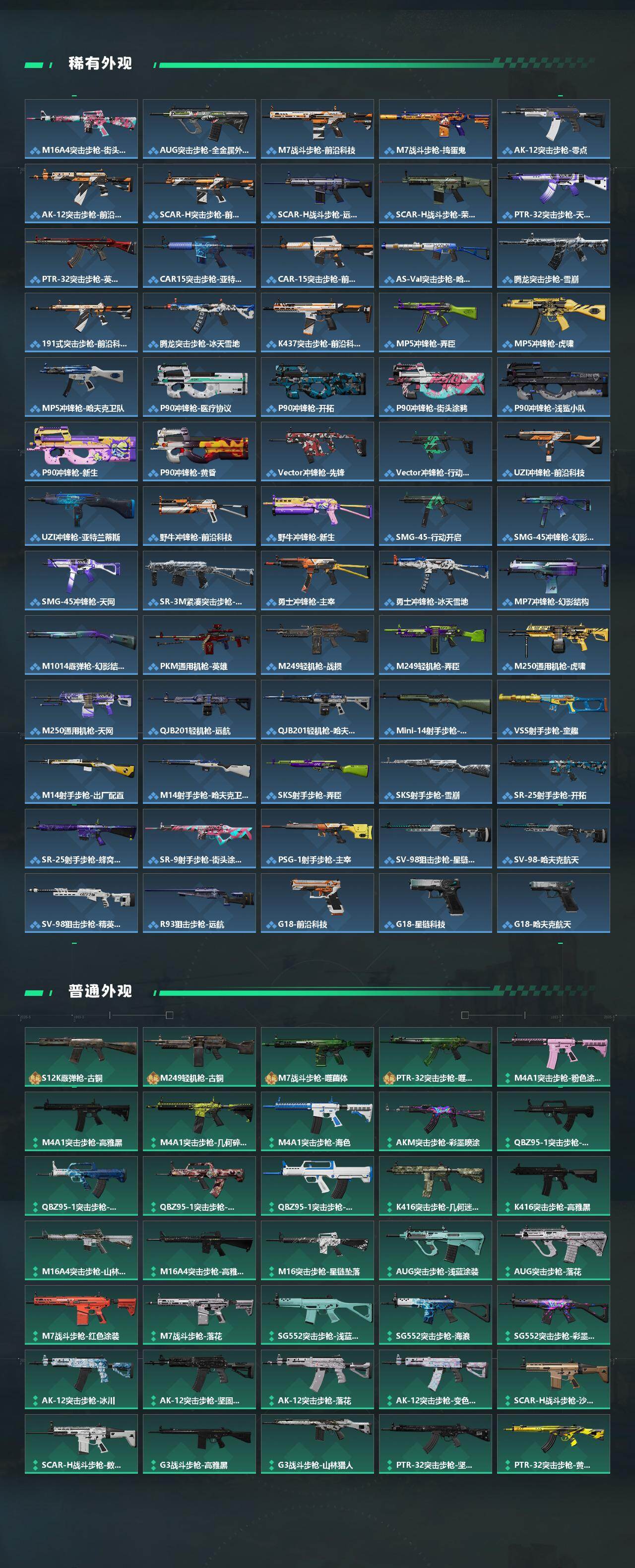 【传说外观】:M4A1突击步枪-阿米娅,SG552突击步枪-运动员,AK-12突击步枪-夜鹰,AK-12突击步枪-特斯拉线圈,SCAR-H战斗步枪-水墨云图,SCAR-H战