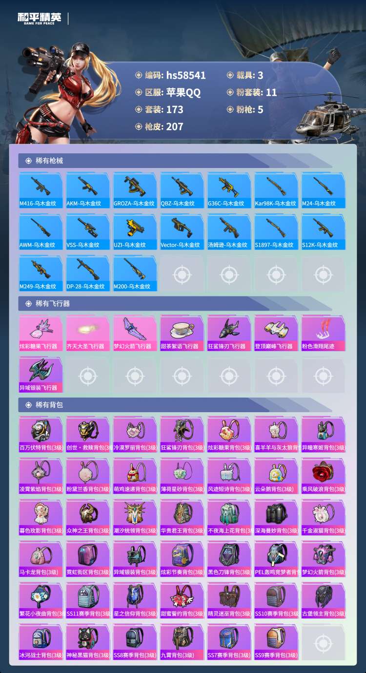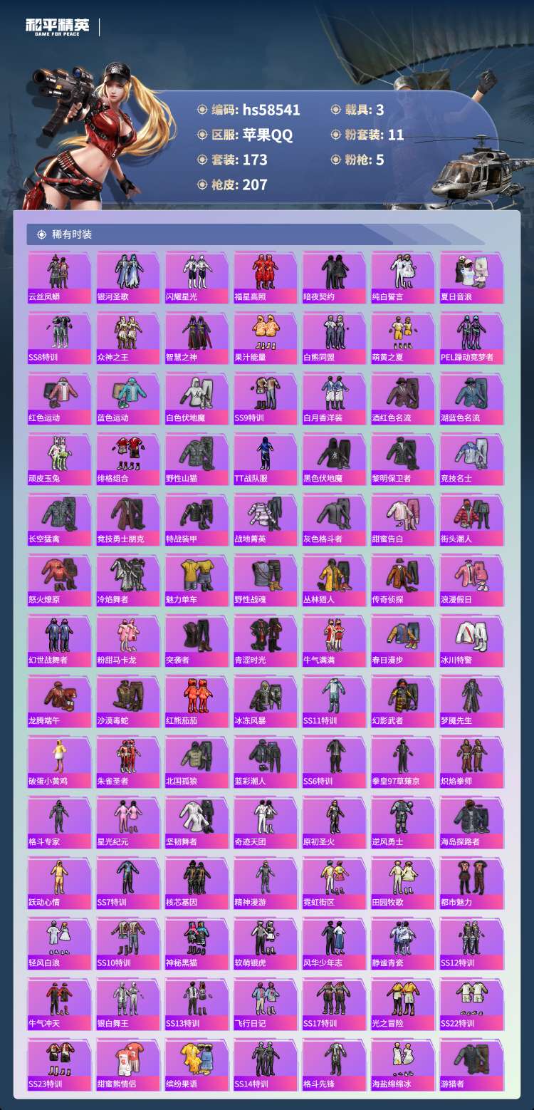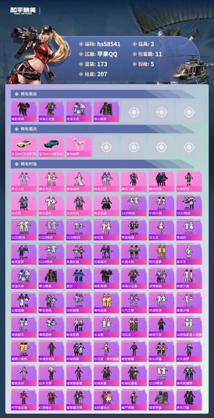 hs58541 苹果手Q-14王牌印记-11粉装-5特效枪-3载具-75557热力值-173套装-2