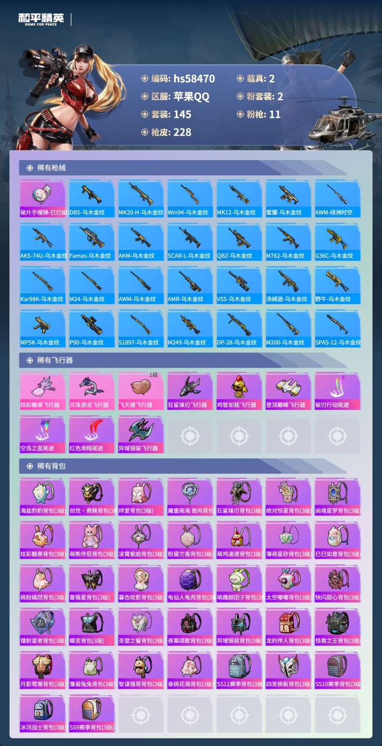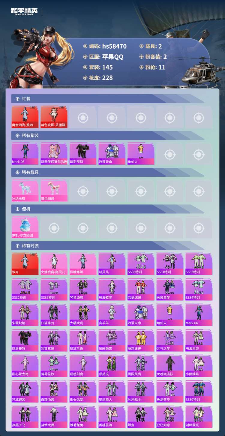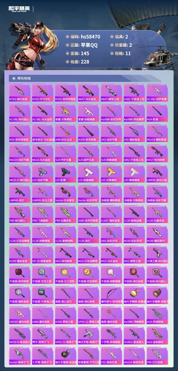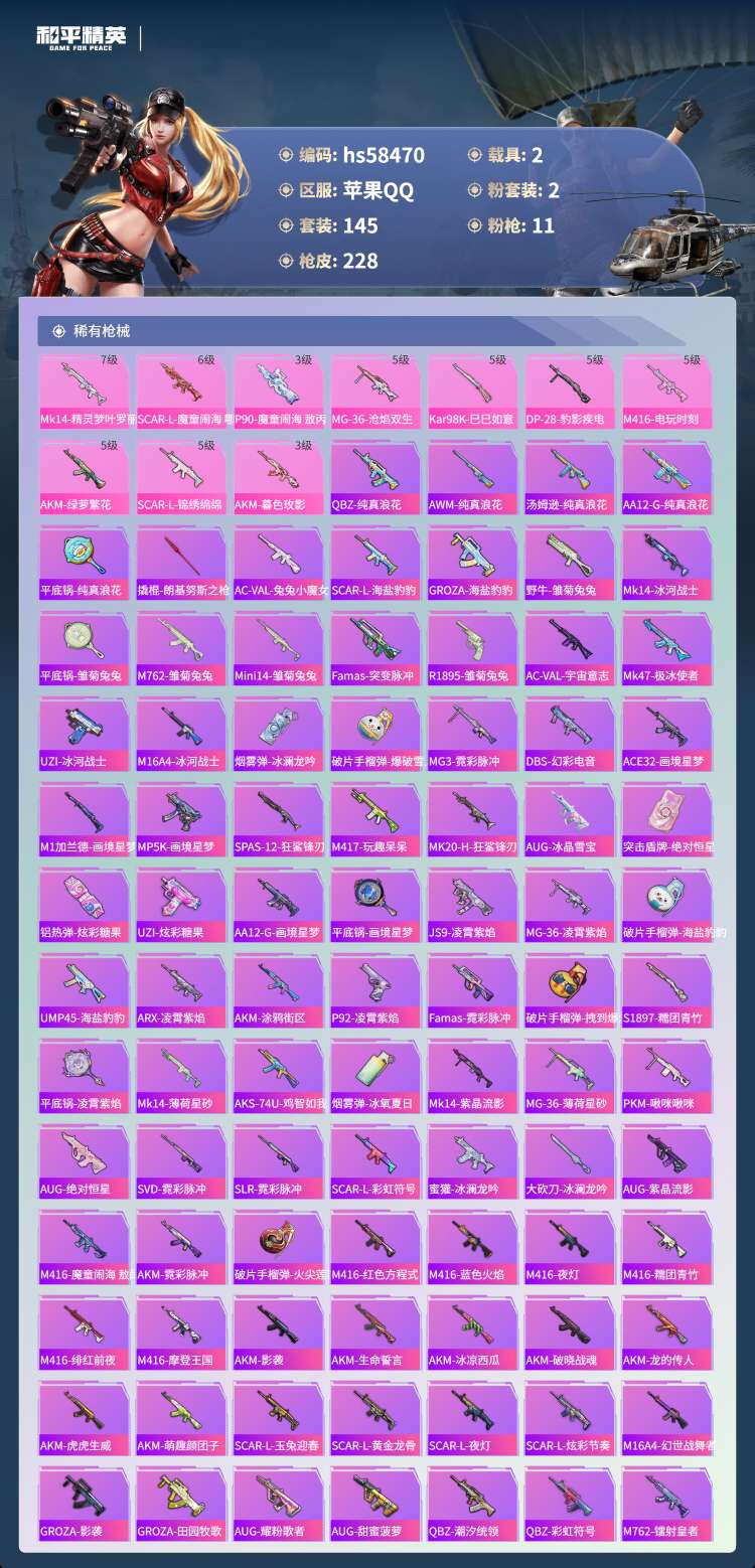 hs58470 苹果手Q-15王牌印记-2红装-2粉装-11特效枪-2载具-72728热力值-145