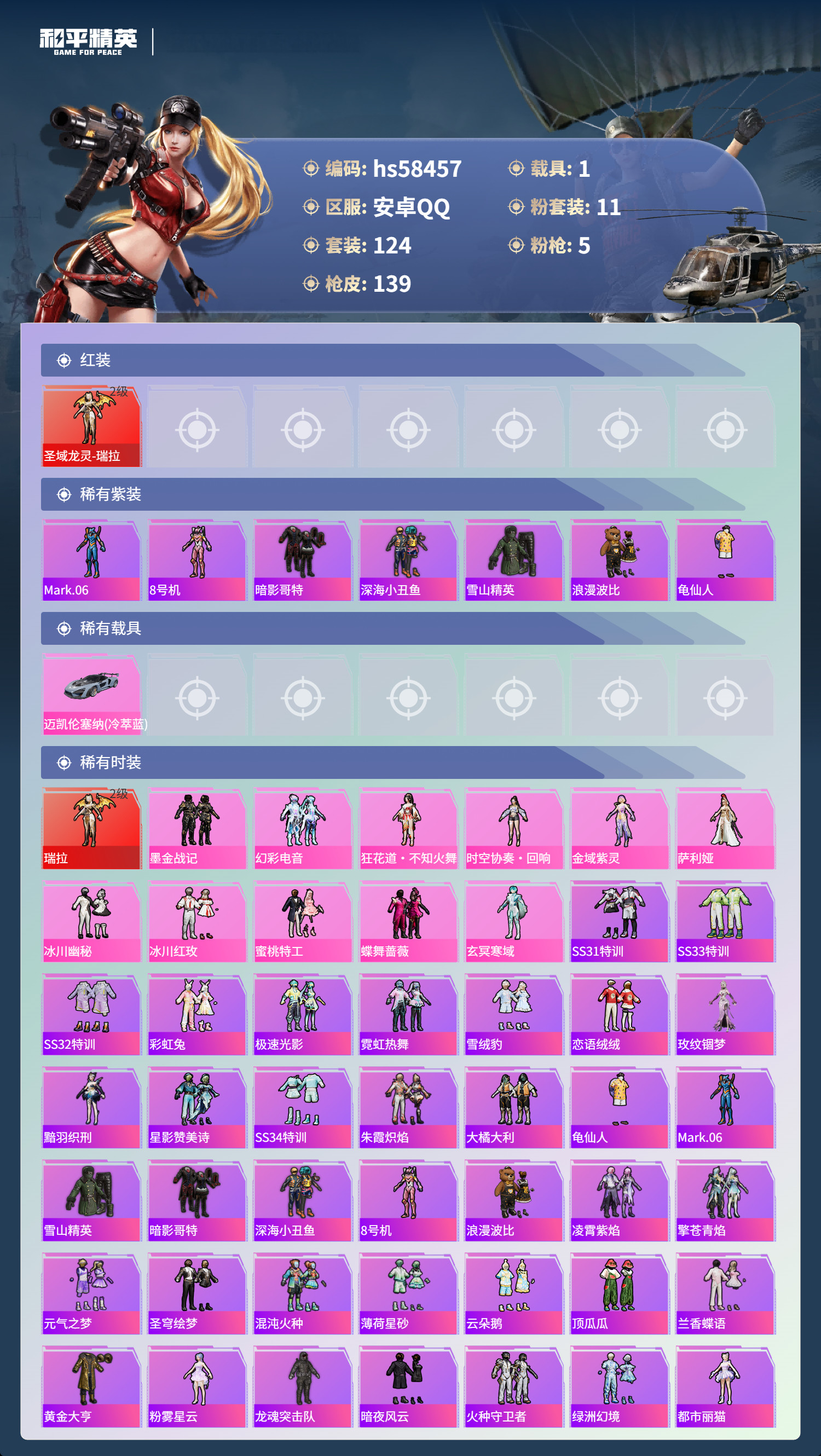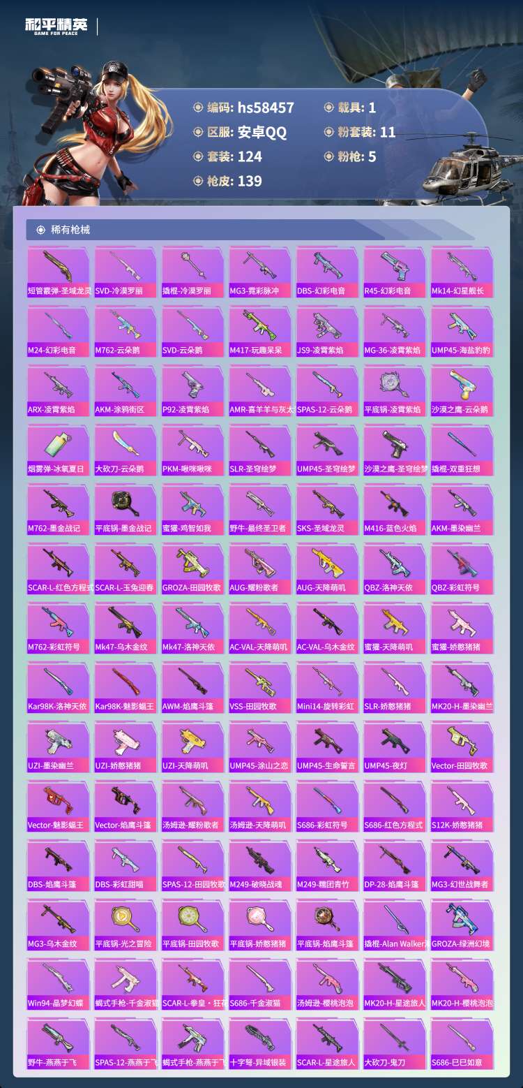 安卓手Q-4王牌印记-1红装-11粉装-5特效枪-1载具-50036热力值-124套装-139枪皮【