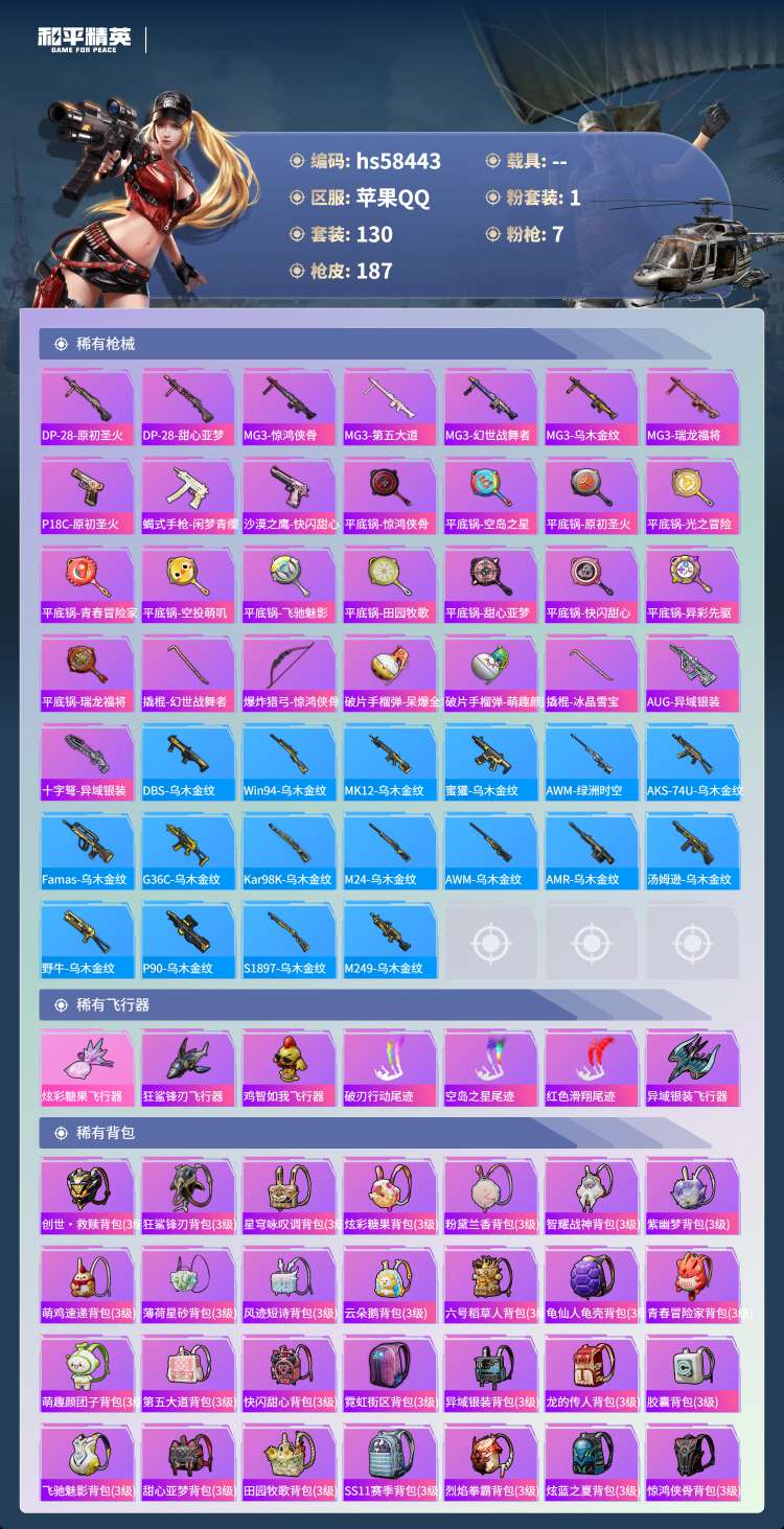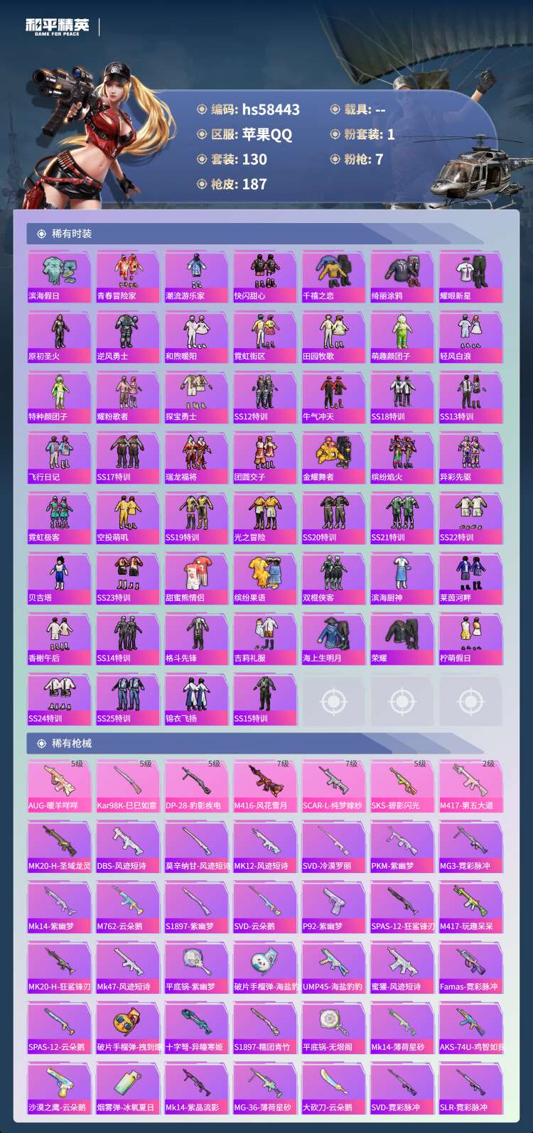 hs58443 苹果手Q-11王牌印记-1粉装-7特效枪-56918热力值-130套装-187枪皮【