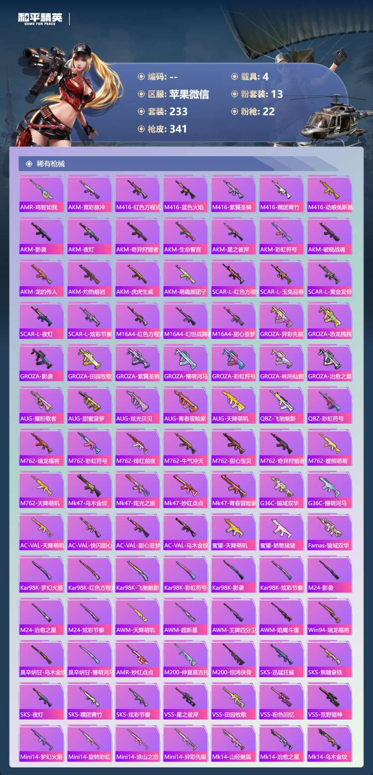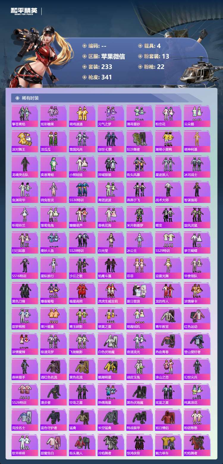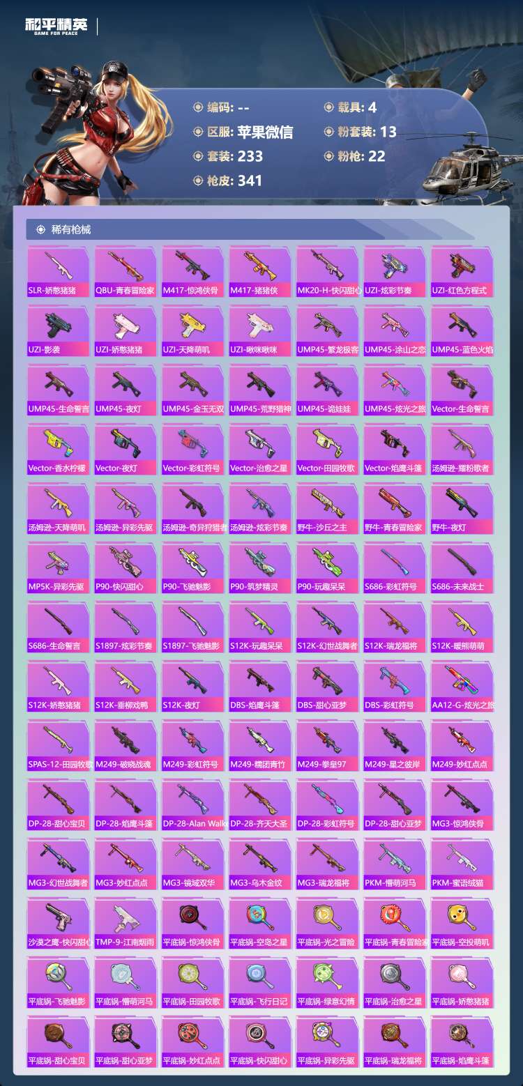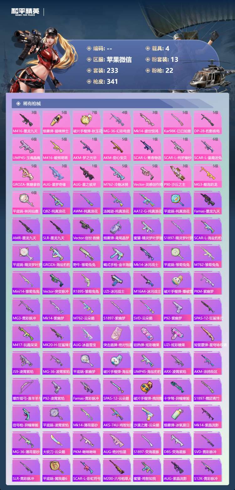 a4245/苹果微/22王牌印记-1红装-13粉装-22特效枪-4载具-118628热力值-233