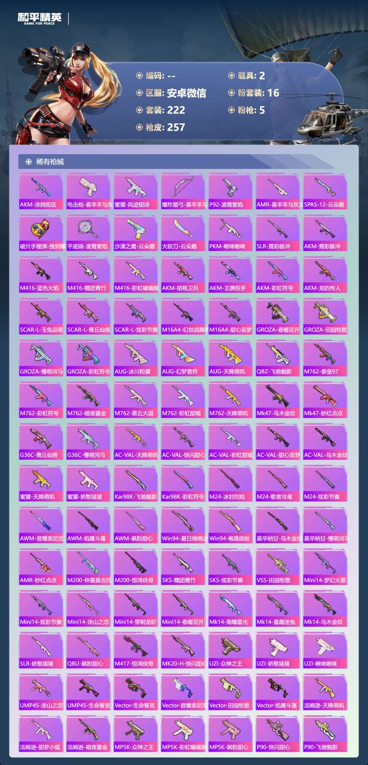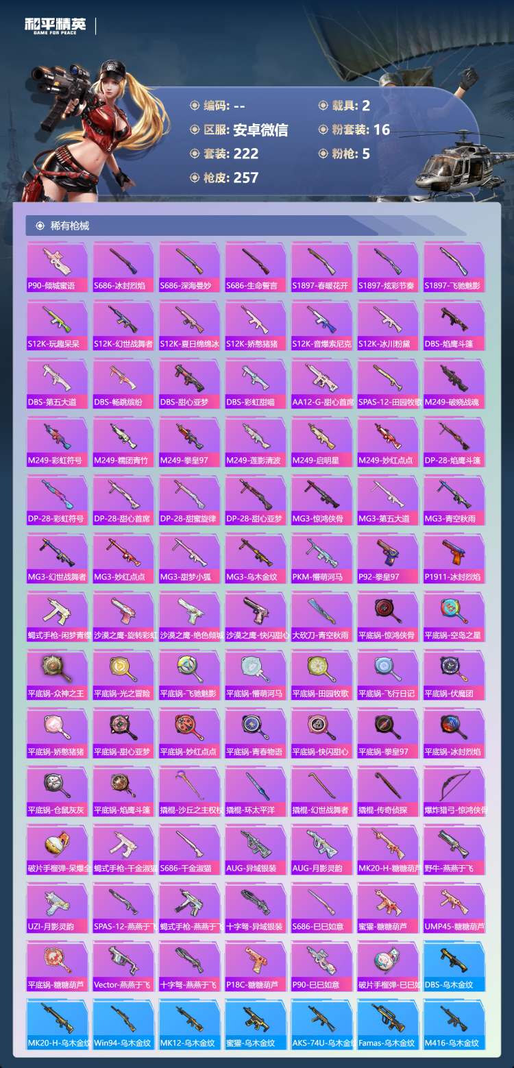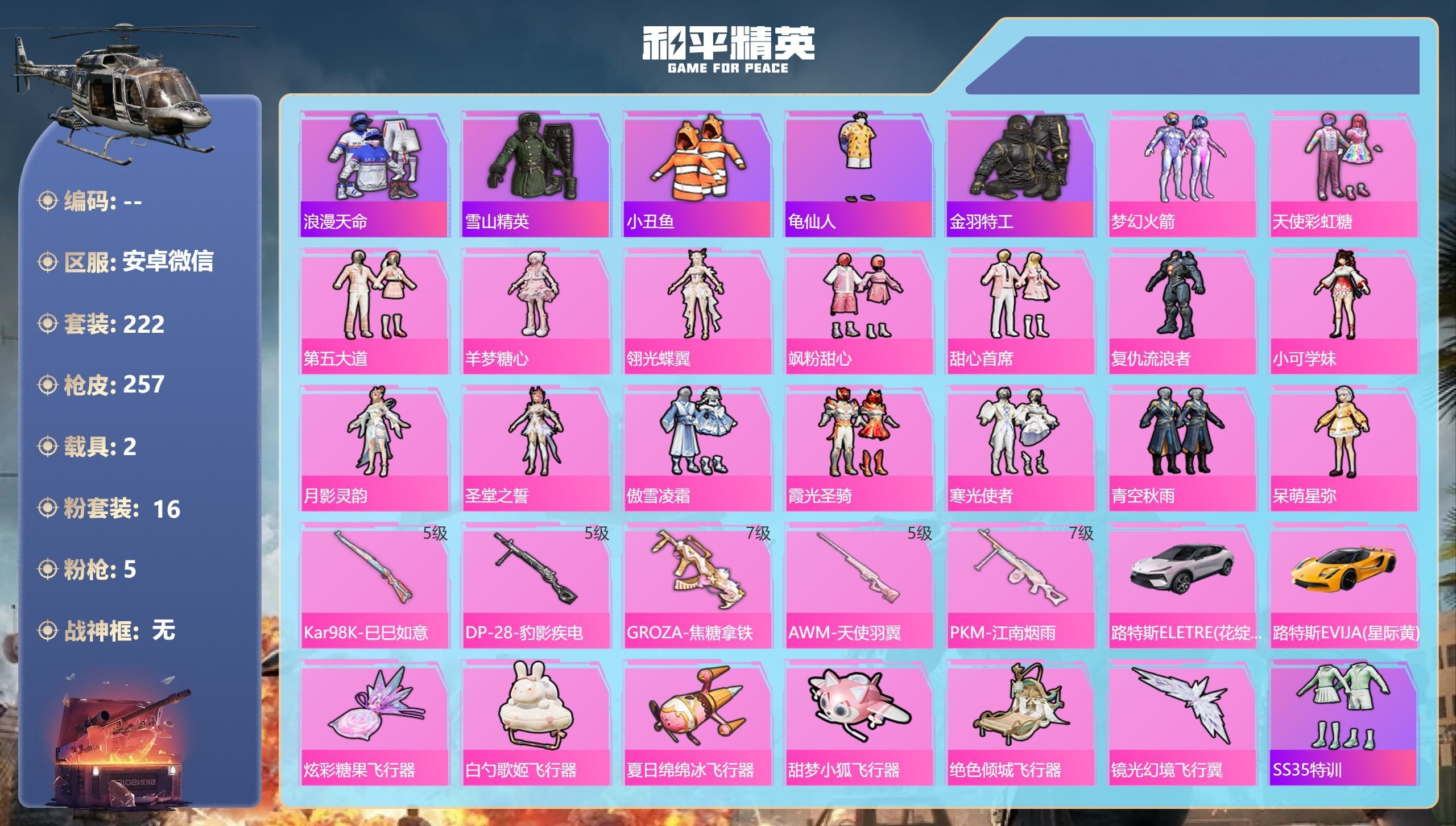 a4249/安卓微/16王牌印记-16粉装-5特效枪-2载具-93937热力值-222套装-257