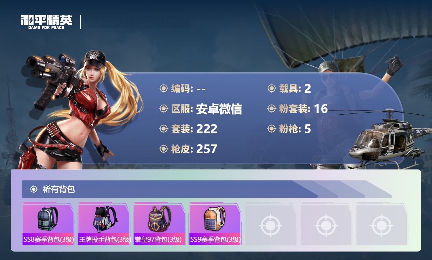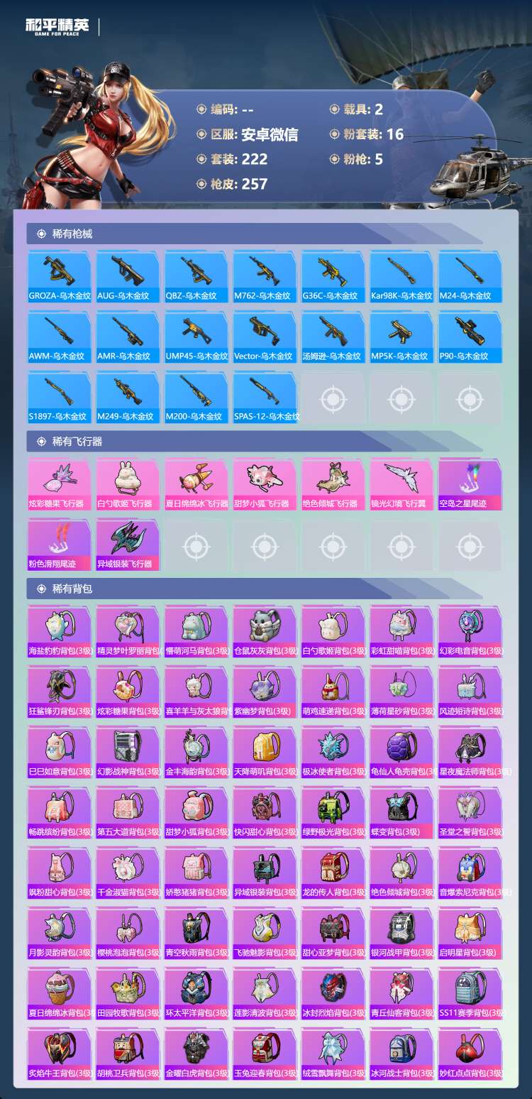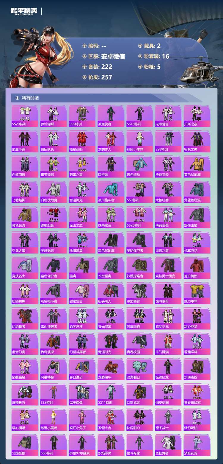 a4249/安卓微/16王牌印记-16粉装-5特效枪-2载具-93937热力值-222套装-257