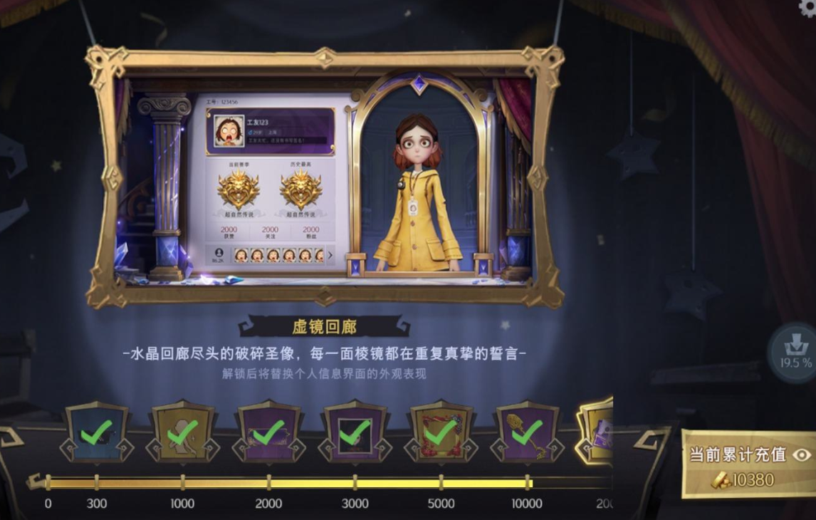 ZR216,超自然传说,红皮:1,金皮:1,紫皮:4,道具皮:19,铲铲币:1w,累充:10380金砖,红皮:巫铃儿-镜生遗梦,金皮:巫铃儿-镜花辞,紫皮:艾伦-绒绒对决、莉莉-莓果陷阱、爱丽丝-丝缕哀歌、小黄-呱呱雨衣,员工:小黄、爱丽丝、零、阿念、逍遥、薇薇安、巫铃儿、莉莉、艾伦、爱德华、兰、小满,头饰:雪墩墩头套、樱桃奶油布丁、惊魂南瓜头套、鱼头怪头套、烈焰红唇头套、大葱明头套、火爆了头套、