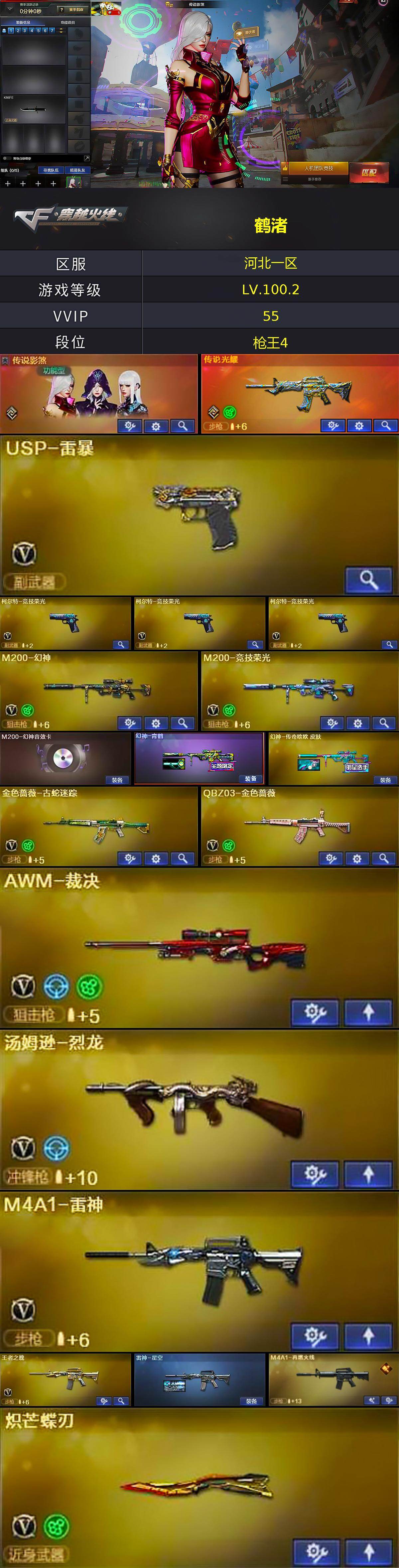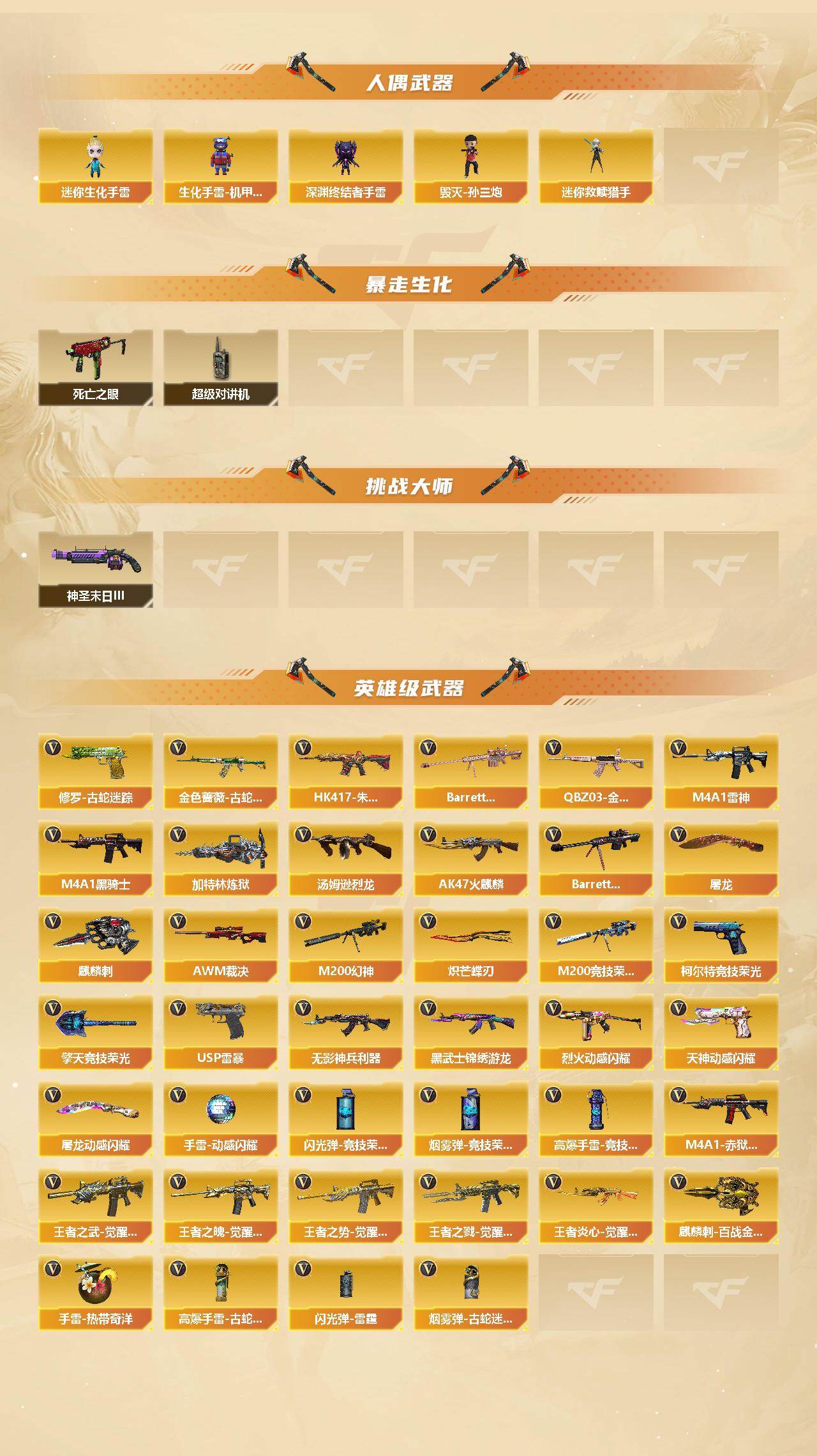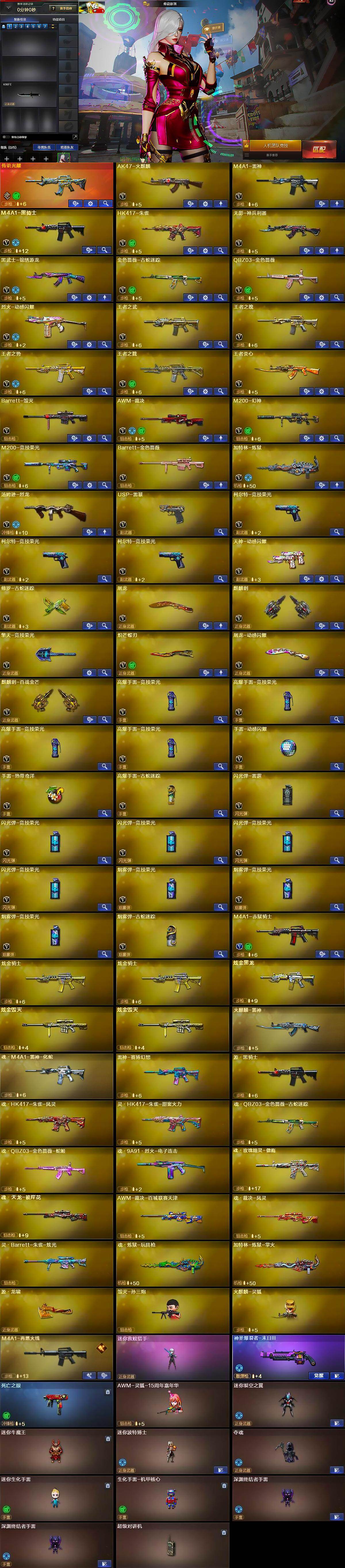 【热门武器】:传说光耀,QBZ03-金色蔷薇,HK417-朱雀,M200-幻神,金色蔷薇-古蛇迷踪,修罗-古蛇迷踪,M200-竞技荣光,死亡之眼,M4A1-黑骑士,汤姆逊-烈龙,加特林-炼狱,毁灭-孙三炮,USP-雷暴,炽芒蝶刃