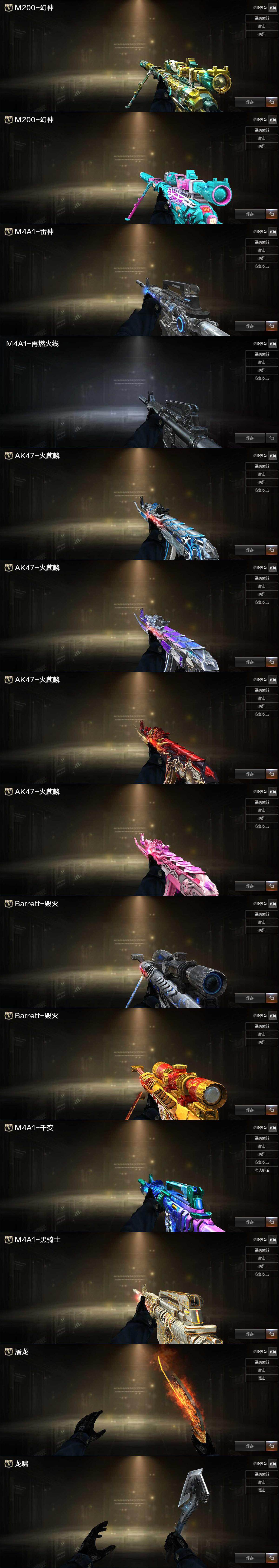 【音效卡】:M200-幻神音效卡,AK47-火麒麟音效卡,M4A1-黑骑士音效卡,Barrett-碧霄极光音效卡,炼狱