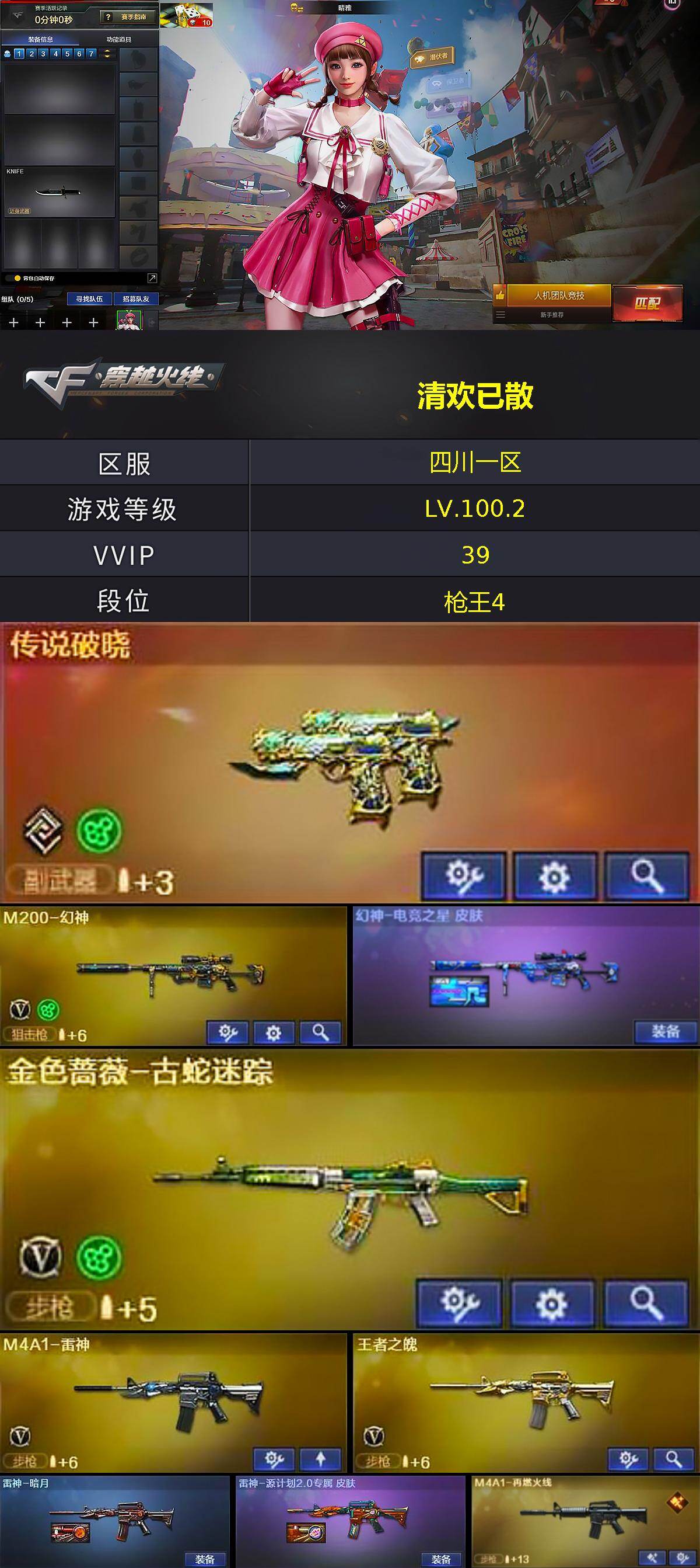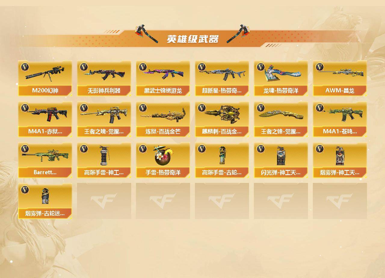 【热门武器】:传说破晓,M200-幻神,金色蔷薇-古蛇迷踪,修罗-古蛇迷踪,QBZ03-街机,M4A1-黑骑士,金色蔷薇-空