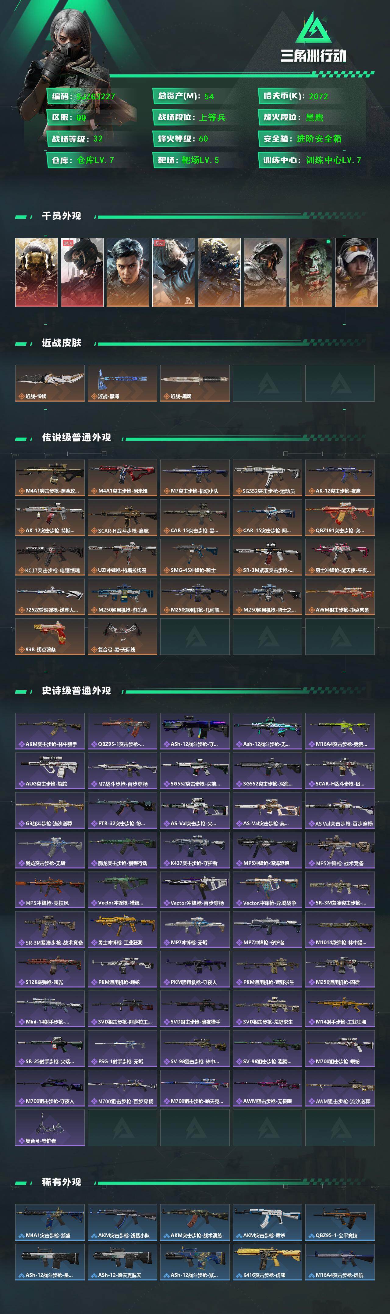 【SJZG3227】总资产(M):54M/哈夫币(K):2072K/哈夫币(K):2072K/传说枪皮数:22/全面战场等级:32_段位:上等兵/烽火地带等级:60_段位:黑鹰/红狼-蚀金玫瑰/露娜-黑·天际线/威龙-飞虎/蜂医-送葬人·无题密令/无名-夜鹰/深蓝-不破誓约/红狼-电锯惊魂/露娜-金牌射手/近战-怜悯/近战-黑海/近战-黑鹰/M4A1突击步枪-蚀金玫瑰/M4A1突击步枪-阿米娅/M7战斗步枪-机动小队/SG552突击步枪-运动员/AK-12突击步枪-夜鹰/AK-12突击步枪-特斯