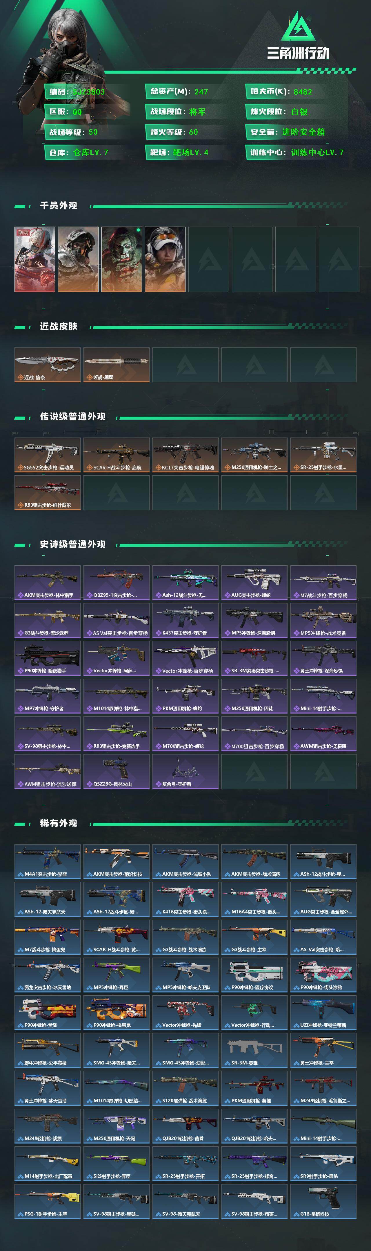 【SJZ3803】总资产(M):247M/哈夫币(K):8482K/哈夫币(K):8482K/传说枪皮数:6/全面战场等级:50_段位:将军/烽火地带等级:60_段位:白银/骇爪-维什戴尔/深蓝-不破誓约/红狼-电锯惊魂/露娜-金牌射手/近战-信条/近战-黑鹰/SG552突击步枪-运动员/SCAR-H战斗步枪-启航/KC17突击步枪-电锯惊魂/M250通用机枪-骑士之心/SR-25射手步枪-水墨云图/R93狙击步枪-维什戴尔/AKM突击步枪-林中猎手/QBZ95-1突击步枪-曙光/ASh-12战