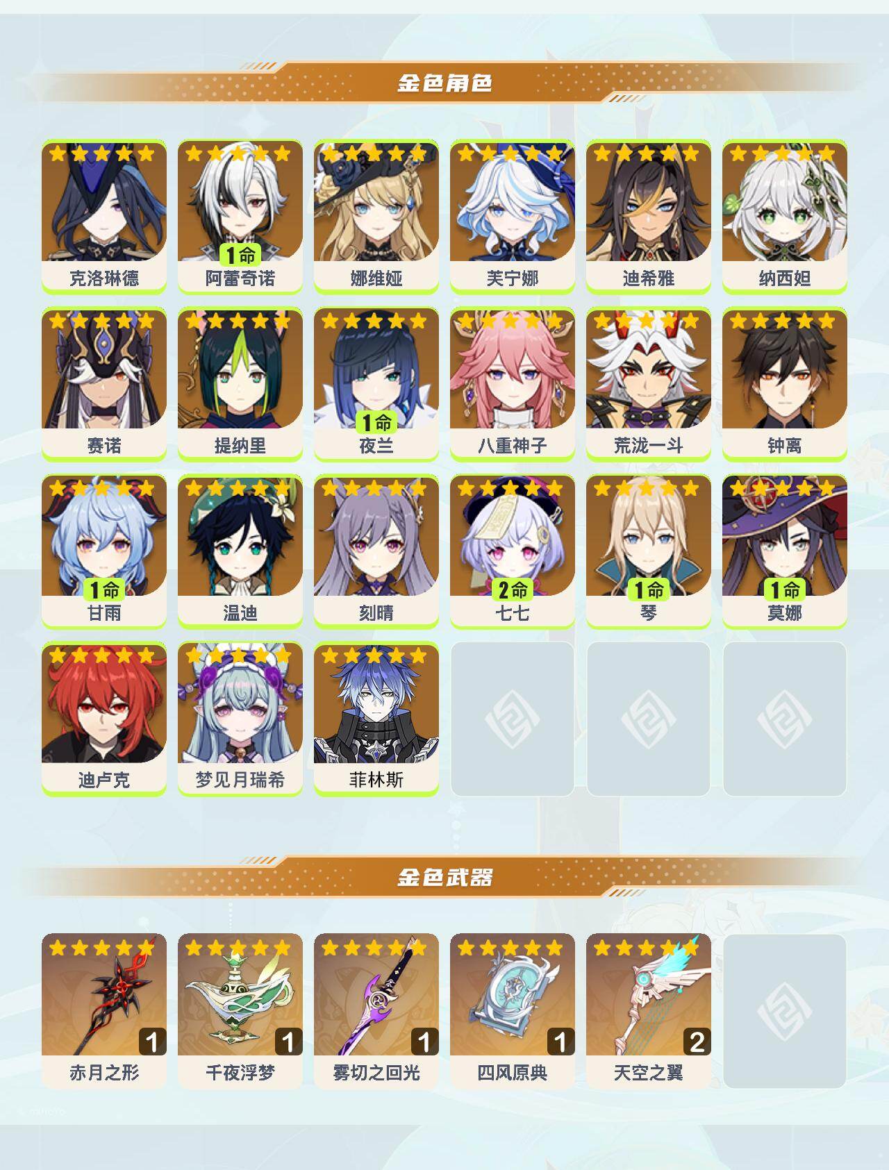 【YSX1542】58级/34黄/女主/21个五星角色/5个五星武器/0命菲林斯/八重神子/钟离/娜维娅/荒泷一斗/1命甘雨/克洛琳德/赛诺/纳西妲/芙宁娜/1命夜兰/1命阿蕾奇诺/迪卢克/温迪/1命莫娜/梦见月瑞希/刻晴/迪希雅/1命琴/2命七七/提纳里/精2天空之翼/千夜浮梦/四风原典/赤月之形/雾切之回光
