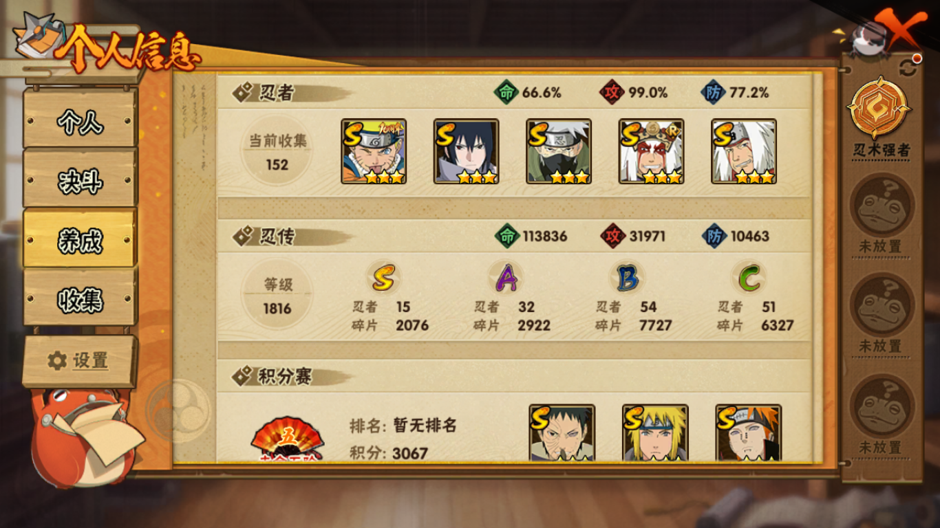 958w战力无影斑破面金水15S+298暴怒带土/盾狗32A+创柱碎片89个/桃式碎片75个