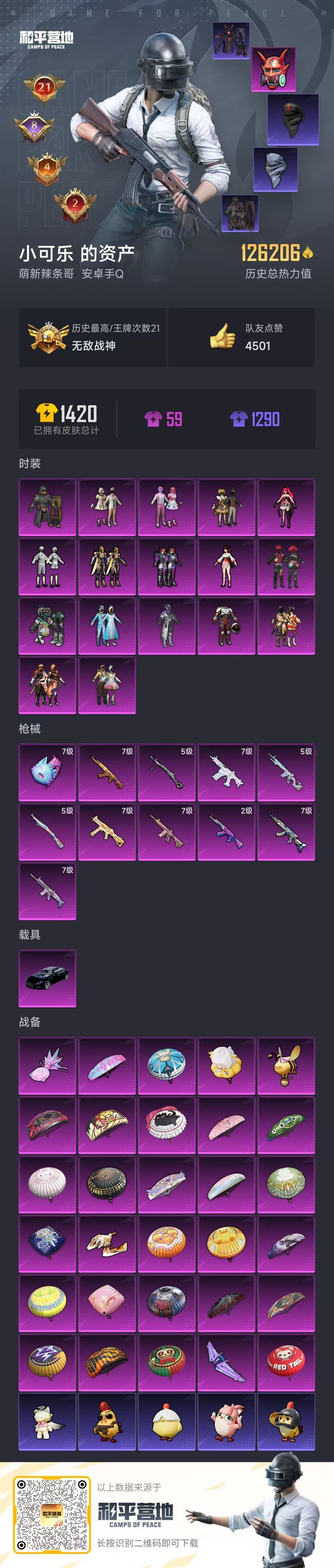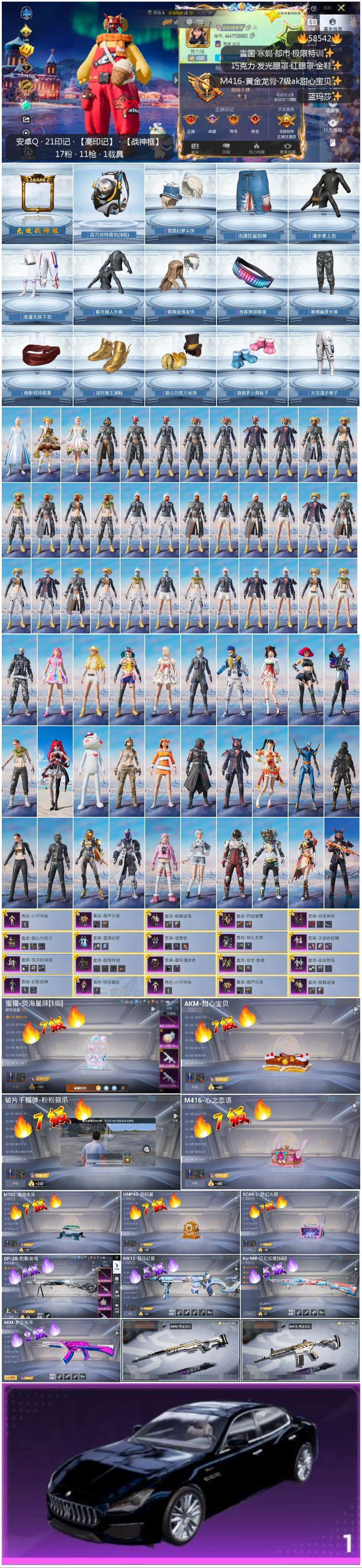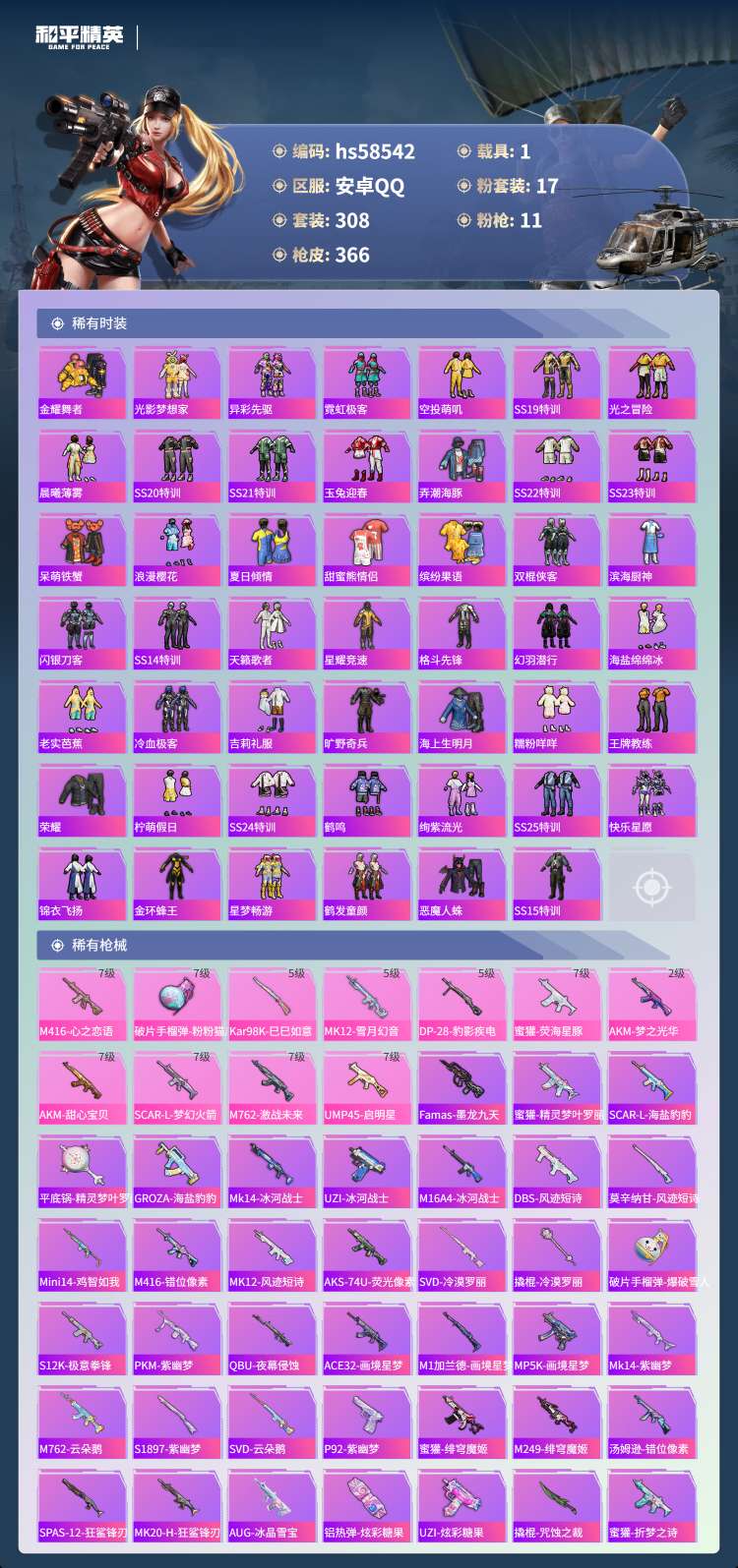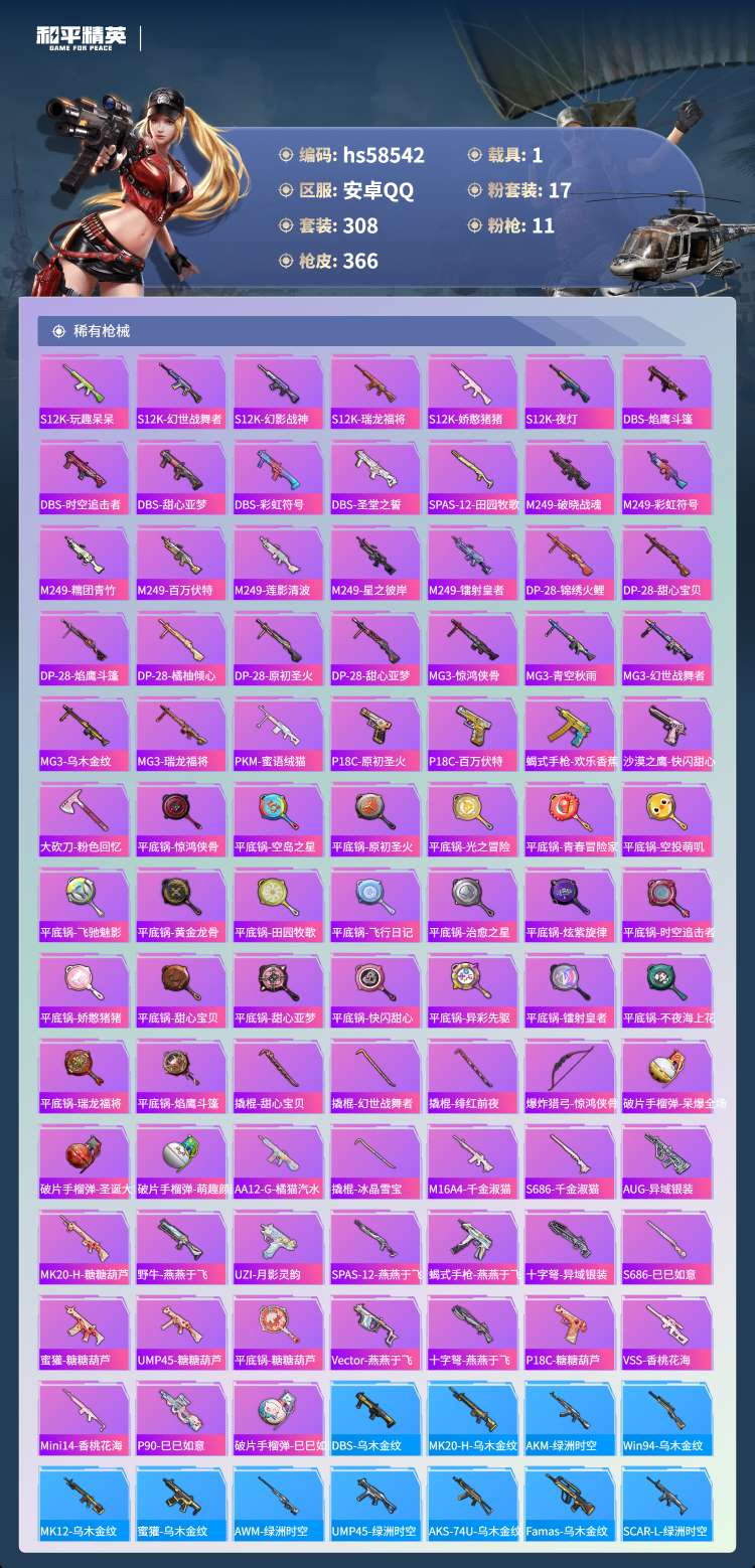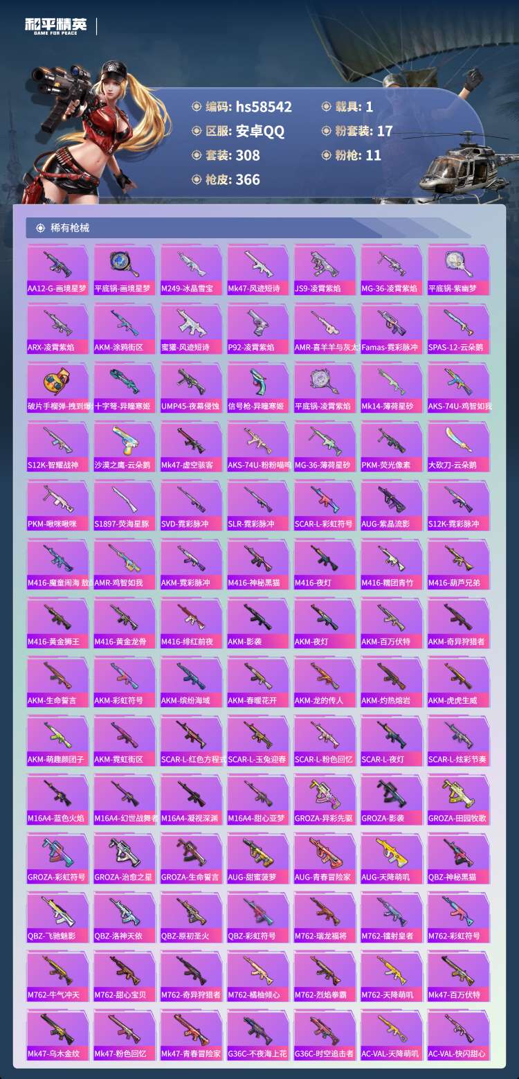 hs58542 安卓手Q-21王牌印记-有战神框-17粉装-11特效枪-1载具-126206热力值-