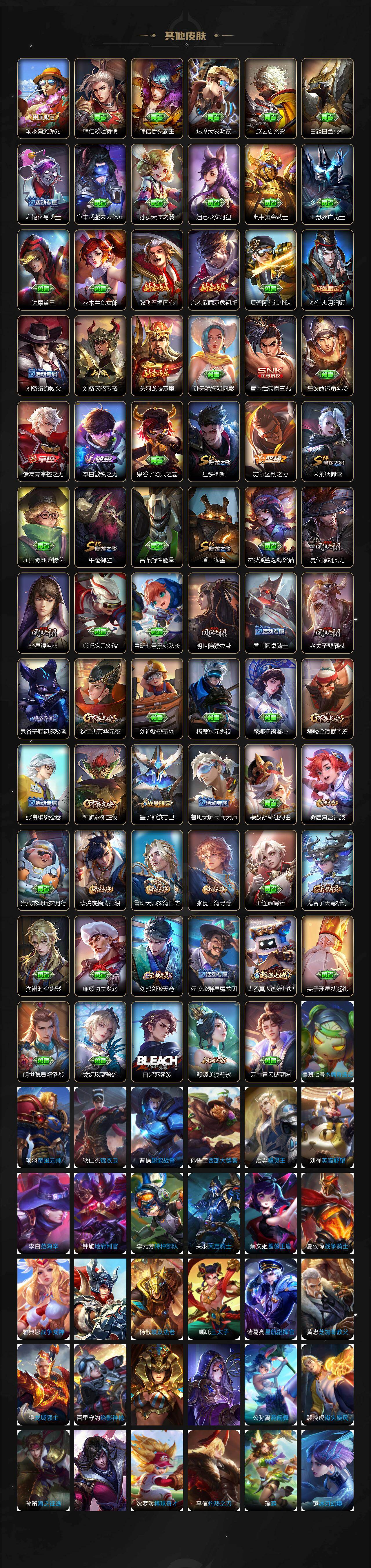 【限定皮肤】:狄仁杰阴阳师,赵云皇家上将,墨子神迹守卫,孙尚香蔷薇恋人,夏侯惇朔风刀,狄仁杰万华元夜,项羽海滩派对,老夫子醍醐杖,老夫子航海奇遇记,程咬金