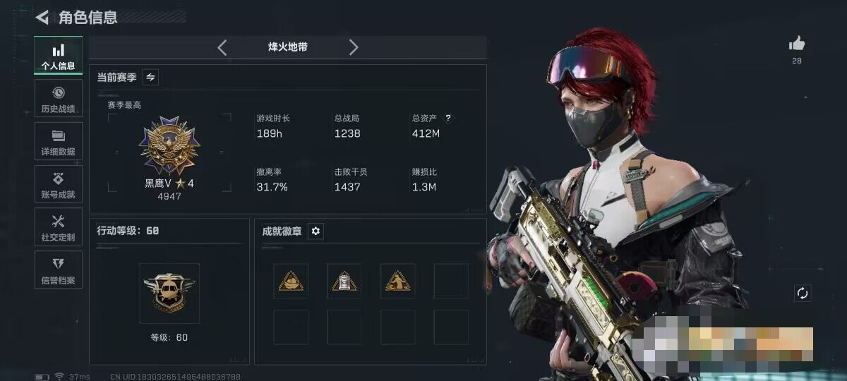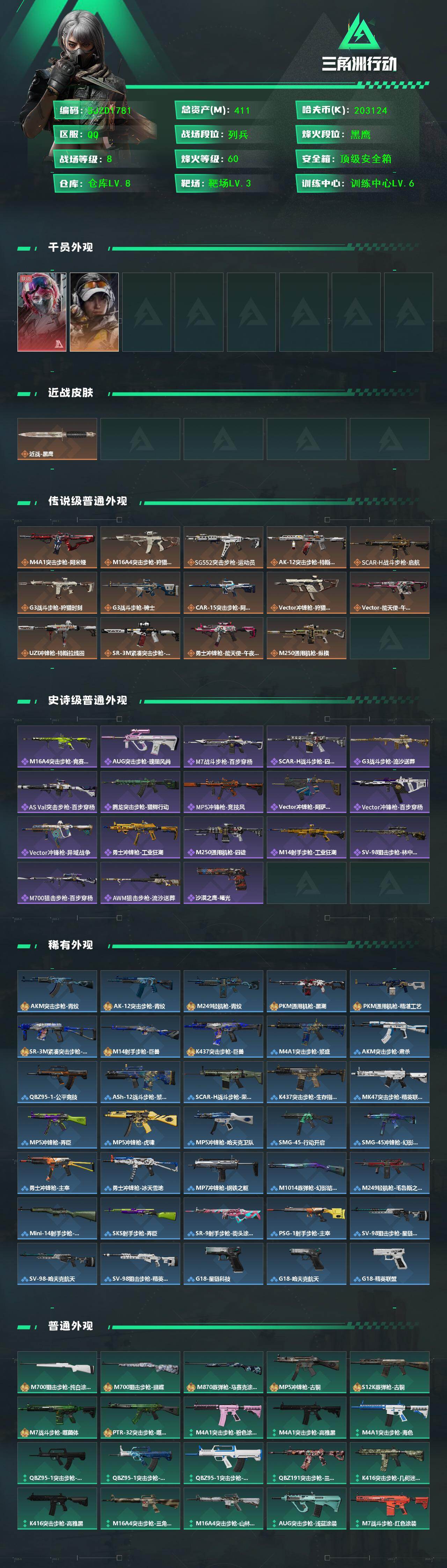 【SJZD1781】总资产(M):411M/哈夫币(K):203124K/哈夫币(K):203124K/传说枪皮数:14/全面战场等级:8_段位:列兵/烽火地带等级:60_段位:黑鹰/蛊-能天使午夜邮差/露娜-金牌射手/近战-黑鹰/M4A1突击步枪-阿米娅/M16A4突击步枪-狩猎时刻/SG552突击步枪-运动员/AK-12突击步枪-特斯拉线圈/SCAR-H战斗步枪-启航/G3战斗步枪-狩猎时刻/G3战斗步枪-骑士/CAR-15突击步枪-阿米娅/Vector冲锋枪-狩猎时刻/Vector冲锋枪-