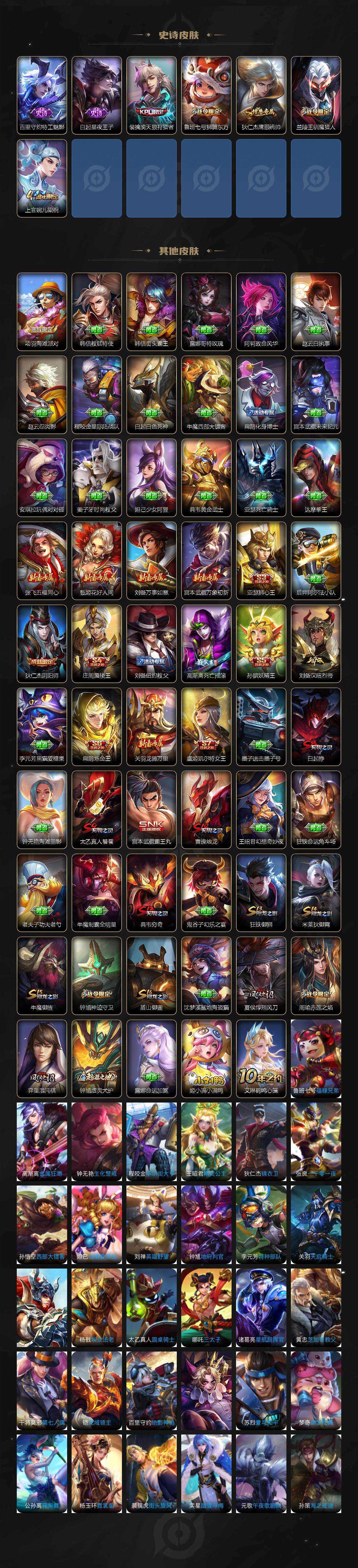 【限定皮肤】:白起狰,狄仁杰阴阳师,虞姬凯尔特女王,赵云皇家上将,赵云引擎之心,鲁班七号狮舞东方,庄周蜃楼王,高渐离死亡摇滚,钟无艳王者之锤,孙膑妖精王,扁鹊炼金王,周
