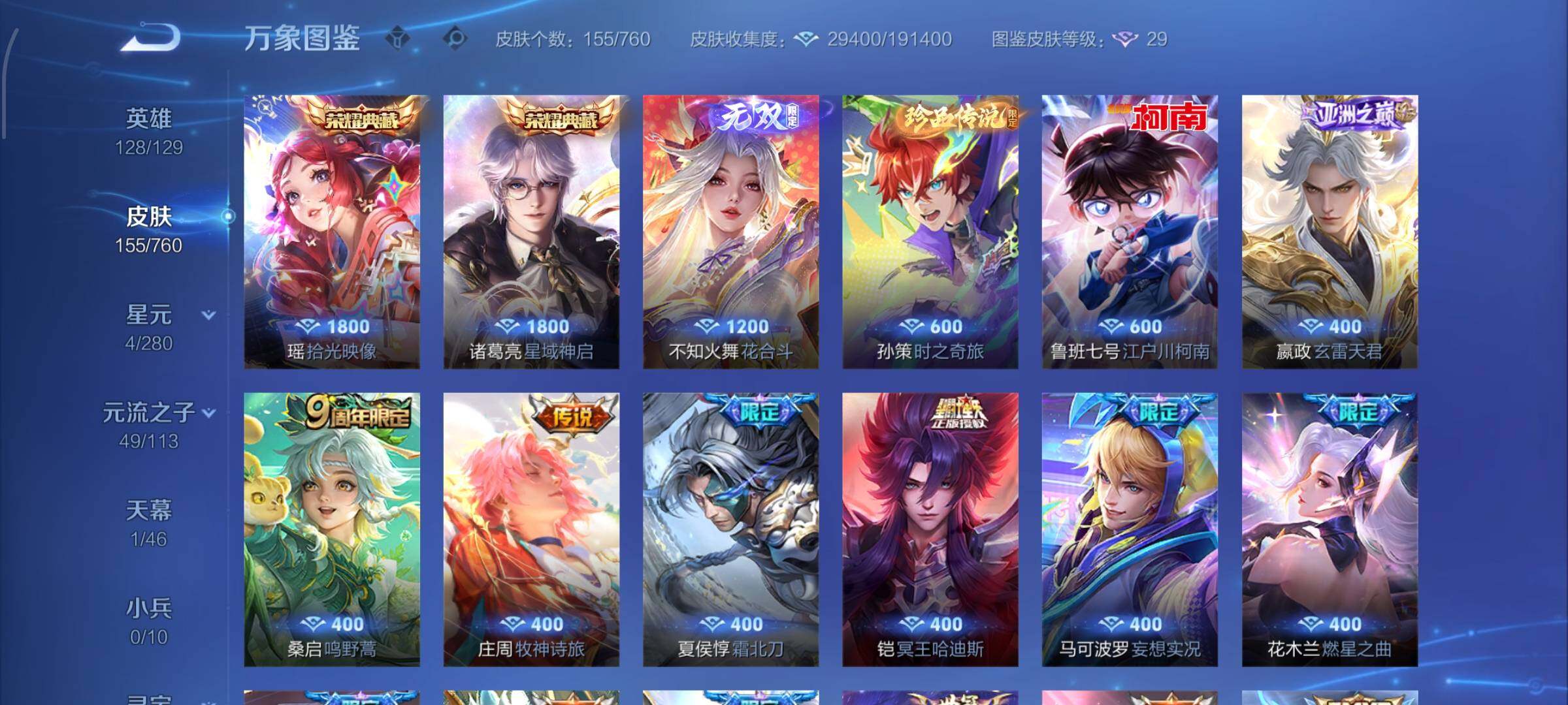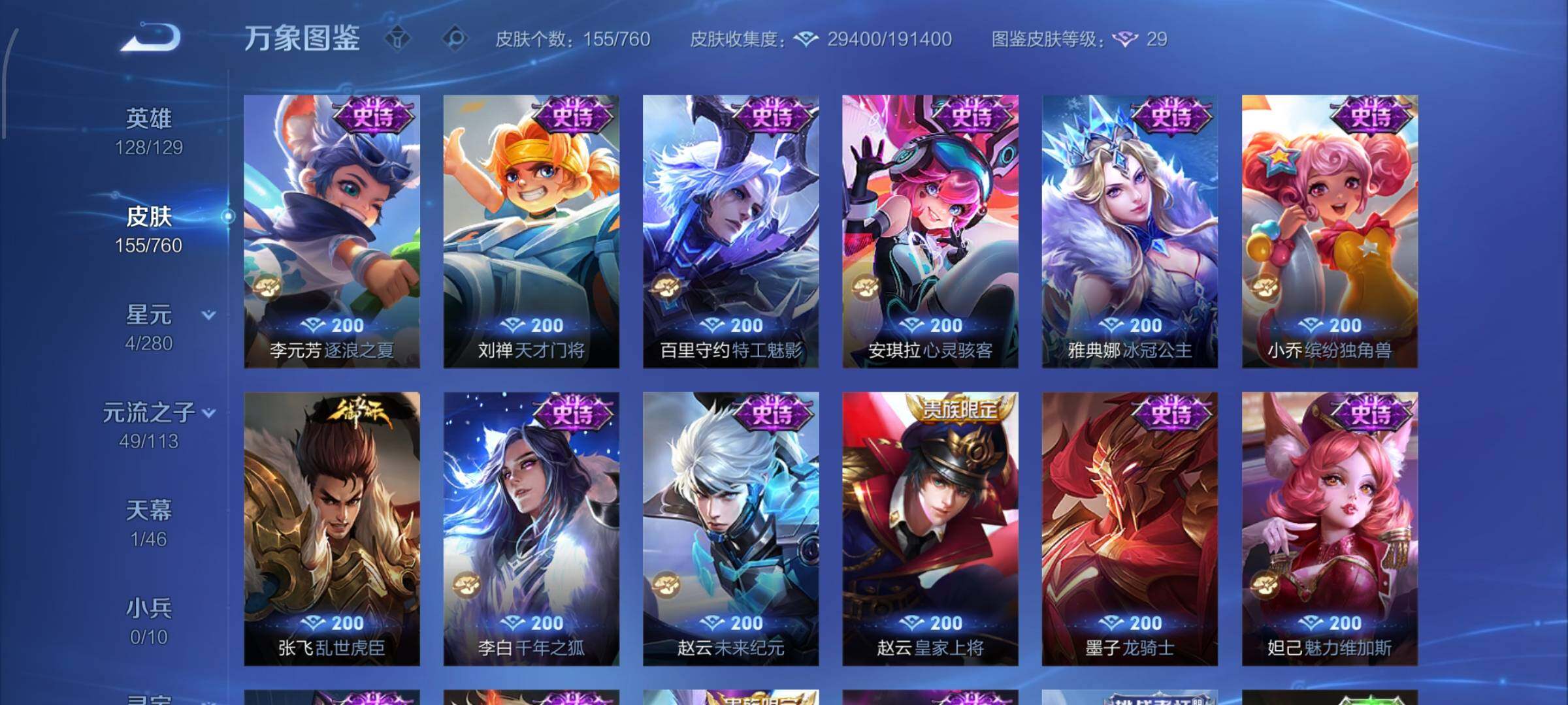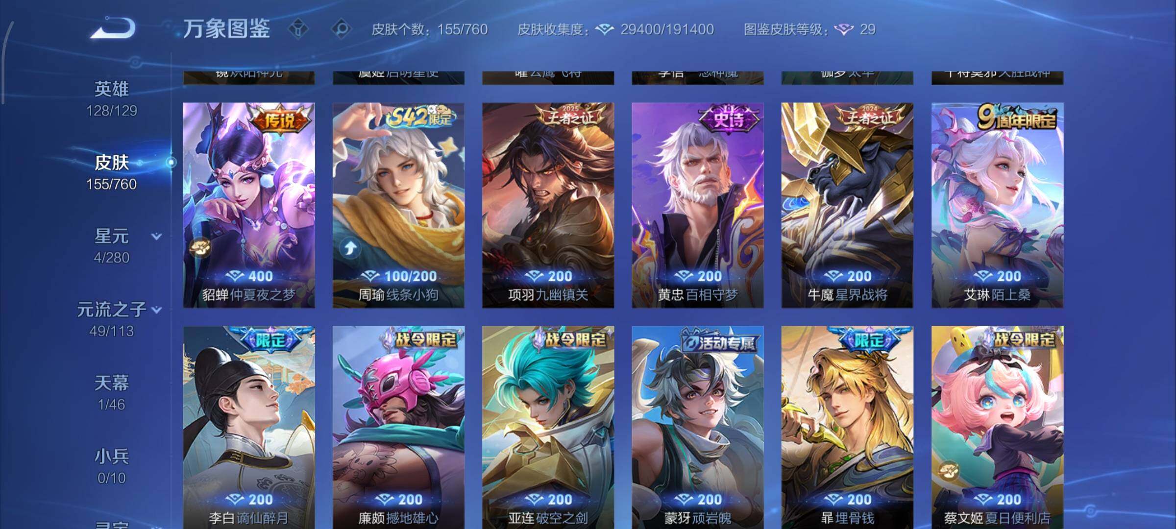 【高性价比·星域神启·瑶拾光映像·花合斗·鲁班柯南·孙策时之奇旅·太华红枫·金色貂蝉·墨染江湖天幕·牧神诗旅·霜北刀·妄想实况·燃星之曲·无尽星芒·异界灵契·可二次】YXw12629-安卓Q-128英雄-155皮肤-9王者印记-100铭文-贵族积分8w【贵族8】【2典藏·1无双·2珍品·2星传说·20传说·1天幕·11按键】【因赛季更新游戏段付以上号为准!】