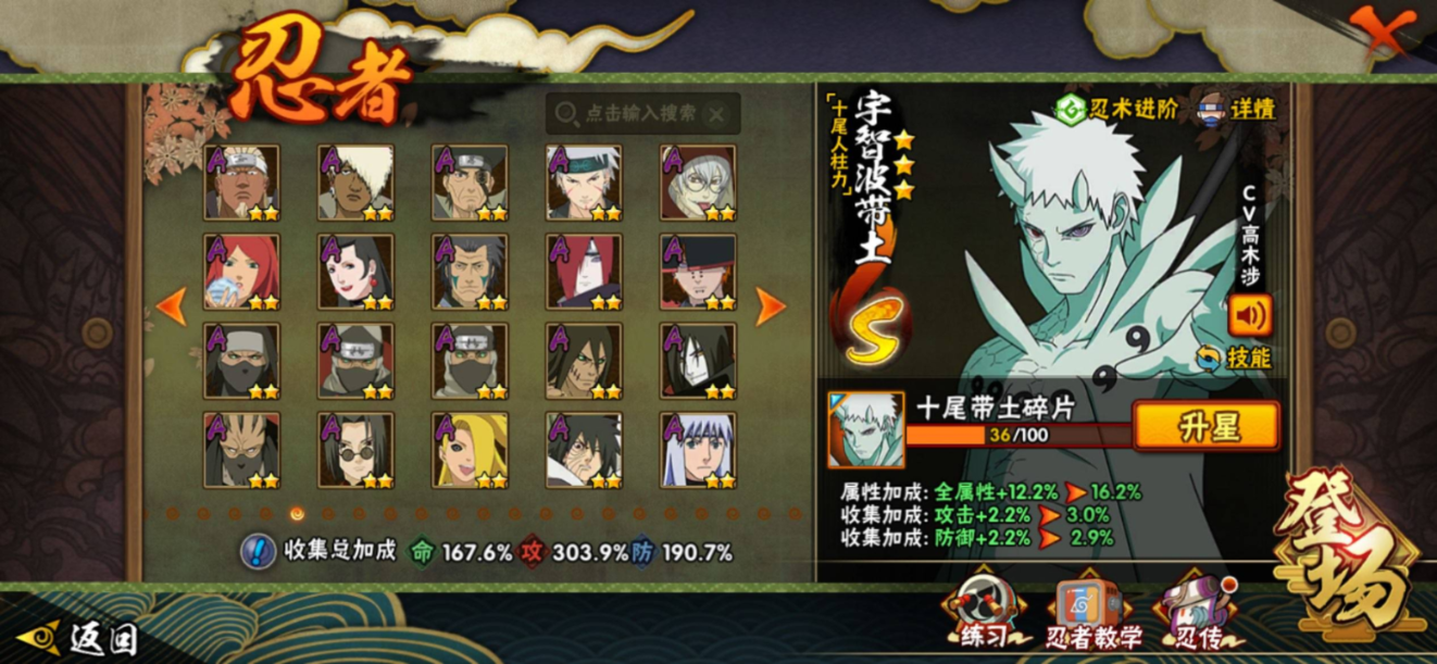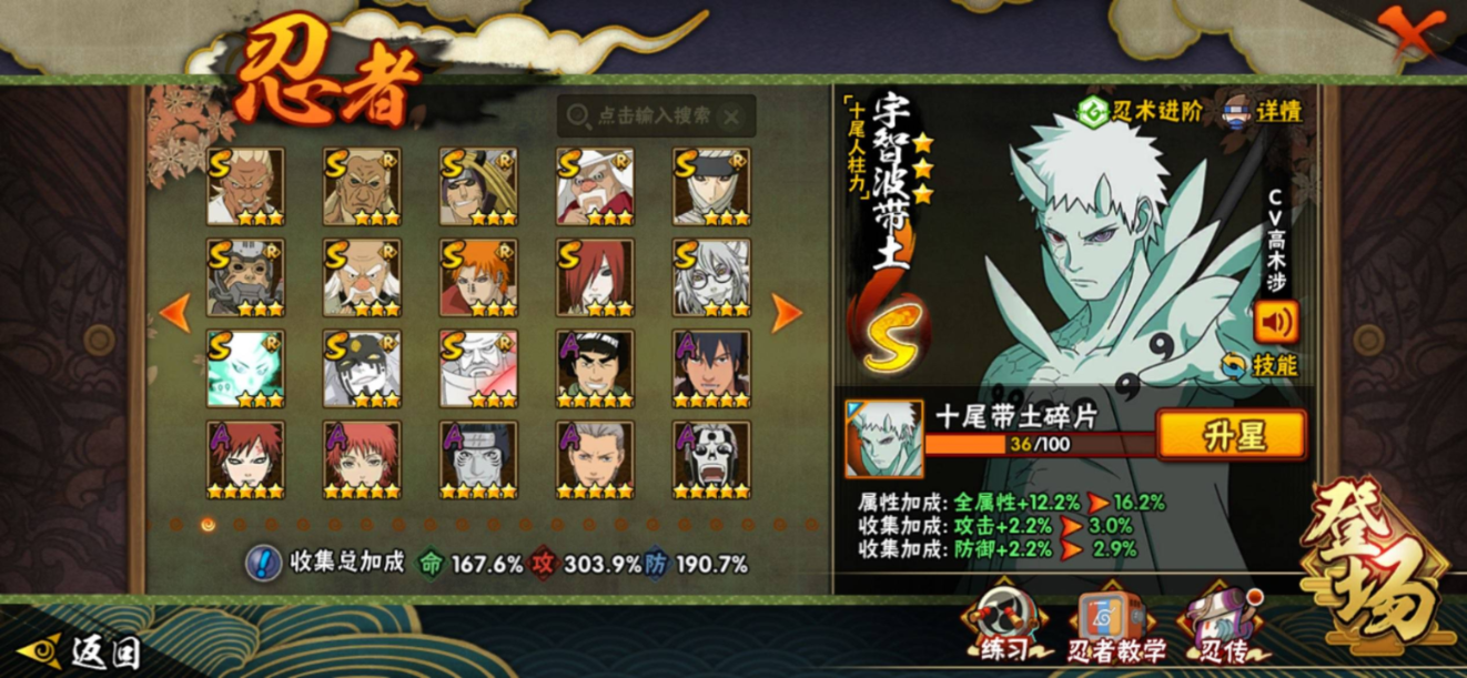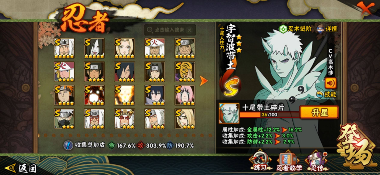 苹果qq/v13/极品号s忍者差三个就全了/二千七百万战力/S忍者数:53- A忍者数:71 198忍者7个/298忍者2个/【S级忍者】宇智波带土「忍界大战」(3星),宇智波斑「木叶创立」(3星),三代目风影「秽土转生」(3星),迈特凯「死门」(3星),大野木「忍界大战」(3星),旗木卡卡西「须佐能乎」(3星),自来也「传说中的三忍」(3星),大筒木舍人「最终章」(3星),漩涡鸣人「暴怒·第