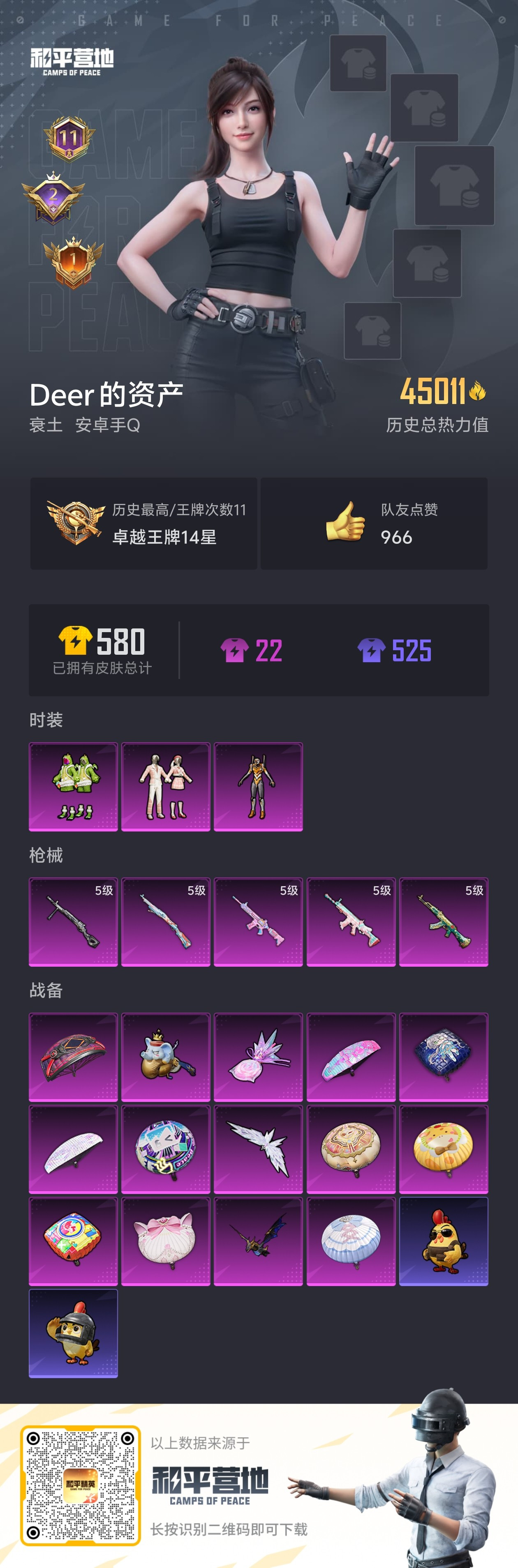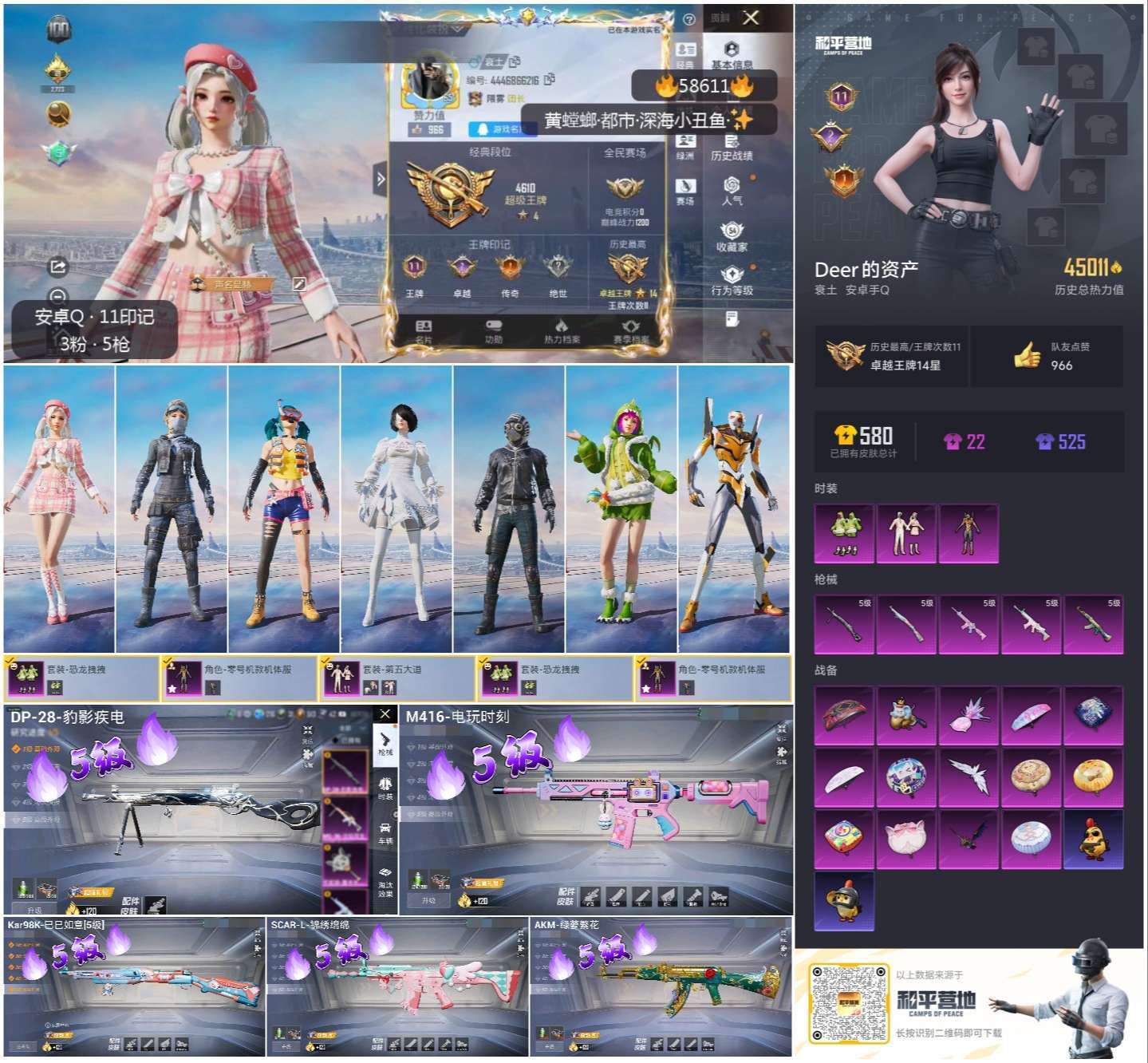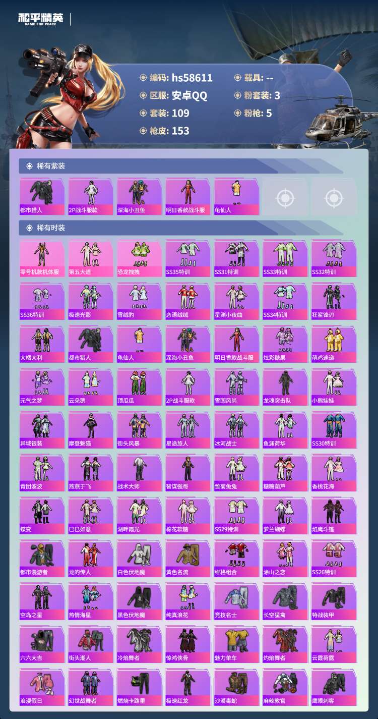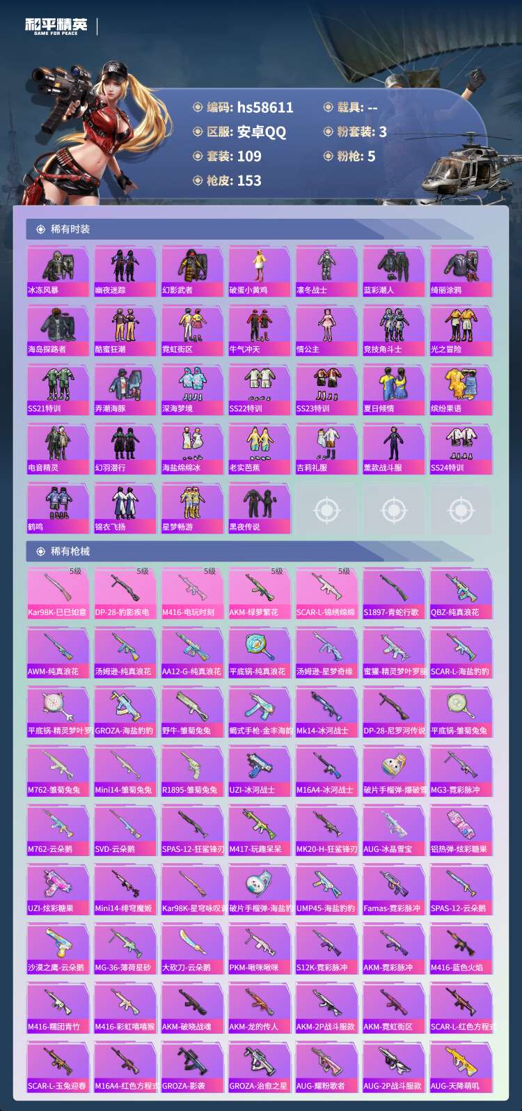 hs58611 安卓手Q-11王牌印记-3粉装-5特效枪-45011热力值-109套装-153枪皮-