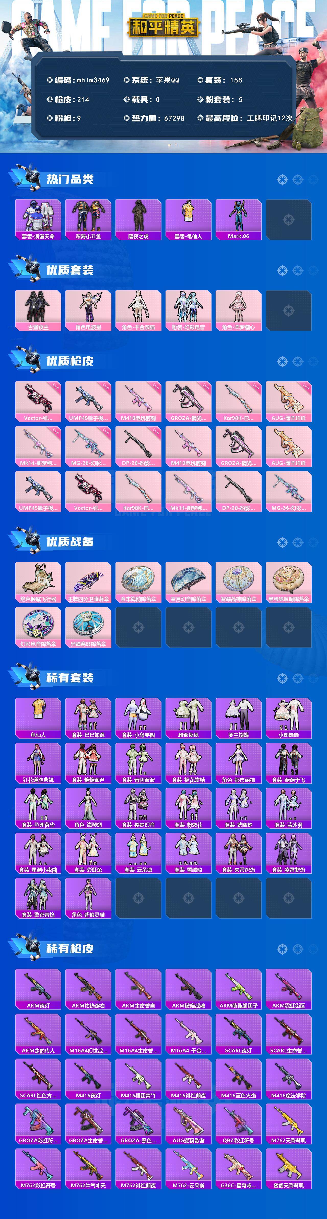 【mhlm3469】苹果 手Q-5粉装-9特效枪-0载具-2粉色飞行器-67298热力值-12王牌印记-158套装-214枪皮