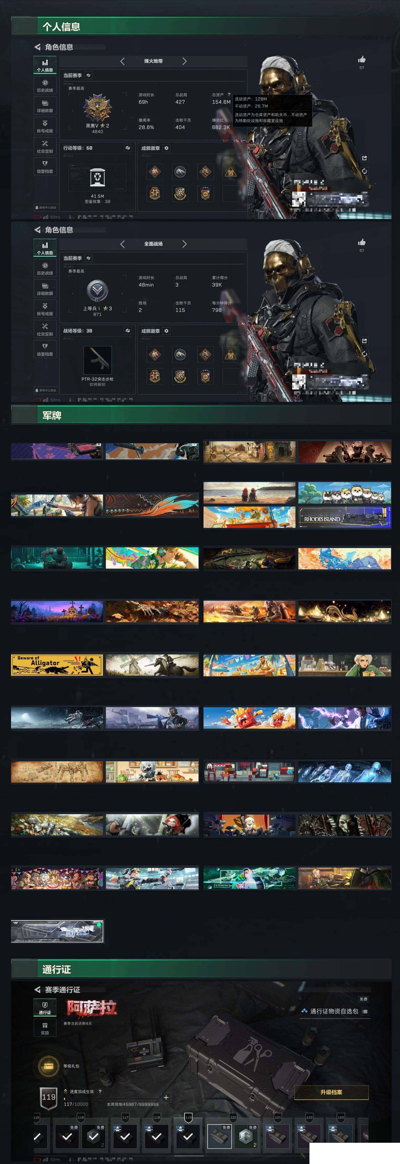 极品Am7+蚀金总资产154M 烽火地带段位: 黑鹰 全面战场段位: 上等兵 总资产: 154000000 哈夫币: 17000