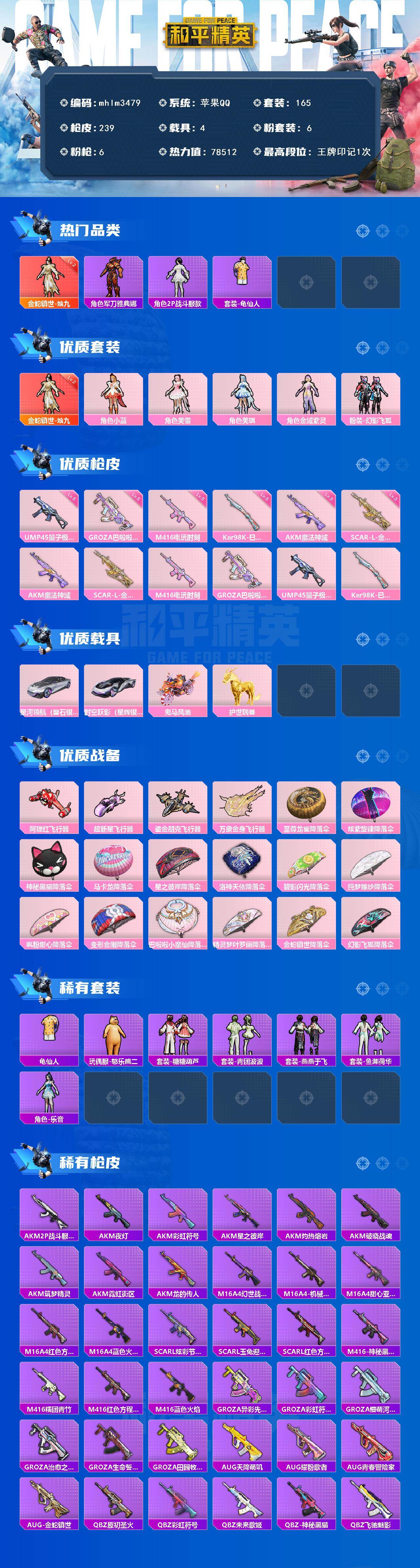 【mhlm3479】苹果 手Q-1神装-6粉装-6特效枪-4载具-4粉色飞行器-78512热力值-1王牌印记-165套装-239枪皮